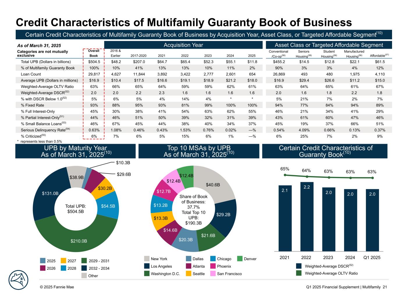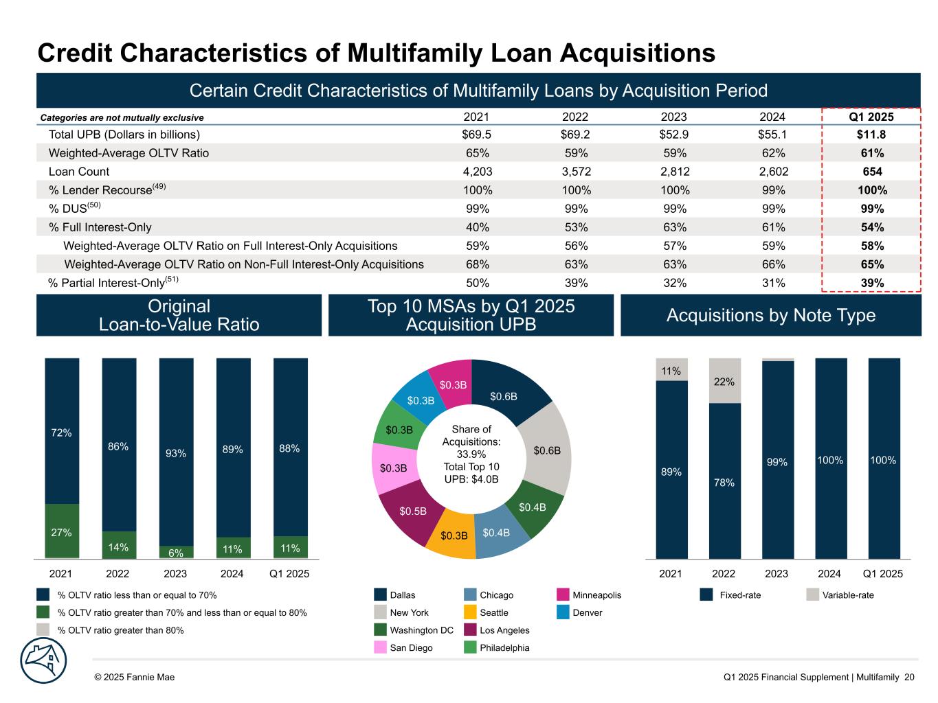 Q1 2025 Financial Supplement | Multifamily 20© 2025 Fannie Mae DRAFT 89% 78% 99% 100% 100% 11% 22% 2021 2022 2023 2024 Q1 2025 Credit Characteristics of Multifamily Loan Acquisitions Certain Credit Characteristics of Multifamily Loans by Acquisition Period Categories are not mutually exclusive 2021 2022 2023 2024 Q1 2025 Total UPB (Dollars in billions) $69.5 $69.2 $52.9 $55.1 $11.8 Weighted-Average OLTV Ratio 65% 59% 59% 62% 61% Loan Count 4,203 3,572 2,812 2,602 654 % Lender Recourse(49) 100% 100% 100% 99% 100% % DUS(50) 99% 99% 99% 99% 99% % Full Interest-Only 40% 53% 63% 61% 54% Weighted-Average OLTV Ratio on Full Interest-Only Acquisitions 59% 56% 57% 59% 58% Weighted-Average OLTV Ratio on Non-Full Interest-Only Acquisitions 68% 63% 63% 66% 65% % Partial Interest-Only(51) 50% 39% 32% 31% 39% 27% 14% 6% 11% 11% 72% 86% 93% 89% 88% 2021 2022 2023 2024 Q1 2025 $0.6B $0.6B $0.4B $0.4B$0.3B $0.5B $0.3B $0.3B $0.3B $0.3B Share of Acquisitions: 33.9% Total Top 10 UPB: $4.0B Original Loan-to-Value Ratio Top 10 MSAs by Q1 2025 Acquisition UPB Acquisitions by Note Type % OLTV ratio less than or equal to 70% % OLTV ratio greater than 70% and less than or equal to 80% % OLTV ratio greater than 80% Fixed-rate Variable-rateDallas Chicago Minneapolis New York Seattle Denver Washington DC Los Angeles San Diego Philadelphia