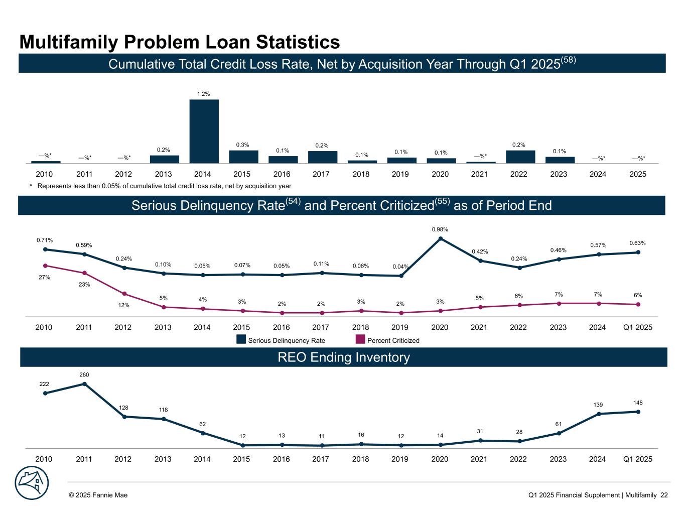 Q1 2025 Financial Supplement | Multifamily 22© 2025 Fannie Mae DRAFT 0.71% 0.59% 0.24% 0.10% 0.05% 0.07% 0.05% 0.11% 0.06% 0.04% 0.98% 0.42% 0.24% 0.46% 0.57% 0.63% 27% 23% 12% 5% 4% 3% 2% 2% 3% 2% 3% 5% 6% 7% 7% 6% 2010 2011 2012 2013 2014 2015 2016 2017 2018 2019 2020 2021 2022 2023 2024 Q1 2025 Multifamily Problem Loan Statistics —%* —%* —%* 0.2% 1.2% 0.3% 0.1% 0.2% 0.1% 0.1% 0.1% —%* 0.2% 0.1% —%* —%* 2010 2011 2012 2013 2014 2015 2016 2017 2018 2019 2020 2021 2022 2023 2024 2025 Serious Delinquency Rate(54) and Percent Criticized(55) as of Period End Cumulative Total Credit Loss Rate, Net by Acquisition Year Through Q1 2025(58) * Represents less than 0.05% of cumulative total credit loss rate, net by acquisition year 222 260 128 118 62 12 13 11 16 12 14 31 28 61 139 148 2010 2011 2012 2013 2014 2015 2016 2017 2018 2019 2020 2021 2022 2023 2024 Q1 2025 REO Ending Inventory Serious Delinquency Rate Percent Criticized