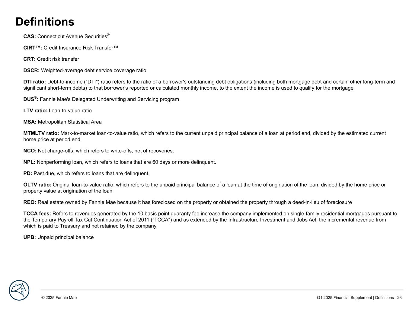 Q1 2025 Financial Supplement | Definitions 23© 2025 Fannie Mae DRAFT CAS: Connecticut Avenue Securities® CIRT™: Credit Insurance Risk Transfer™ CRT: Credit risk transfer DSCR: Weighted-average debt service coverage ratio DTI ratio: Debt-to-income ("DTI") ratio refers to the ratio of a borrower's outstanding debt obligations (including both mortgage debt and certain other long-term and significant short-term debts) to that borrower's reported or calculated monthly income, to the extent the income is used to qualify for the mortgage DUS®: Fannie Mae's Delegated Underwriting and Servicing program LTV ratio: Loan-to-value ratio MSA: Metropolitan Statistical Area MTMLTV ratio: Mark-to-market loan-to-value ratio, which refers to the current unpaid principal balance of a loan at period end, divided by the estimated current home price at period end NCO: Net charge-offs, which refers to write-offs, net of recoveries. NPL: Nonperforming loan, which refers to loans that are 60 days or more delinquent. PD: Past due, which refers to loans that are delinquent. OLTV ratio: Original loan-to-value ratio, which refers to the unpaid principal balance of a loan at the time of origination of the loan, divided by the home price or property value at origination of the loan REO: Real estate owned by Fannie Mae because it has foreclosed on the property or obtained the property through a deed-in-lieu of foreclosure TCCA fees: Refers to revenues generated by the 10 basis point guaranty fee increase the company implemented on single-family residential mortgages pursuant to the Temporary Payroll Tax Cut Continuation Act of 2011 ("TCCA") and as extended by the Infrastructure Investment and Jobs Act, the incremental revenue from which is paid to Treasury and not retained by the company UPB: Unpaid principal balance Definitions