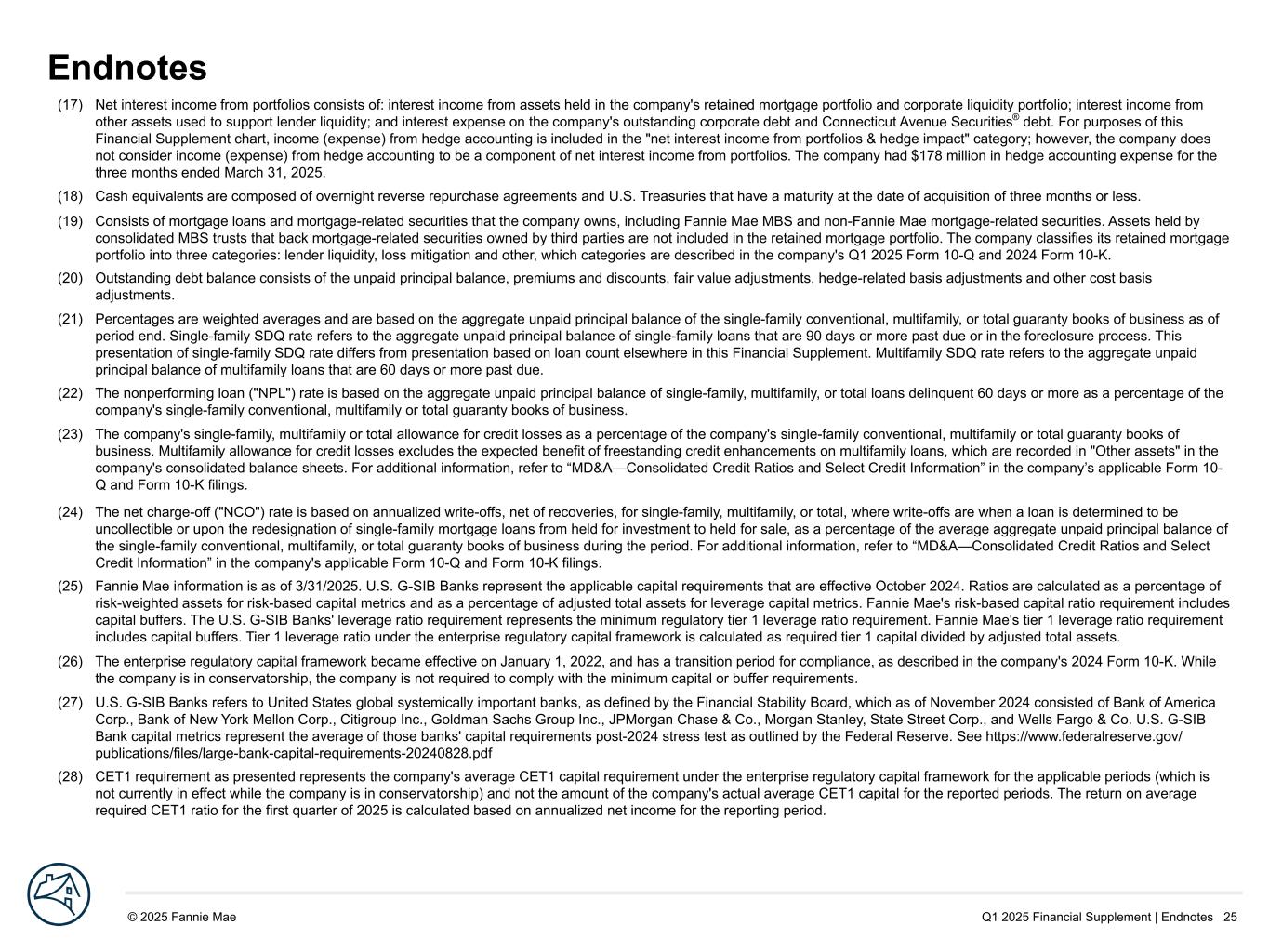 Q1 2025 Financial Supplement | Endnotes 25© 2025 Fannie Mae DRAFT Endnotes (17) Net interest income from portfolios consists of: interest income from assets held in the company's retained mortgage portfolio and corporate liquidity portfolio; interest income from other assets used to support lender liquidity; and interest expense on the company's outstanding corporate debt and Connecticut Avenue Securities® debt. For purposes of this Financial Supplement chart, income (expense) from hedge accounting is included in the "net interest income from portfolios & hedge impact" category; however, the company does not consider income (expense) from hedge accounting to be a component of net interest income from portfolios. The company had $178 million in hedge accounting expense for the three months ended March 31, 2025. (18) Cash equivalents are composed of overnight reverse repurchase agreements and U.S. Treasuries that have a maturity at the date of acquisition of three months or less. (19) Consists of mortgage loans and mortgage-related securities that the company owns, including Fannie Mae MBS and non-Fannie Mae mortgage-related securities. Assets held by consolidated MBS trusts that back mortgage-related securities owned by third parties are not included in the retained mortgage portfolio. The company classifies its retained mortgage portfolio into three categories: lender liquidity, loss mitigation and other, which categories are described in the company's Q1 2025 Form 10-Q and 2024 Form 10-K. (20) Outstanding debt balance consists of the unpaid principal balance, premiums and discounts, fair value adjustments, hedge-related basis adjustments and other cost basis adjustments. (21) Percentages are weighted averages and are based on the aggregate unpaid principal balance of the single-family conventional, multifamily, or total guaranty books of business as of period end. Single-family SDQ rate refers to the aggregate unpaid principal balance of single-family loans that are 90 days or more past due or in the foreclosure process. This presentation of single-family SDQ rate differs from presentation based on loan count elsewhere in this Financial Supplement. Multifamily SDQ rate refers to the aggregate unpaid principal balance of multifamily loans that are 60 days or more past due. (22) The nonperforming loan ("NPL") rate is based on the aggregate unpaid principal balance of single-family, multifamily, or total loans delinquent 60 days or more as a percentage of the company's single-family conventional, multifamily or total guaranty books of business. (23) The company's single-family, multifamily or total allowance for credit losses as a percentage of the company's single-family conventional, multifamily or total guaranty books of business. Multifamily allowance for credit losses excludes the expected benefit of freestanding credit enhancements on multifamily loans, which are recorded in "Other assets" in the company's consolidated balance sheets. For additional information, refer to “MD&A—Consolidated Credit Ratios and Select Credit Information” in the company’s applicable Form 10- Q and Form 10-K filings. (24) The net charge-off ("NCO") rate is based on annualized write-offs, net of recoveries, for single-family, multifamily, or total, where write-offs are when a loan is determined to be uncollectible or upon the redesignation of single-family mortgage loans from held for investment to held for sale, as a percentage of the average aggregate unpaid principal balance of the single-family conventional, multifamily, or total guaranty books of business during the period. For additional information, refer to “MD&A—Consolidated Credit Ratios and Select Credit Information” in the company's applicable Form 10-Q and Form 10-K filings. (25) Fannie Mae information is as of 3/31/2025. U.S. G-SIB Banks represent the applicable capital requirements that are effective October 2024. Ratios are calculated as a percentage of risk-weighted assets for risk-based capital metrics and as a percentage of adjusted total assets for leverage capital metrics. Fannie Mae's risk-based capital ratio requirement includes capital buffers. The U.S. G-SIB Banks' leverage ratio requirement represents the minimum regulatory tier 1 leverage ratio requirement. Fannie Mae's tier 1 leverage ratio requirement includes capital buffers. Tier 1 leverage ratio under the enterprise regulatory capital framework is calculated as required tier 1 capital divided by adjusted total assets. (26) The enterprise regulatory capital framework became effective on January 1, 2022, and has a transition period for compliance, as described in the company's 2024 Form 10-K. While the company is in conservatorship, the company is not required to comply with the minimum capital or buffer requirements. (27) U.S. G-SIB Banks refers to United States global systemically important banks, as defined by the Financial Stability Board, which as of November 2024 consisted of Bank of America Corp., Bank of New York Mellon Corp., Citigroup Inc., Goldman Sachs Group Inc., JPMorgan Chase & Co., Morgan Stanley, State Street Corp., and Wells Fargo & Co. U.S. G-SIB Bank capital metrics represent the average of those banks' capital requirements post-2024 stress test as outlined by the Federal Reserve. See https://www.federalreserve.gov/ publications/files/large-bank-capital-requirements-20240828.pdf (28) CET1 requirement as presented represents the company's average CET1 capital requirement under the enterprise regulatory capital framework for the applicable periods (which is not currently in effect while the company is in conservatorship) and not the amount of the company's actual average CET1 capital for the reported periods. The return on average required CET1 ratio for the first quarter of 2025 is calculated based on annualized net income for the reporting period.