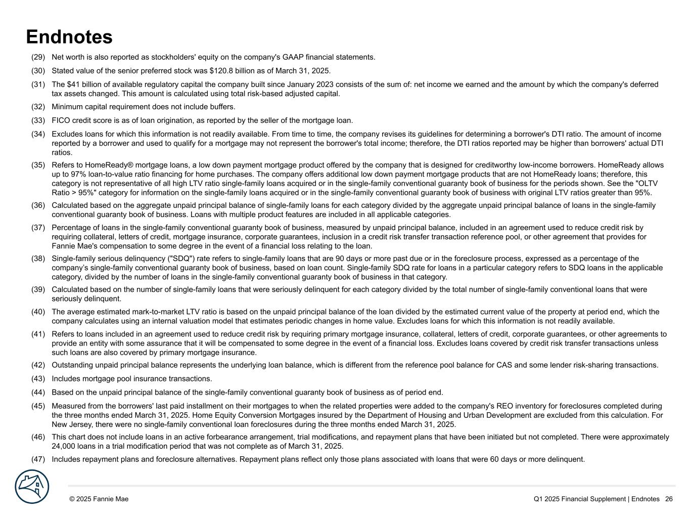 Q1 2025 Financial Supplement | Endnotes 26© 2025 Fannie Mae DRAFT Endnotes (29) Net worth is also reported as stockholders' equity on the company's GAAP financial statements. (30) Stated value of the senior preferred stock was $120.8 billion as of March 31, 2025. (31) The $41 billion of available regulatory capital the company built since January 2023 consists of the sum of: net income we earned and the amount by which the company's deferred tax assets changed. This amount is calculated using total risk-based adjusted capital. (32) Minimum capital requirement does not include buffers. (33) FICO credit score is as of loan origination, as reported by the seller of the mortgage loan. (34) Excludes loans for which this information is not readily available. From time to time, the company revises its guidelines for determining a borrower's DTI ratio. The amount of income reported by a borrower and used to qualify for a mortgage may not represent the borrower's total income; therefore, the DTI ratios reported may be higher than borrowers' actual DTI ratios. (35) Refers to HomeReady® mortgage loans, a low down payment mortgage product offered by the company that is designed for creditworthy low-income borrowers. HomeReady allows up to 97% loan-to-value ratio financing for home purchases. The company offers additional low down payment mortgage products that are not HomeReady loans; therefore, this category is not representative of all high LTV ratio single-family loans acquired or in the single-family conventional guaranty book of business for the periods shown. See the "OLTV Ratio > 95%" category for information on the single-family loans acquired or in the single-family conventional guaranty book of business with original LTV ratios greater than 95%. (36) Calculated based on the aggregate unpaid principal balance of single-family loans for each category divided by the aggregate unpaid principal balance of loans in the single-family conventional guaranty book of business. Loans with multiple product features are included in all applicable categories. (37) Percentage of loans in the single-family conventional guaranty book of business, measured by unpaid principal balance, included in an agreement used to reduce credit risk by requiring collateral, letters of credit, mortgage insurance, corporate guarantees, inclusion in a credit risk transfer transaction reference pool, or other agreement that provides for Fannie Mae's compensation to some degree in the event of a financial loss relating to the loan. (38) Single-family serious delinquency ("SDQ") rate refers to single-family loans that are 90 days or more past due or in the foreclosure process, expressed as a percentage of the company’s single-family conventional guaranty book of business, based on loan count. Single-family SDQ rate for loans in a particular category refers to SDQ loans in the applicable category, divided by the number of loans in the single-family conventional guaranty book of business in that category. (39) Calculated based on the number of single-family loans that were seriously delinquent for each category divided by the total number of single-family conventional loans that were seriously delinquent. (40) The average estimated mark-to-market LTV ratio is based on the unpaid principal balance of the loan divided by the estimated current value of the property at period end, which the company calculates using an internal valuation model that estimates periodic changes in home value. Excludes loans for which this information is not readily available. (41) Refers to loans included in an agreement used to reduce credit risk by requiring primary mortgage insurance, collateral, letters of credit, corporate guarantees, or other agreements to provide an entity with some assurance that it will be compensated to some degree in the event of a financial loss. Excludes loans covered by credit risk transfer transactions unless such loans are also covered by primary mortgage insurance. (42) Outstanding unpaid principal balance represents the underlying loan balance, which is different from the reference pool balance for CAS and some lender risk-sharing transactions. (43) Includes mortgage pool insurance transactions. (44) Based on the unpaid principal balance of the single-family conventional guaranty book of business as of period end. (45) Measured from the borrowers' last paid installment on their mortgages to when the related properties were added to the company's REO inventory for foreclosures completed during the three months ended March 31, 2025. Home Equity Conversion Mortgages insured by the Department of Housing and Urban Development are excluded from this calculation. For New Jersey, there were no single-family conventional loan foreclosures during the three months ended March 31, 2025. (46) This chart does not include loans in an active forbearance arrangement, trial modifications, and repayment plans that have been initiated but not completed. There were approximately 24,000 loans in a trial modification period that was not complete as of March 31, 2025. (47) Includes repayment plans and foreclosure alternatives. Repayment plans reflect only those plans associated with loans that were 60 days or more delinquent.