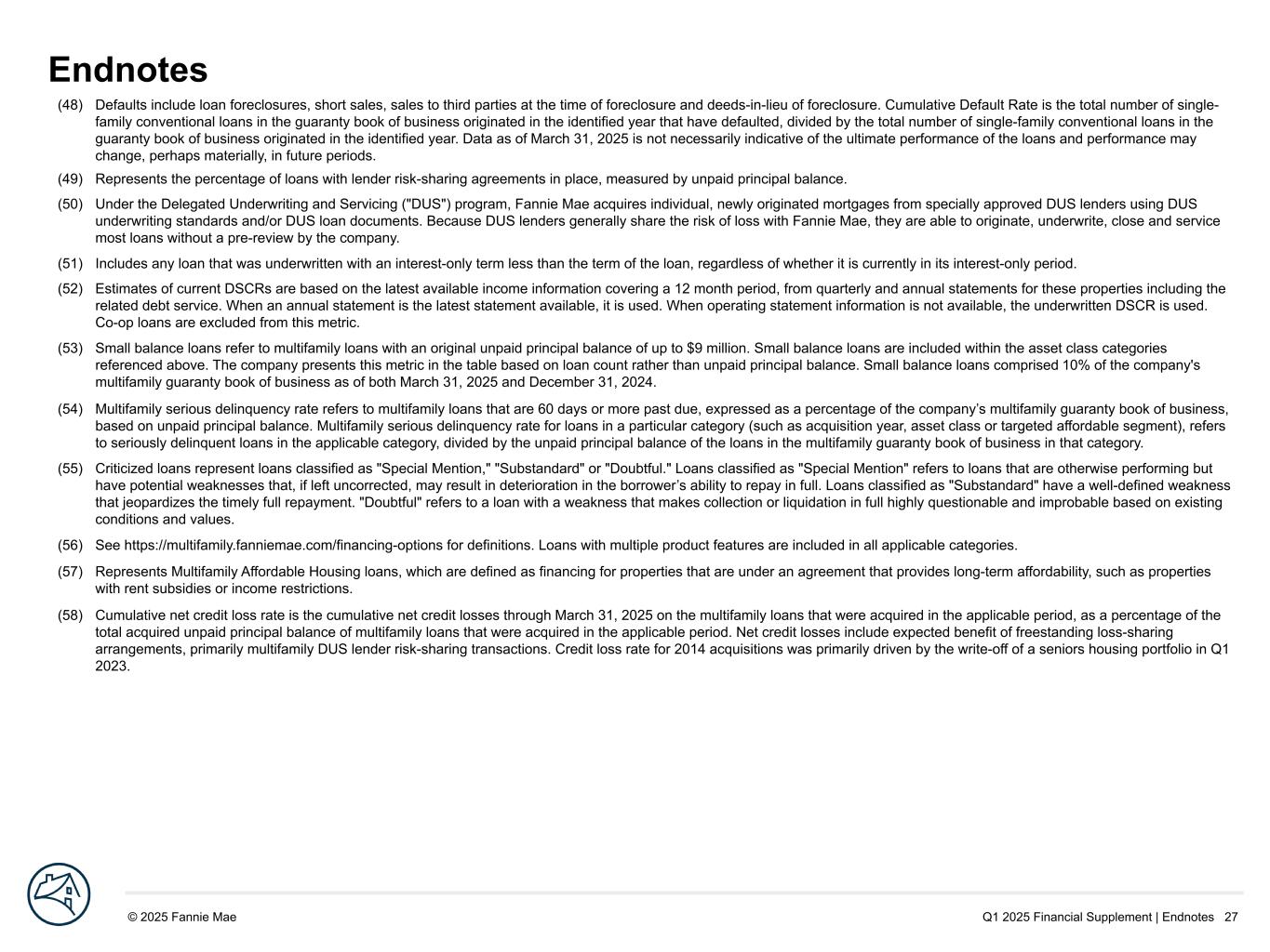 Q1 2025 Financial Supplement | Endnotes 27© 2025 Fannie Mae DRAFT Endnotes (48) Defaults include loan foreclosures, short sales, sales to third parties at the time of foreclosure and deeds-in-lieu of foreclosure. Cumulative Default Rate is the total number of single- family conventional loans in the guaranty book of business originated in the identified year that have defaulted, divided by the total number of single-family conventional loans in the guaranty book of business originated in the identified year. Data as of March 31, 2025 is not necessarily indicative of the ultimate performance of the loans and performance may change, perhaps materially, in future periods. (49) Represents the percentage of loans with lender risk-sharing agreements in place, measured by unpaid principal balance. (50) Under the Delegated Underwriting and Servicing ("DUS") program, Fannie Mae acquires individual, newly originated mortgages from specially approved DUS lenders using DUS underwriting standards and/or DUS loan documents. Because DUS lenders generally share the risk of loss with Fannie Mae, they are able to originate, underwrite, close and service most loans without a pre-review by the company. (51) Includes any loan that was underwritten with an interest-only term less than the term of the loan, regardless of whether it is currently in its interest-only period. (52) Estimates of current DSCRs are based on the latest available income information covering a 12 month period, from quarterly and annual statements for these properties including the related debt service. When an annual statement is the latest statement available, it is used. When operating statement information is not available, the underwritten DSCR is used. Co-op loans are excluded from this metric. (53) Small balance loans refer to multifamily loans with an original unpaid principal balance of up to $9 million. Small balance loans are included within the asset class categories referenced above. The company presents this metric in the table based on loan count rather than unpaid principal balance. Small balance loans comprised 10% of the company's multifamily guaranty book of business as of both March 31, 2025 and December 31, 2024. (54) Multifamily serious delinquency rate refers to multifamily loans that are 60 days or more past due, expressed as a percentage of the company’s multifamily guaranty book of business, based on unpaid principal balance. Multifamily serious delinquency rate for loans in a particular category (such as acquisition year, asset class or targeted affordable segment), refers to seriously delinquent loans in the applicable category, divided by the unpaid principal balance of the loans in the multifamily guaranty book of business in that category. (55) Criticized loans represent loans classified as "Special Mention," "Substandard" or "Doubtful." Loans classified as "Special Mention" refers to loans that are otherwise performing but have potential weaknesses that, if left uncorrected, may result in deterioration in the borrower’s ability to repay in full. Loans classified as "Substandard" have a well-defined weakness that jeopardizes the timely full repayment. "Doubtful" refers to a loan with a weakness that makes collection or liquidation in full highly questionable and improbable based on existing conditions and values. (56) See https://multifamily.fanniemae.com/financing-options for definitions. Loans with multiple product features are included in all applicable categories. (57) Represents Multifamily Affordable Housing loans, which are defined as financing for properties that are under an agreement that provides long-term affordability, such as properties with rent subsidies or income restrictions. (58) Cumulative net credit loss rate is the cumulative net credit losses through March 31, 2025 on the multifamily loans that were acquired in the applicable period, as a percentage of the total acquired unpaid principal balance of multifamily loans that were acquired in the applicable period. Net credit losses include expected benefit of freestanding loss-sharing arrangements, primarily multifamily DUS lender risk-sharing transactions. Credit loss rate for 2014 acquisitions was primarily driven by the write-off of a seniors housing portfolio in Q1 2023.
