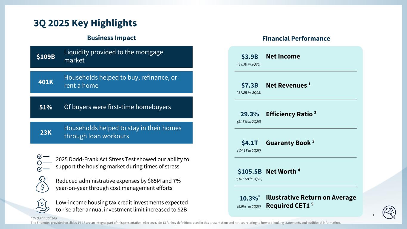 1 The Endnotes provided on slides 14-16 are an integral part of this presentation. Also see slide 13 for key definitions used in this presentation and notices relating to forward-looking statements and additional information. Special Colors #edebe9 #898989 #cff2f2 Categorical Color Palette #05314d #1c6fa3 #898989 #4d4d4d #5dc7d0 #c55422 #2c6937 Sequential Color Palette #121212 #05314d #085280 #1c6fa3 #509ed5 #98c6e6 Line graph Color Palette #c44786 (refrain from using) #085280 #5dc7d0 #898989 #e66e39 #418152 #ffb400 For callout boxes Use in rounded shape Low-income housing tax credit investments expected to rise after annual investment limit increased to $2B Households helped to stay in their homes through loan workouts 3Q 2025 Key Highlights Financial PerformanceBusiness Impact Page align Top align Bottom align Liquidity provided to the mortgage market Of buyers were first-time homebuyers 2025 Dodd-Frank Act Stress Test showed our ability to support the housing market during times of stress Net Income$109B 401K 51% 23K $3.9B $7.3B Net Revenues 1 $105.5B 29.3% $4.1T 10.3%* Households helped to buy, refinance, or rent a home Net Worth 4 Efficiency Ratio 2 Illustrative Return on Average Required CET1 5 Guaranty Book 3 (9.9% * in 2Q25) ( $7.2B in 2Q25) (31.5% in 2Q25) ( $4.1T in 2Q25) ($3.3B in 2Q25) ($101.6B in 2Q25) * YTD Annualized Reduced administrative expenses by $65M and 7% year-on-year through cost management efforts