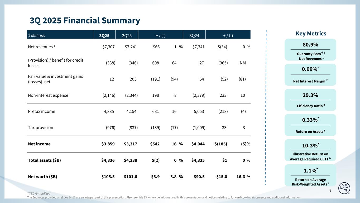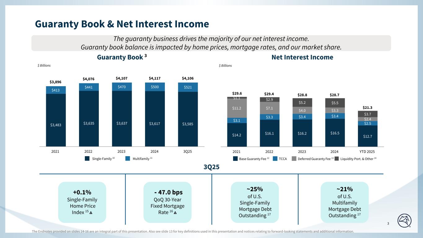 2 The Endnotes provided on slides 14-16 are an integral part of this presentation. Also see slide 13 for key definitions used in this presentation and notices relating to forward-looking statements and additional information. Special Colors #edebe9 #898989 #cff2f2 Categorical Color Palette #05314d #1c6fa3 #898989 #4d4d4d #5dc7d0 #c55422 #2c6937 Sequential Color Palette #121212 #05314d #085280 #1c6fa3 #509ed5 #98c6e6 Line graph Color Palette #c44786 (refrain from using) #085280 #5dc7d0 #898989 #e66e39 #418152 #ffb400 For callout boxes Use in rounded shape $ Millions 3Q25 2Q25 + / (-) 3Q24 + / (-) Net revenues 1 $7,307 $7,241 $66 1 % $7,341 $(34) 0 % (Provision) / benefit for credit losses (338) (946) 608 64 27 (365) NM Fair value & investment gains (losses), net 12 203 (191) (94) 64 (52) (81) Non-interest expense (2,146) (2,344) 198 8 (2,379) 233 10 Pretax income 4,835 4,154 681 16 5,053 (218) (4) Tax provision (976) (837) (139) (17) (1,009) 33 3 Net income $3,859 $3,317 $542 16 % $4,044 $(185) (5) % Total assets ($B) $4,336 $4,338 $(2) 0 % $4,335 $1 0 % Net worth ($B) $105.5 $101.6 $3.9 3.8 % $90.5 $15.0 16.6 % Key Metrics 3Q 2025 Financial Summary Page align Top align Bottom align Guaranty Fees 6 / Net Revenues 1 80.9% 0.66%* Net Interest Margin 7 29.3% Efficiency Ratio 2 0.33%* 10.3%* 1.1%* Illustrative Return on Average Required CET1 5 Return on Assets 8 Return on Average Risk-Weighted Assets 9 * YTD Annualized