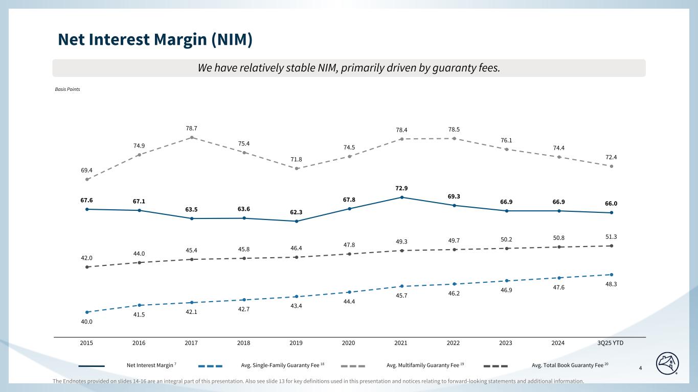 3 The Endnotes provided on slides 14-16 are an integral part of this presentation. Also see slide 13 for key definitions used in this presentation and notices relating to forward-looking statements and additional information. Special Colors #edebe9 #898989 #cff2f2 Categorical Color Palette #05314d #1c6fa3 #898989 #4d4d4d #5dc7d0 #c55422 #2c6937 Sequential Color Palette #121212 #05314d #085280 #1c6fa3 #509ed5 #98c6e6 Line graph Color Palette #c44786 (refrain from using) #085280 #5dc7d0 #898989 #e66e39 #418152 #ffb400 For callout boxes Use in rounded shape The guaranty business drives the majority of our net interest income. Guaranty book balance is impacted by home prices, mortgage rates, and our market share. Guaranty Book & Net Interest Income Page align Top align Bottom align Net Interest IncomeGuaranty Book 3 $ Billions $ Billions $3,896 $4,076 $4,107 $4,117 $4,106 $3,483 $3,635 $3,637 $3,617 $3,585 $413 $441 $470 $500 $521 2021 2022 2023 2024 3Q25 Single-Family 10 Multifamily 11 $14.2 $16.1 $16.2 $16.5 $12.7 $3.1 $3.3 $3.4 $3.4 $2.5 $11.2 $7.1 $4.0 $3.3 $2.4 $1.1 $2.9 $5.2 $5.5 $3.7 2021 2022 2023 2024 YTD 2025 Base Guaranty Fee 12 Deferred Guaranty Fee 13 Liquidity Port. & Other 14TCCA 3Q25 +0.1% Single-Family Home Price Index 15 △ $29.6 $29.4 $28.8 $28.7 $21.3 ~25% of U.S. Single-Family Mortgage Debt Outstanding 17 ~21% of U.S. Multifamily Mortgage Debt Outstanding 17 - 47.0 bps QoQ 30-Year Fixed Mortgage Rate 16 △