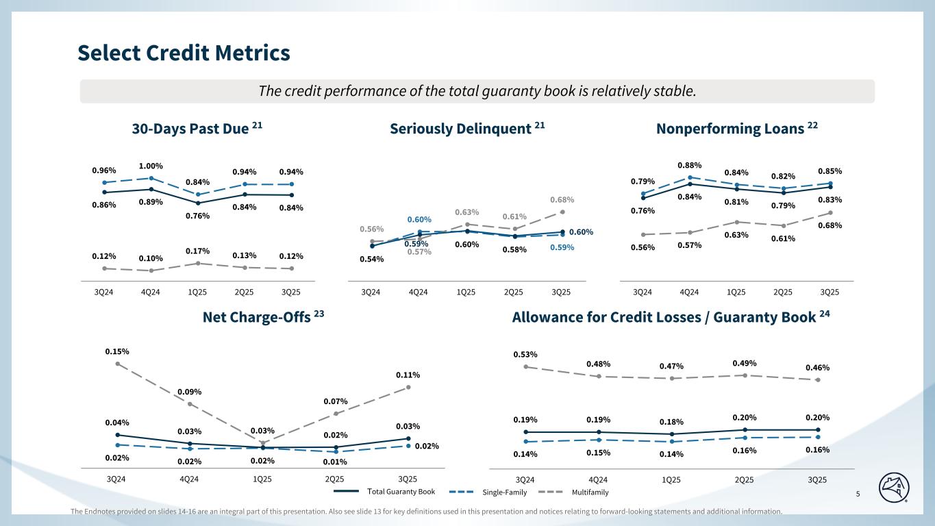 4 The Endnotes provided on slides 14-16 are an integral part of this presentation. Also see slide 13 for key definitions used in this presentation and notices relating to forward-looking statements and additional information. Special Colors #edebe9 #898989 #cff2f2 Categorical Color Palette #05314d #1c6fa3 #898989 #4d4d4d #5dc7d0 #c55422 #2c6937 Sequential Color Palette #121212 #05314d #085280 #1c6fa3 #509ed5 #98c6e6 Line graph Color Palette #c44786 (refrain from using) #085280 #5dc7d0 #898989 #e66e39 #418152 #ffb400 For callout boxes Use in rounded shape 67.6 67.1 63.5 63.6 62.3 67.8 72.9 69.3 66.9 66.9 66.0 42.0 44.0 45.4 45.8 46.4 47.8 49.3 49.7 50.2 50.8 51.3 40.0 41.5 42.1 42.7 43.4 44.4 45.7 46.2 46.9 47.6 48.3 69.4 74.9 78.7 75.4 71.8 74.5 78.4 78.5 76.1 74.4 72.4 2015 2016 2017 2018 2019 2020 2021 2022 2023 2024 3Q25 YTD Net Interest Margin (NIM) Page align Top align Bottom align We have relatively stable NIM, primarily driven by guaranty fees. Basis Points Net Interest Margin 7 Avg. Single-Family Guaranty Fee 18 Avg. Multifamily Guaranty Fee 19 Avg. Total Book Guaranty Fee 20