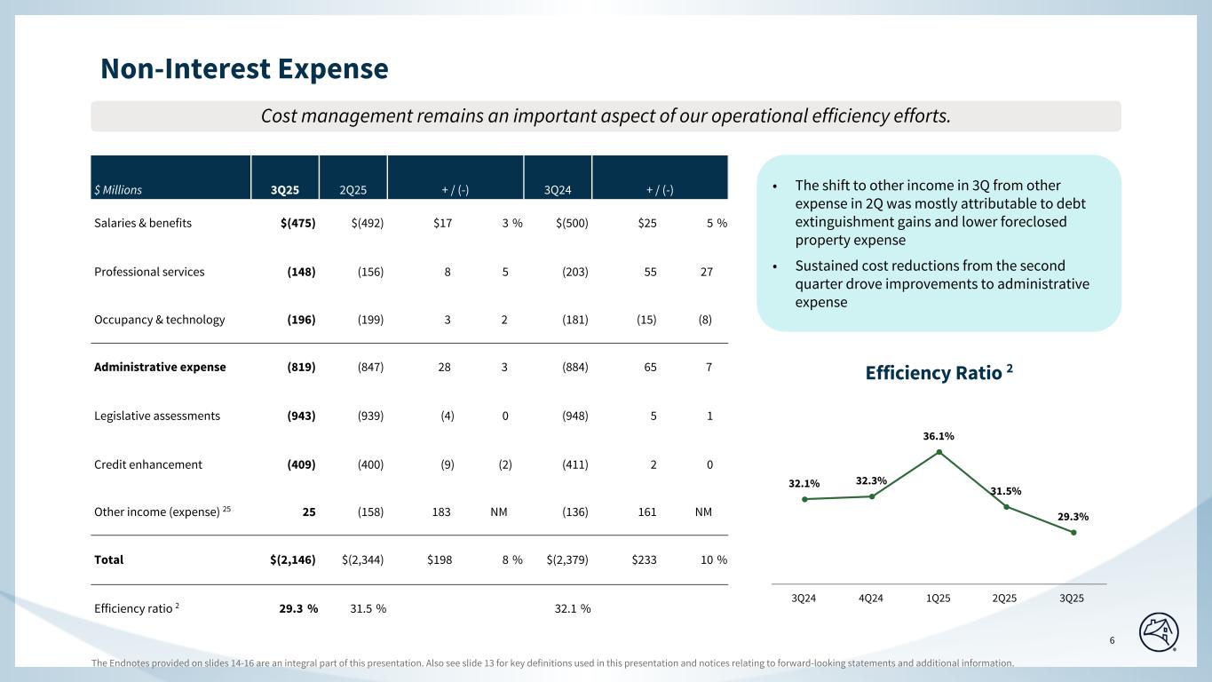 6 The Endnotes provided on slides 14-16 are an integral part of this presentation. Also see slide 13 for key definitions used in this presentation and notices relating to forward-looking statements and additional information. Special Colors #edebe9 #898989 #cff2f2 Categorical Color Palette #05314d #1c6fa3 #898989 #4d4d4d #5dc7d0 #c55422 #2c6937 Sequential Color Palette #121212 #05314d #085280 #1c6fa3 #509ed5 #98c6e6 Line graph Color Palette #c44786 (refrain from using) #085280 #5dc7d0 #898989 #e66e39 #418152 #ffb400 For callout boxes Use in rounded shape Non-Interest Expense Page align Top align Bottom align Cost management remains an important aspect of our operational efficiency efforts. $ Millions 3Q25 2Q25 + / (-) 3Q24 + / (-) Salaries & benefits $(475) $(492) $17 3 % $(500) $25 5 % Professional services (148) (156) 8 5 (203) 55 27 Occupancy & technology (196) (199) 3 2 (181) (15) (8) Administrative expense (819) (847) 28 3 (884) 65 7 Legislative assessments (943) (939) (4) 0 (948) 5 1 Credit enhancement (409) (400) (9) (2) (411) 2 0 Other income (expense) 25 25 (158) 183 NM (136) 161 NM Total $(2,146) $(2,344) $198 8 % $(2,379) $233 10 % Efficiency ratio 2 29.3 % 31.5 % 32.1 % Efficiency Ratio 2 Top align 32.1% 32.3% 36.1% 31.5% 29.3% 3Q24 4Q24 1Q25 2Q25 3Q25 • The shift to other income in 3Q from other expense in 2Q was mostly attributable to debt extinguishment gains and lower foreclosed property expense • Sustained cost reductions from the second quarter drove improvements to administrative expense