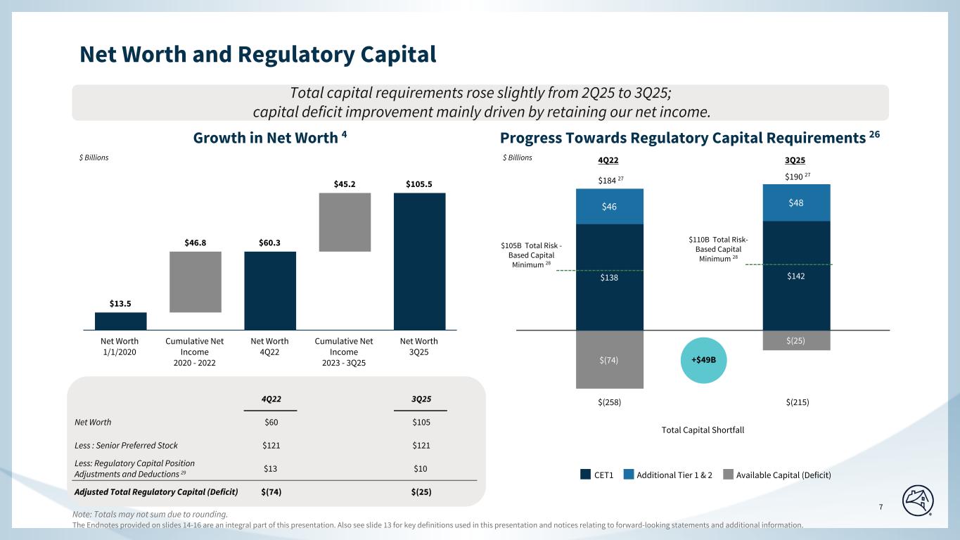 7 The Endnotes provided on slides 14-16 are an integral part of this presentation. Also see slide 13 for key definitions used in this presentation and notices relating to forward-looking statements and additional information. Special Colors #edebe9 #898989 #cff2f2 Categorical Color Palette #05314d #1c6fa3 #898989 #4d4d4d #5dc7d0 #c55422 #2c6937 Sequential Color Palette #121212 #05314d #085280 #1c6fa3 #509ed5 #98c6e6 Line graph Color Palette #c44786 (refrain from using) #085280 #5dc7d0 #898989 #e66e39 #418152 #ffb400 For callout boxes Use in rounded shape $138 $142 $46 $48 $(74) $(25) 4Q22 3Q25 Net Worth $60 $105 Less : Senior Preferred Stock $121 $121 Less: Regulatory Capital Position Adjustments and Deductions 29 $13 $10 Adjusted Total Regulatory Capital (Deficit) $(74) $(25) Net Worth and Regulatory Capital Growth in Net Worth 4 $13.5 $46.8 $60.3 $45.2 $105.5 Net Worth 1/1/2020 Cumulative Net Income 2020 - 2022 Net Worth 4Q22 Cumulative Net Income 2023 - 3Q25 Net Worth 3Q25 $ Billions Page align Top align Bottom align $ Billions Progress Towards Regulatory Capital Requirements 26 Top Chart align CET1 Additional Tier 1 & 2 $105B Total Risk - Based Capital Minimum 28 $110B Total Risk- Based Capital Minimum 28 Total capital requirements rose slightly from 2Q25 to 3Q25; capital deficit improvement mainly driven by retaining our net income. Available Capital (Deficit) 4Q22 3Q25 $(258) $(215) Total Capital Shortfall $184 27 $190 27 Note: Totals may not sum due to rounding. +$49B