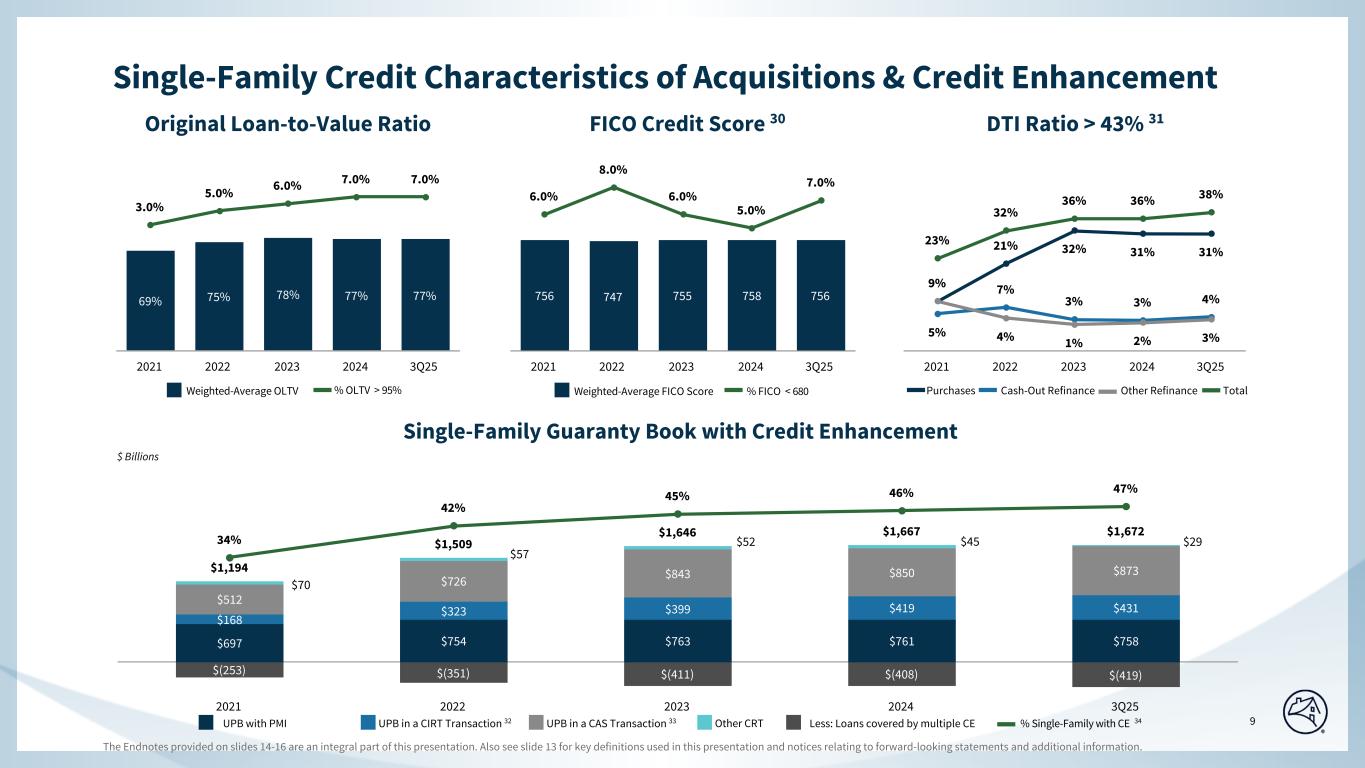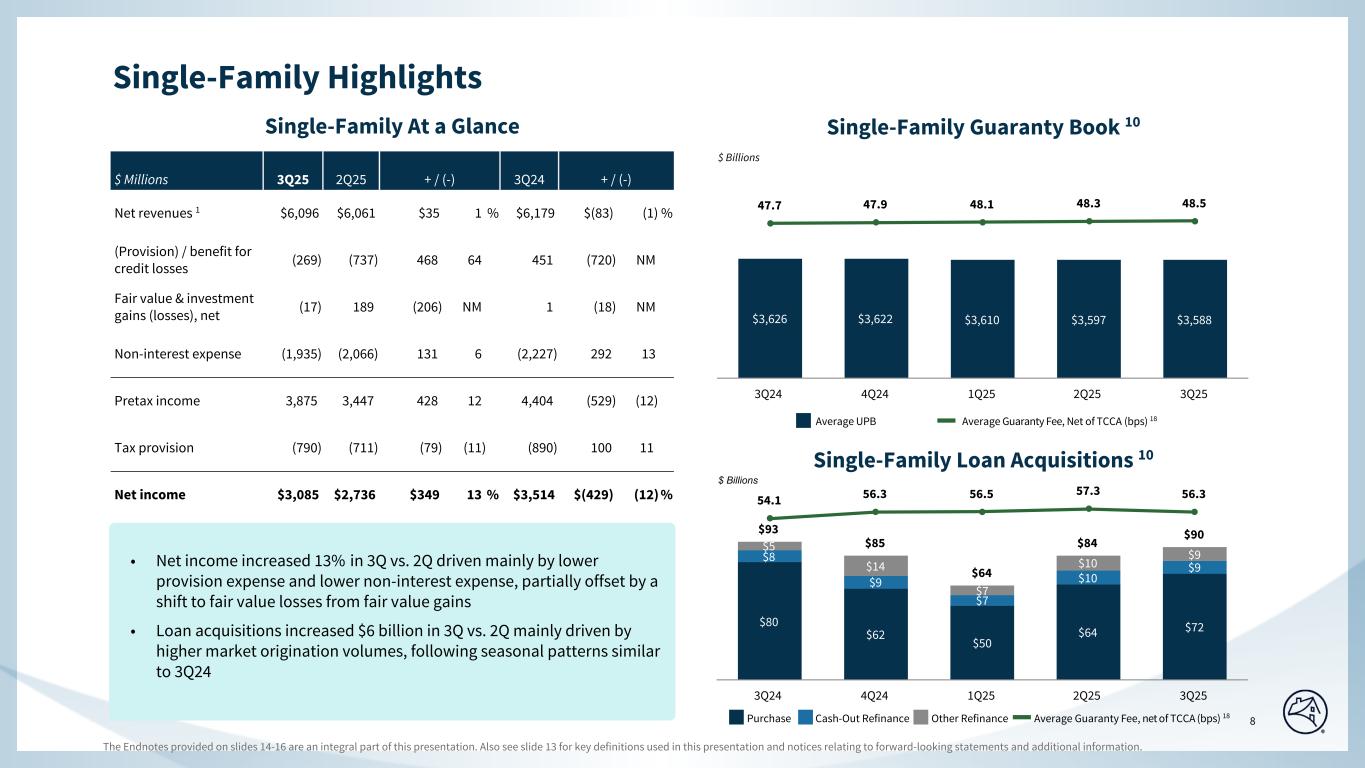 8 The Endnotes provided on slides 14-16 are an integral part of this presentation. Also see slide 13 for key definitions used in this presentation and notices relating to forward-looking statements and additional information. Special Colors #edebe9 #898989 #cff2f2 Categorical Color Palette #05314d #1c6fa3 #898989 #4d4d4d #5dc7d0 #c55422 #2c6937 Sequential Color Palette #121212 #05314d #085280 #1c6fa3 #509ed5 #98c6e6 Line graph Color Palette #c44786 (refrain from using) #085280 #5dc7d0 #898989 #e66e39 #418152 #ffb400 For callout boxes Use in rounded shape $3,626 $3,622 $3,610 $3,597 $3,588 47.7 47.9 48.1 48.3 48.5 3Q24 4Q24 1Q25 2Q25 3Q25 $80 $62 $50 $64 $72 $8 $9 $7 $10 $9 $5 $14 $7 $10 $9 $93 $85 $64 $84 $90 54.1 56.3 56.5 57.3 56.3 3Q24 4Q24 1Q25 2Q25 3Q25 $ Billions Single-Family At a Glance Purchase Average Guaranty Fee, net of TCCA (bps) 18Cash-Out Refinance Other Refinance Average UPB Average Guaranty Fee, Net of TCCA (bps) 18 Single-Family Guaranty Book 10 Single-Family Loan Acquisitions 10 $ Billions $ Millions 3Q25 2Q25 + / (-) 3Q24 + / (-) Net revenues 1 $6,096 $6,061 $35 1 % $6,179 $(83) (1) % (Provision) / benefit for credit losses (269) (737) 468 64 451 (720) NM Fair value & investment gains (losses), net (17) 189 (206) NM 1 (18) NM Non-interest expense (1,935) (2,066) 131 6 (2,227) 292 13 Pretax income 3,875 3,447 428 12 4,404 (529) (12) Tax provision (790) (711) (79) (11) (890) 100 11 Net income $3,085 $2,736 $349 13 % $3,514 $(429) (12) % • Net income increased 13% in 3Q vs. 2Q driven mainly by lower provision expense and lower non-interest expense, partially offset by a shift to fair value losses from fair value gains • Loan acquisitions increased $6 billion in 3Q vs. 2Q mainly driven by higher market origination volumes, following seasonal patterns similar to 3Q24 Single-Family Highlights