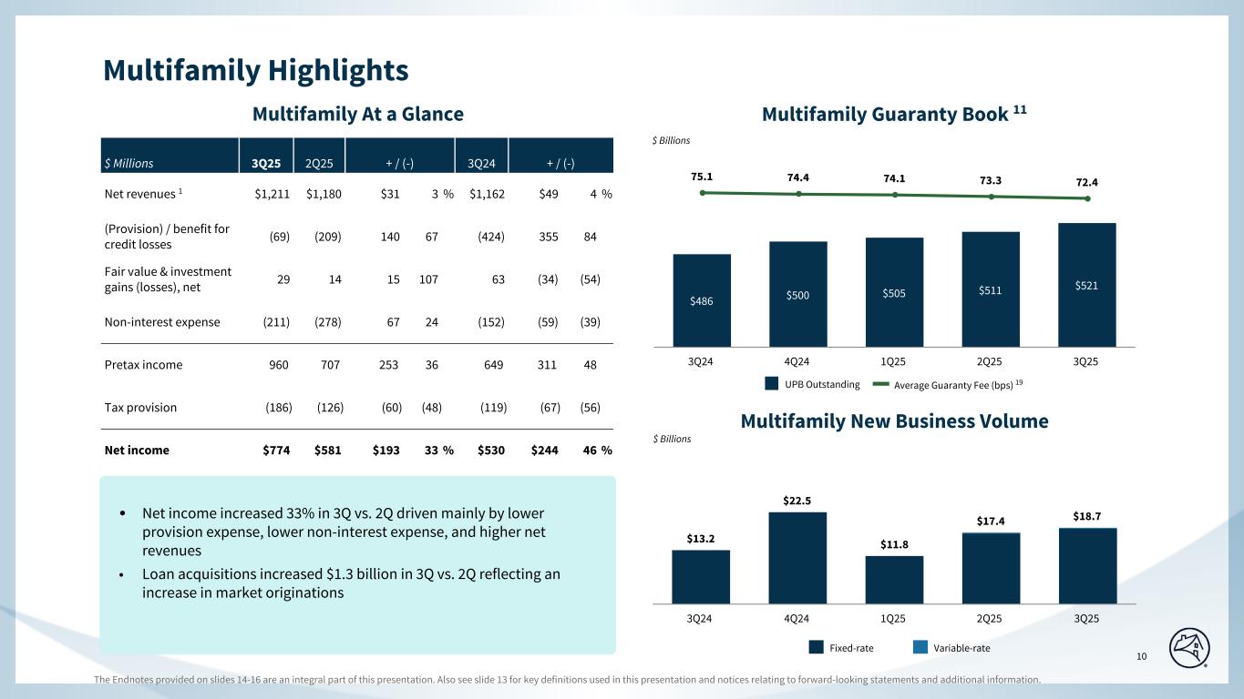10 The Endnotes provided on slides 14-16 are an integral part of this presentation. Also see slide 13 for key definitions used in this presentation and notices relating to forward-looking statements and additional information. Special Colors #edebe9 #898989 #cff2f2 Categorical Color Palette #05314d #1c6fa3 #898989 #4d4d4d #5dc7d0 #c55422 #2c6937 Sequential Color Palette #121212 #05314d #085280 #1c6fa3 #509ed5 #98c6e6 Line graph Color Palette #c44786 (refrain from using) #085280 #5dc7d0 #898989 #e66e39 #418152 #ffb400 For callout boxes Use in rounded shape $486 $500 $505 $511 $521 75.1 74.4 74.1 73.3 72.4 3Q24 4Q24 1Q25 2Q25 3Q25 Multifamily At a Glance Multifamily Guaranty Book 11 $ Millions 3Q25 2Q25 + / (-) 3Q24 + / (-) Net revenues 1 $1,211 $1,180 $31 3 % $1,162 $49 4 % (Provision) / benefit for credit losses (69) (209) 140 67 (424) 355 84 Fair value & investment gains (losses), net 29 14 15 107 63 (34) (54) Non-interest expense (211) (278) 67 24 (152) (59) (39) Pretax income 960 707 253 36 649 311 48 Tax provision (186) (126) (60) (48) (119) (67) (56) Net income $774 $581 $193 33 % $530 $244 46 % $13.2 $22.5 $11.8 $17.4 $18.7 3Q24 4Q24 1Q25 2Q25 3Q25 Fixed-rate Multifamily New Business Volume Variable-rate $ Billions $ Billions UPB Outstanding Average Guaranty Fee (bps) 19 Page align Multifamily Highlights • Net income increased 33% in 3Q vs. 2Q driven mainly by lower provision expense, lower non-interest expense, and higher net revenues • Loan acquisitions increased $1.3 billion in 3Q vs. 2Q reflecting an increase in market originations
