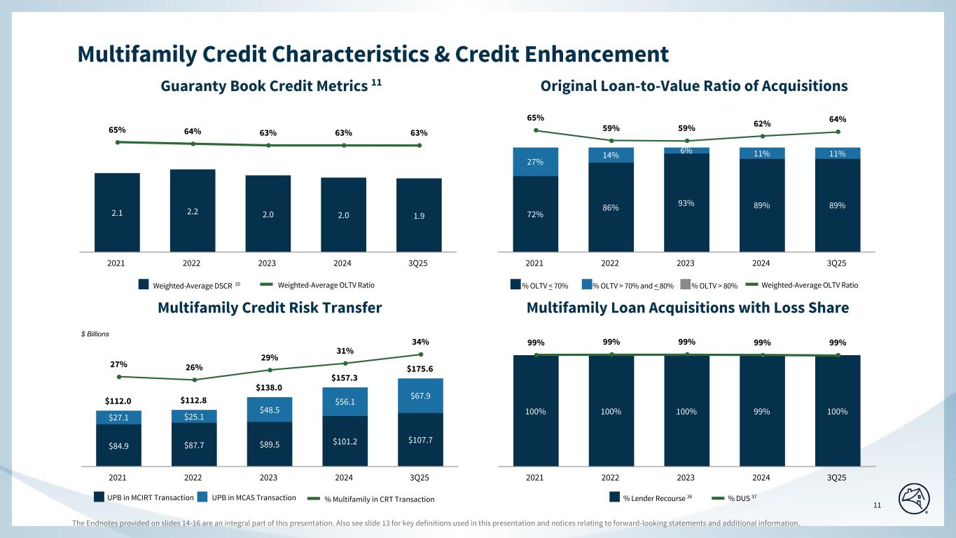 11 The Endnotes provided on slides 14-16 are an integral part of this presentation. Also see slide 13 for key definitions used in this presentation and notices relating to forward-looking statements and additional information. Special Colors #edebe9 #898989 #cff2f2 Categorical Color Palette #05314d #1c6fa3 #898989 #4d4d4d #5dc7d0 #c55422 #2c6937 Sequential Color Palette #121212 #05314d #085280 #1c6fa3 #509ed5 #98c6e6 Line graph Color Palette #c44786 (refrain from using) #085280 #5dc7d0 #898989 #e66e39 #418152 #ffb400 For callout boxes Use in rounded shape Multifamily Credit Characteristics & Credit Enhancement 72% 86% 93% 89% 89% 27% 14% 6% 11% 11% 65% 59% 59% 62% 64% 2021 2022 2023 2024 3Q25 2.1 2.2 2.0 2.0 1.9 65% 64% 63% 63% 63% 2021 2022 2023 2024 3Q25 Original Loan-to-Value Ratio of Acquisitions Guaranty Book Credit Metrics 11 $112.0 $112.8 $138.0 $157.3 $175.6 $84.9 $87.7 $89.5 $101.2 $107.7 $27.1 $25.1 $48.5 $56.1 $67.9 27% 26% 29% 31% 34% 2021 2022 2023 2024 3Q25 Multifamily Loan Acquisitions with Loss ShareMultifamily Credit Risk Transfer 100% 100% 100% 99% 100% 99% 99% 99% 99% 99% 2021 2022 2023 2024 3Q25 Weighted-Average DSCR 35 Weighted-Average OLTV Ratio % OLTV > 80% Weighted-Average OLTV Ratio% OLTV < 70% % OLTV > 70% and < 80% % Multifamily in CRT TransactionUPB in MCIRT Transaction UPB in MCAS Transaction % Lender Recourse 36 % DUS 37 $ Billions Page align