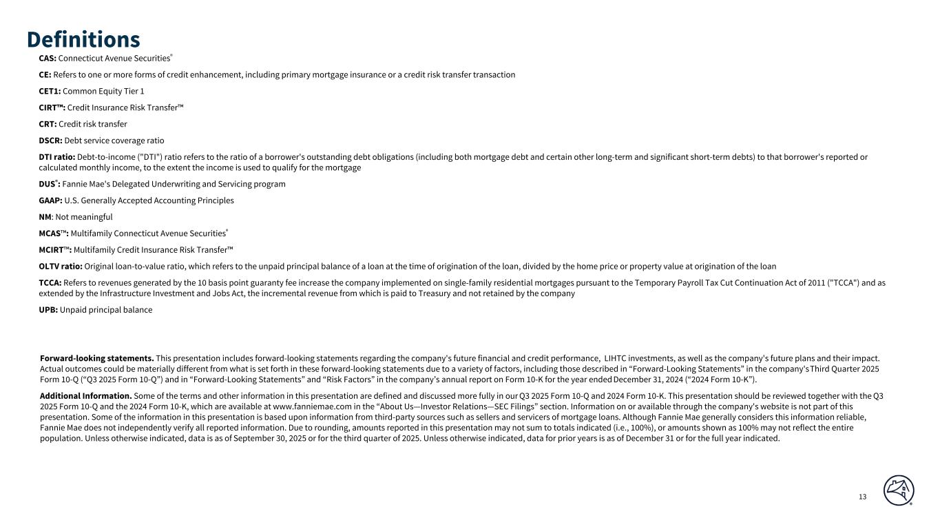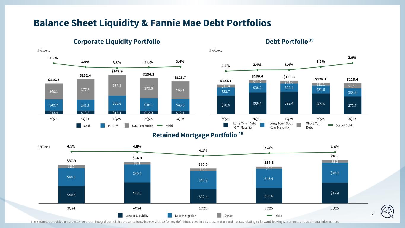 12 The Endnotes provided on slides 14-16 are an integral part of this presentation. Also see slide 13 for key definitions used in this presentation and notices relating to forward-looking statements and additional information. Special Colors #edebe9 #898989 #cff2f2 Categorical Color Palette #05314d #1c6fa3 #898989 #4d4d4d #5dc7d0 #c55422 #2c6937 Sequential Color Palette #121212 #05314d #085280 #1c6fa3 #509ed5 #98c6e6 Line graph Color Palette #c44786 (refrain from using) #085280 #5dc7d0 #898989 #e66e39 #418152 #ffb400 For callout boxes Use in rounded shape $13.4 $13.5 $13.4 $12.3 $12.1 $42.7 $41.3 $56.6 $48.1 $45.5 $60.1 $77.6 $77.9 $75.8 $66.1 $116.2 $132.4 $147.9 $136.2 $123.7 3.9% 3.6% 3.5% 3.6% 3.6% 3Q24 4Q24 1Q25 2Q25 3Q25 $76.6 $89.9 $92.4 $85.6 $72.6 $33.7 $38.3 $33.4 $31.6 $33.9 $11.4 $11.2 $11.0 $11.1 $19.9 $121.7 $139.4 $136.8 $128.3 $126.4 3.3% 3.4% 3.4% 3.6% 3.9% 3Q24 4Q24 1Q25 2Q25 3Q25 Cash Repo 38 U.S. Treasuries Debt Portfolio 39 Long-Term Debt >1 Yr Maturity Long-Term Debt <1 Yr Maturity Short-Term Debt Corporate Liquidity Portfolio Cost of DebtYield $ Billions $ Billions $87.9 $94.9 $80.3 $84.8 $98.8 $40.6 $48.6 $32.4 $35.8 $47.4 $40.6 $40.2 $42.3 $43.4 $46.2 $6.7 $6.1 $5.6 $5.6 $5.2 4.5% 4.5% 4.1% 4.3% 4.4% 3Q24 4Q24 1Q25 2Q25 3Q25 $ Billions Lender Liquidity Loss Mitigation Other Retained Mortgage Portfolio 40 Yield Balance Sheet Liquidity & Fannie Mae Debt Portfolios