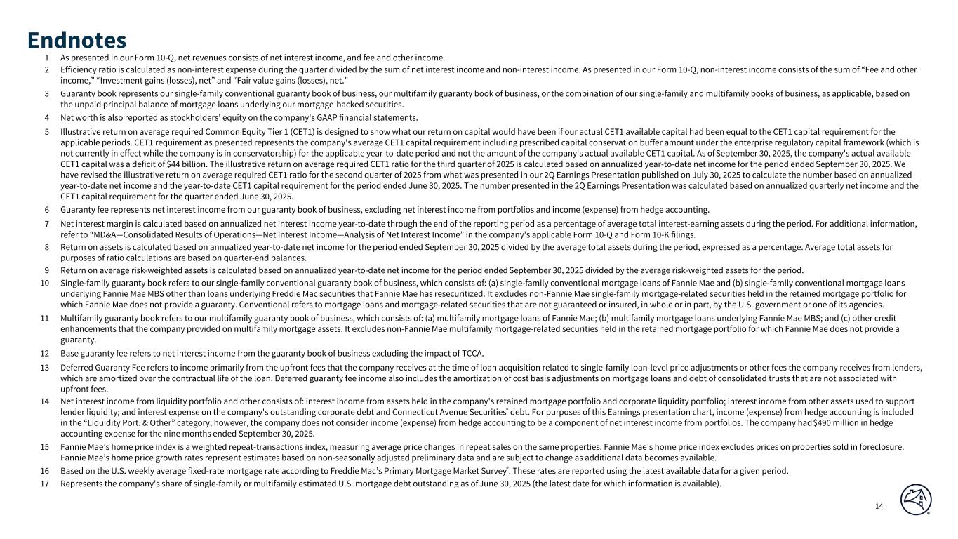 DRAFT 14 1 As presented in our Form 10-Q, net revenues consists of net interest income, and fee and other income. 2 Efficiency ratio is calculated as non-interest expense during the quarter divided by the sum of net interest income and non-interest income. As presented in our Form 10-Q, non-interest income consists of the sum of “Fee and other income,” “Investment gains (losses), net” and “Fair value gains (losses), net.” 3 Guaranty book represents our single-family conventional guaranty book of business, our multifamily guaranty book of business, or the combination of our single-family and multifamily books of business, as applicable, based on the unpaid principal balance of mortgage loans underlying our mortgage-backed securities. 4 Net worth is also reported as stockholders' equity on the company's GAAP financial statements. 5 Illustrative return on average required Common Equity Tier 1 (CET1) is designed to show what our return on capital would have been if our actual CET1 available capital had been equal to the CET1 capital requirement for the applicable periods. CET1 requirement as presented represents the company's average CET1 capital requirement including prescribed capital conservation buffer amount under the enterprise regulatory capital framework (which is not currently in effect while the company is in conservatorship) for the applicable year-to-date period and not the amount of the company's actual available CET1 capital. As of September 30, 2025, the company's actual available CET1 capital was a deficit of $44 billion. The illustrative return on average required CET1 ratio for the third quarter of 2025 is calculated based on annualized year-to-date net income for the period ended September 30, 2025. We have revised the illustrative return on average required CET1 ratio for the second quarter of 2025 from what was presented in our 2Q Earnings Presentation published on July 30, 2025 to calculate the number based on annualized year-to-date net income and the year-to-date CET1 capital requirement for the period ended June 30, 2025. The number presented in the 2Q Earnings Presentation was calculated based on annualized quarterly net income and the CET1 capital requirement for the quarter ended June 30, 2025. 6 Guaranty fee represents net interest income from our guaranty book of business, excluding net interest income from portfolios and income (expense) from hedge accounting. 7 Net interest margin is calculated based on annualized net interest income year-to-date through the end of the reporting period as a percentage of average total interest-earning assets during the period. For additional information, refer to “MD&A—Consolidated Results of Operations—Net Interest Income—Analysis of Net Interest Income” in the company's applicable Form 10-Q and Form 10-K filings. 8 Return on assets is calculated based on annualized year-to-date net income for the period ended September 30, 2025 divided by the average total assets during the period, expressed as a percentage. Average total assets for purposes of ratio calculations are based on quarter-end balances. 9 Return on average risk-weighted assets is calculated based on annualized year-to-date net income for the period ended September 30, 2025 divided by the average risk-weighted assets for the period. 10 Single-family guaranty book refers to our single-family conventional guaranty book of business, which consists of: (a) single-family conventional mortgage loans of Fannie Mae and (b) single-family conventional mortgage loans underlying Fannie Mae MBS other than loans underlying Freddie Mac securities that Fannie Mae has resecuritized. It excludes non-Fannie Mae single-family mortgage-related securities held in the retained mortgage portfolio for which Fannie Mae does not provide a guaranty. Conventional refers to mortgage loans and mortgage-related securities that are not guaranteed or insured, in whole or in part, by the U.S. government or one of its agencies. 11 Multifamily guaranty book refers to our multifamily guaranty book of business, which consists of: (a) multifamily mortgage loans of Fannie Mae; (b) multifamily mortgage loans underlying Fannie Mae MBS; and (c) other credit enhancements that the company provided on multifamily mortgage assets. It excludes non-Fannie Mae multifamily mortgage-related securities held in the retained mortgage portfolio for which Fannie Mae does not provide a guaranty. 12 Base guaranty fee refers to net interest income from the guaranty book of business excluding the impact of TCCA. 13 Deferred Guaranty Fee refers to income primarily from the upfront fees that the company receives at the time of loan acquisition related to single-family loan-level price adjustments or other fees the company receives from lenders, which are amortized over the contractual life of the loan. Deferred guaranty fee income also includes the amortization of cost basis adjustments on mortgage loans and debt of consolidated trusts that are not associated with upfront fees. 14 Net interest income from liquidity portfolio and other consists of: interest income from assets held in the company's retained mortgage portfolio and corporate liquidity portfolio; interest income from other assets used to support lender liquidity; and interest expense on the company's outstanding corporate debt and Connecticut Avenue Securities® debt. For purposes of this Earnings presentation chart, income (expense) from hedge accounting is included in the “Liquidity Port. & Other” category; however, the company does not consider income (expense) from hedge accounting to be a component of net interest income from portfolios. The company had $490 million in hedge accounting expense for the nine months ended September 30, 2025. 15 Fannie Mae’s home price index is a weighted repeat-transactions index, measuring average price changes in repeat sales on the same properties. Fannie Mae’s home price index excludes prices on p