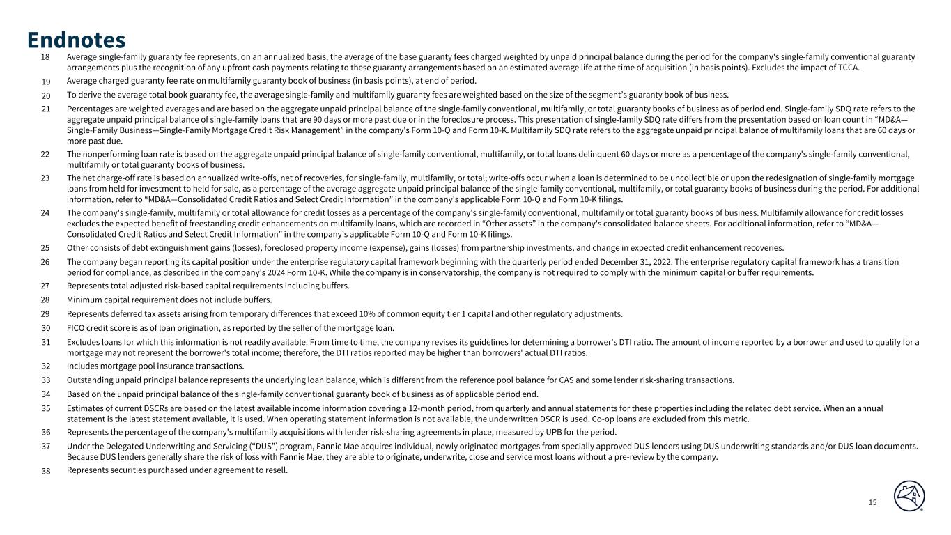 DRAFT 15 18 Average single-family guaranty fee represents, on an annualized basis, the average of the base guaranty fees charged weighted by unpaid principal balance during the period for the company's single-family conventional guaranty arrangements plus the recognition of any upfront cash payments relating to these guaranty arrangements based on an estimated average life at the time of acquisition (in basis points). Excludes the impact of TCCA. 19 Average charged guaranty fee rate on multifamily guaranty book of business (in basis points), at end of period. 20 To derive the average total book guaranty fee, the average single-family and multifamily guaranty fees are weighted based on the size of the segment’s guaranty book of business. 21 Percentages are weighted averages and are based on the aggregate unpaid principal balance of the single-family conventional, multifamily, or total guaranty books of business as of period end. Single-family SDQ rate refers to the aggregate unpaid principal balance of single-family loans that are 90 days or more past due or in the foreclosure process. This presentation of single-family SDQ rate differs from the presentation based on loan count in “MD&A— Single-Family Business—Single-Family Mortgage Credit Risk Management” in the company's Form 10-Q and Form 10-K. Multifamily SDQ rate refers to the aggregate unpaid principal balance of multifamily loans that are 60 days or more past due. 22 The nonperforming loan rate is based on the aggregate unpaid principal balance of single-family conventional, multifamily, or total loans delinquent 60 days or more as a percentage of the company's single-family conventional, multifamily or total guaranty books of business. 23 The net charge-off rate is based on annualized write-offs, net of recoveries, for single-family, multifamily, or total; write-offs occur when a loan is determined to be uncollectible or upon the redesignation of single-family mortgage loans from held for investment to held for sale, as a percentage of the average aggregate unpaid principal balance of the single-family conventional, multifamily, or total guaranty books of business during the period. For additional information, refer to “MD&A—Consolidated Credit Ratios and Select Credit Information” in the company's applicable Form 10-Q and Form 10-K filings. 24 The company's single-family, multifamily or total allowance for credit losses as a percentage of the company's single-family conventional, multifamily or total guaranty books of business. Multifamily allowance for credit losses excludes the expected benefit of freestanding credit enhancements on multifamily loans, which are recorded in “Other assets” in the company's consolidated balance sheets. For additional information, refer to “MD&A— Consolidated Credit Ratios and Select Credit Information” in the company’s applicable Form 10-Q and Form 10-K filings. 25 Other consists of debt extinguishment gains (losses), foreclosed property income (expense), gains (losses) from partnership investments, and change in expected credit enhancement recoveries. 26 The company began reporting its capital position under the enterprise regulatory capital framework beginning with the quarterly period ended December 31, 2022. The enterprise regulatory capital framework has a transition period for compliance, as described in the company's 2024 Form 10-K. While the company is in conservatorship, the company is not required to comply with the minimum capital or buffer requirements. 27 Represents total adjusted risk-based capital requirements including buffers. 28 Minimum capital requirement does not include buffers. 29 Represents deferred tax assets arising from temporary differences that exceed 10% of common equity tier 1 capital and other regulatory adjustments. 30 FICO credit score is as of loan origination, as reported by the seller of the mortgage loan. 31 Excludes loans for which this information is not readily available. From time to time, the company revises its guidelines for determining a borrower's DTI ratio. The amount of income reported by a borrower and used to qualify for a mortgage may not represent the borrower's total income; therefore, the DTI ratios reported may be higher than borrowers' actual DTI ratios. 32 Includes mortgage pool insurance transactions. 33 Outstanding unpaid principal balance represents the underlying loan balance, which is different from the reference pool balance for CAS and some lender risk-sharing transactions. 34 Based on the unpaid principal balance of the single-family conventional guaranty book of business as of applicable period end. 35 Estimates of current DSCRs are based on the latest available income information covering a 12-month period, from quarterly and annual statements for these properties including the related debt service. When an annual statement is the latest statement available, it is used. When operating statement information is not available, the underwritten DSCR is used. Co-op loans are excluded from this metric. 36 Represents the percentage of the company's multifamily acquisitions with lender risk-sharing agreements in place, measured by UPB for the period. 37 Under the Delegated Underwriting and Servicing (“DUS”) program, Fannie Mae acquires individual, newly originated mortgages from specially approved DUS lenders using DUS underwriting standards and/or DUS loan documents. Because DUS lenders generally share the risk of loss with Fannie Mae, they are able to originate, underwrite, close and service most loans without a pre-review by the company. 38 Represents securities purchased under agreement to resell. Endnotes