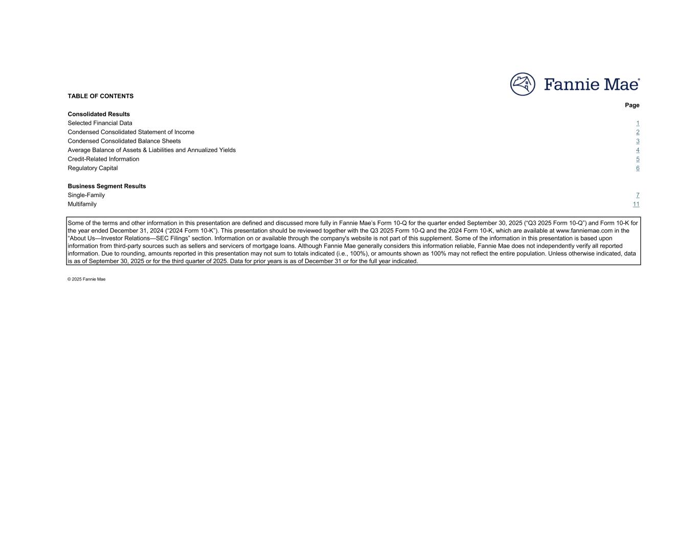 TABLE OF CONTENTS Page Consolidated Results Selected Financial Data 1 Condensed Consolidated Statement of Income 2 Condensed Consolidated Balance Sheets 3 Average Balance of Assets & Liabilities and Annualized Yields 4 Credit-Related Information 5 Regulatory Capital 6 Business Segment Results Single-Family 7 Multifamily 11 © 2025 Fannie Mae Some of the terms and other information in this presentation are defined and discussed more fully in Fannie Mae’s Form 10-Q for the quarter ended September 30, 2025 (“Q3 2025 Form 10-Q”) and Form 10-K for the year ended December 31, 2024 (“2024 Form 10-K”). This presentation should be reviewed together with the Q3 2025 Form 10-Q and the 2024 Form 10-K, which are available at www.fanniemae.com in the “About Us—Investor Relations—SEC Filings” section. Information on or available through the company's website is not part of this supplement. Some of the information in this presentation is based upon information from third-party sources such as sellers and servicers of mortgage loans. Although Fannie Mae generally considers this information reliable, Fannie Mae does not independently verify all reported information. Due to rounding, amounts reported in this presentation may not sum to totals indicated (i.e., 100%), or amounts shown as 100% may not reflect the entire population. Unless otherwise indicated, data is as of September 30, 2025 or for the third quarter of 2025. Data for prior years is as of December 31 or for the full year indicated.