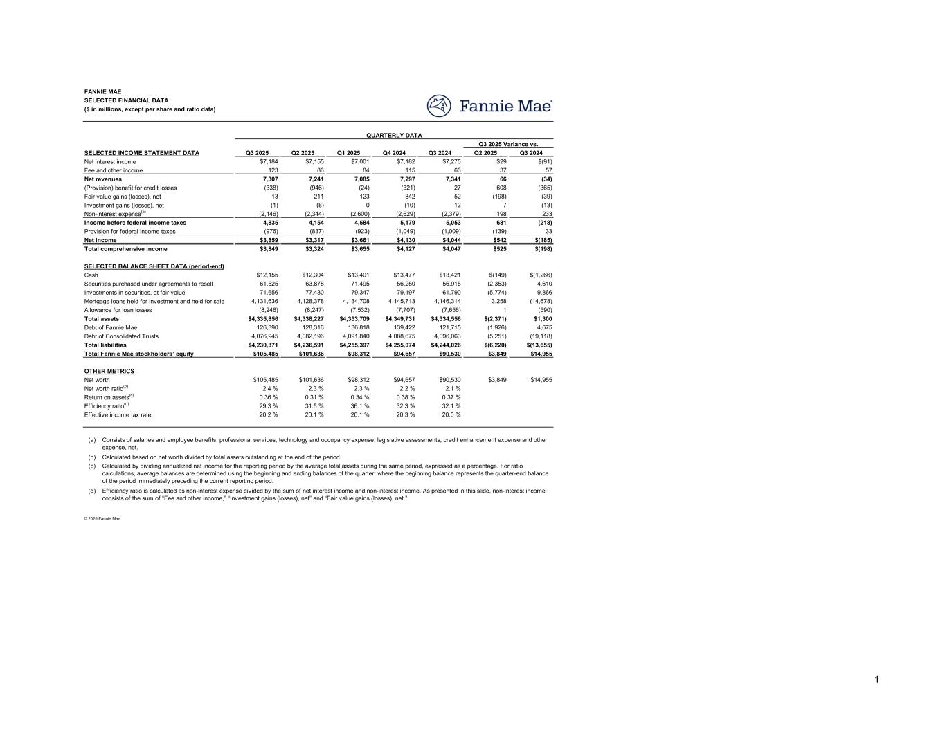 Q3 2025 Q2 2025 Q1 2025 Q4 2024 Q3 2024 Q2 2025 Q3 2024 $7,184 $7,155 $7,001 $7,182 $7,275 $29 $(91) 123 86 84 115 66 37 57 7,307 7,241 7,085 7,297 7,341 66 (34) (338) (946) (24) (321) 27 608 (365) 13 211 123 842 52 (198) (39) (1) (8) 0 (10) 12 7 (13) (2,146) (2,344) (2,600) (2,629) (2,379) 198 233 4,835 4,154 4,584 5,179 5,053 681 (218) (976) (837) (923) (1,049) (1,009) (139) 33 $3,859 $3,317 $3,661 $4,130 $4,044 $542 $(185) $3,849 $3,324 $3,655 $4,127 $4,047 $525 $(198) $12,155 $12,304 $13,401 $13,477 $13,421 $(149) $(1,266) 61,525 63,878 71,495 56,250 56,915 (2,353) 4,610 71,656 77,430 79,347 79,197 61,790 (5,774) 9,866 4,131,636 4,128,378 4,134,708 4,145,713 4,146,314 3,258 (14,678) (8,246) (8,247) (7,532) (7,707) (7,656) 1 (590) $4,335,856 $4,338,227 $4,353,709 $4,349,731 $4,334,556 $(2,371) $1,300 126,390 128,316 136,818 139,422 121,715 (1,926) 4,675 4,076,945 4,082,196 4,091,840 4,088,675 4,096,063 (5,251) (19,118) $4,230,371 $4,236,591 $4,255,397 $4,255,074 $4,244,026 $(6,220) $(13,655) $105,485 $101,636 $98,312 $94,657 $90,530 $3,849 $14,955 $105,485 $101,636 $98,312 $94,657 $90,530 $3,849 $14,955 2.4 % 2.3 % 2.3 % 2.2 % 2.1 % 0.36 % 0.31 % 0.34 % 0.38 % 0.37 % 29.3 % 31.5 % 36.1 % 32.3 % 32.1 % 20.2 % 20.1 % 20.1 % 20.3 % 20.0 % (a) (b) (c) (d) Effective income tax rate © 2025 Fannie Mae Return on assets (c) Net worth ratio (b) OTHER METRICS Net worth Efficiency ratio (d) Calculated by dividing annualized net income for the reporting period by the average total assets during the same period, expressed as a percentage. For ratio calculations, average balances are determined using the beginning and ending balances of the quarter, where the beginning balance represents the quarter-end balance of the period immediately preceding the current reporting period. Efficiency ratio is calculated as non-interest expense divided by the sum of net interest income and non-interest income. As presented in this slide, non-interest income consists of the sum of “Fee and other income,” “Investment gains (losses), net” and “Fair value gains (losses), net.” Consists of salaries and employee benefits, professional services, technology and occupancy expense, legislative assessments, credit enhancement expense and other expense, net. Calculated based on net worth divided by total assets outstanding at the end of the period. Allowance for loan losses Total assets Debt of Fannie Mae Total Fannie Mae stockholders’ equity Total liabilities Debt of Consolidated Trusts Investments in securities, at fair value Securities purchased under agreements to resell SELECTED BALANCE SHEET DATA (period-end) Cash Mortgage loans held for investment and held for sale Investment gains (losses), net Non-interest expense (a) Income before federal income taxes Total comprehensive income Net income Provision for federal income taxes (Provision) benefit for credit losses Net revenues Net interest income Fee and other income Fair value gains (losses), net FANNIE MAE SELECTED FINANCIAL DATA ($ in millions, except per share and ratio data) SELECTED INCOME STATEMENT DATA QUARTERLY DATA Q3 2025 Variance vs. 1