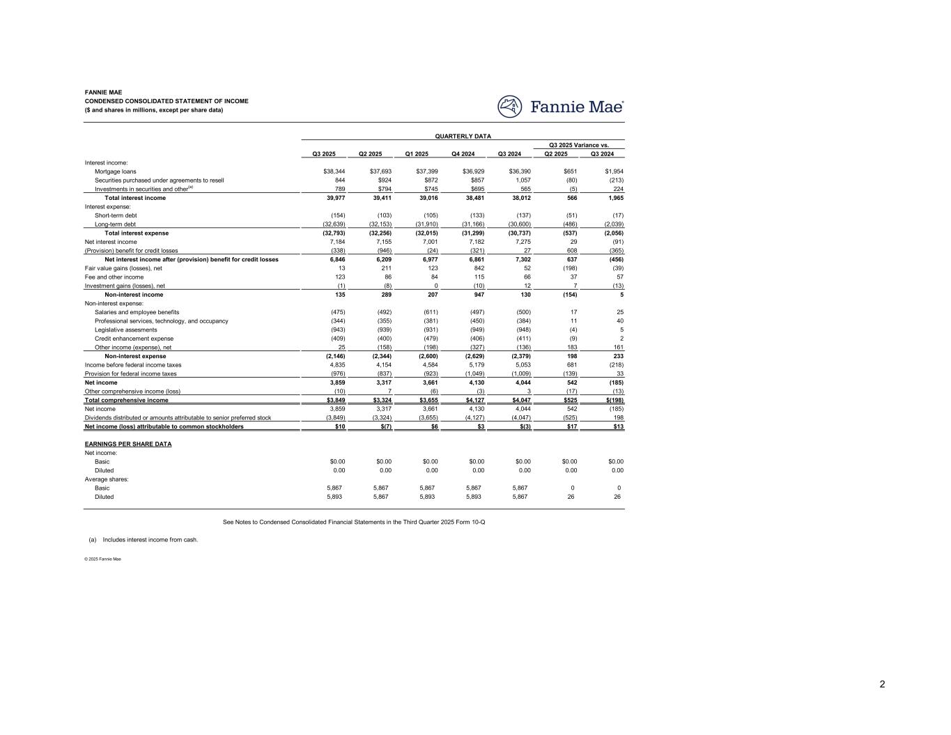 Q3 2025 Q2 2025 Q1 2025 Q4 2024 Q3 2024 Q2 2025 Q3 2024 $38,344 $37,693 $37,399 $36,929 $36,390 $651 $1,954 844 $924 $872 $857 1,057 (80) (213) 789 $794 $745 $695 565 (5) 224 39,977 39,411 39,016 38,481 38,012 566 1,965 (154) (103) (105) (133) (137) (51) (17) (32,639) (32,153) (31,910) (31,166) (30,600) (486) (2,039) (32,793) (32,256) (32,015) (31,299) (30,737) (537) (2,056) 7,184 7,155 7,001 7,182 7,275 29 (91) (338) (946) (24) (321) 27 608 (365) 6,846 6,209 6,977 6,861 7,302 637 (456) 13 211 123 842 52 (198) (39) 123 86 84 115 66 37 57 (1) (8) 0 (10) 12 7 (13) 135 289 207 947 130 (154) 5 (475) (492) (611) (497) (500) 17 25 (344) (355) (381) (450) (384) 11 40 (943) (939) (931) (949) (948) (4) 5 (409) (400) (479) (406) (411) (9) 2 25 (158) (198) (327) (136) 183 161 (2,146) (2,344) (2,600) (2,629) (2,379) 198 233 4,835 4,154 4,584 5,179 5,053 681 (218) (976) (837) (923) (1,049) (1,009) (139) 33 3,859 3,317 3,661 4,130 4,044 542 (185) (10) 7 (6) (3) 3 (17) (13) $3,849 $3,324 $3,655 $4,127 $4,047 $525 $(198) 3,859 3,317 3,661 4,130 4,044 542 (185) (3,849) (3,324) (3,655) (4,127) (4,047) (525) 198 $10 $(7) $6 $3 $(3) $17 $13 $0.00 $0.00 $0.00 $0.00 $0.00 $0.00 $0.00 0.00 0.00 0.00 0.00 0.00 0.00 0.00 5,867 5,867 5,867 5,867 5,867 0 0 5,893 5,867 5,893 5,893 5,867 26 26 (a) Basic Average shares: Diluted © 2025 Fannie Mae See Notes to Condensed Consolidated Financial Statements in the Third Quarter 2025 Form 10-Q Includes interest income from cash. Net income (loss) attributable to common stockholders EARNINGS PER SHARE DATA Net income: Diluted Basic Net income Provision for federal income taxes Other comprehensive income (loss) Total comprehensive income Dividends distributed or amounts attributable to senior preferred stock Net income Legislative assesments Professional services, technology, and occupancy Credit enhancement expense Other income (expense), net Income before federal income taxes Non-interest expense Fee and other income Fair value gains (losses), net Investment gains (losses), net Non-interest income Salaries and employee benefits Non-interest expense: Long-term debt Short-term debt Total interest expense Net interest income Net interest income after (provision) benefit for credit losses (Provision) benefit for credit losses Mortgage loans Interest income: Securities purchased under agreements to resell Investments in securities and other (a) Interest expense: Total interest income CONDENSED CONSOLIDATED STATEMENT OF INCOME FANNIE MAE ($ and shares in millions, except per share data) Q3 2025 Variance vs. QUARTERLY DATA 2
