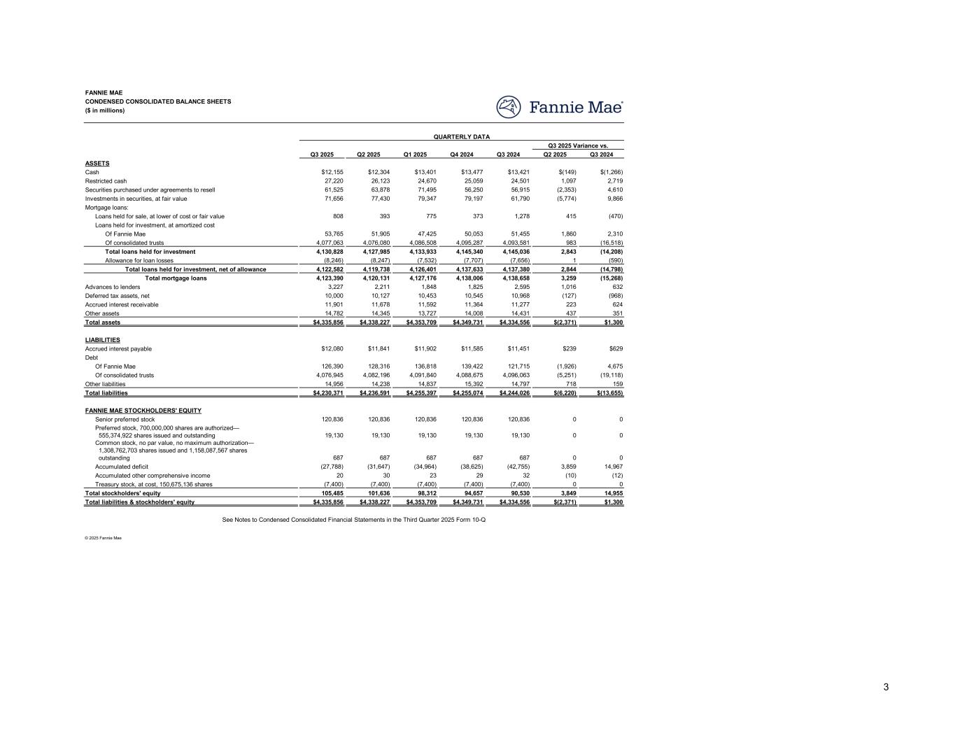 Q3 2025 Q2 2025 Q1 2025 Q4 2024 Q3 2024 Q2 2025 Q3 2024 $12,155 $12,304 $13,401 $13,477 $13,421 $(149) $(1,266) 27,220 26,123 24,670 25,059 24,501 1,097 2,719 61,525 63,878 71,495 56,250 56,915 (2,353) 4,610 71,656 77,430 79,347 79,197 61,790 (5,774) 9,866 808 393 775 373 1,278 415 (470) 53,765 51,905 47,425 50,053 51,455 1,860 2,310 4,077,063 4,076,080 4,086,508 4,095,287 4,093,581 983 (16,518) 4,130,828 4,127,985 4,133,933 4,145,340 4,145,036 2,843 (14,208) (8,246) (8,247) (7,532) (7,707) (7,656) 1 (590) 4,122,582 4,119,738 4,126,401 4,137,633 4,137,380 2,844 (14,798) 4,123,390 4,120,131 4,127,176 4,138,006 4,138,658 3,259 (15,268) 3,227 2,211 1,848 1,825 2,595 1,016 632 10,000 10,127 10,453 10,545 10,968 (127) (968) 11,901 11,678 11,592 11,364 11,277 223 624 14,782 14,345 13,727 14,008 14,431 437 351 Total assets $4,335,856 $4,338,227 $4,353,709 $4,349,731 $4,334,556 $(2,371) $1,300 $12,080 $11,841 $11,902 $11,585 $11,451 $239 $629 126,390 128,316 136,818 139,422 121,715 (1,926) 4,675 4,076,945 4,082,196 4,091,840 4,088,675 4,096,063 (5,251) (19,118) 14,956 14,238 14,837 15,392 14,797 718 159 Total liabilities $4,230,371 $4,236,591 $4,255,397 $4,255,074 $4,244,026 $(6,220) $(13,655) 120,836 120,836 120,836 120,836 120,836 0 0 19,130 19,130 19,130 19,130 19,130 0 0 687 687 687 687 687 0 0 (27,788) (31,647) (34,964) (38,625) (42,755) 3,859 14,967 20 30 23 29 32 (10) (12) (7,400) (7,400) (7,400) (7,400) (7,400) 0 0 Total stockholders' equity 105,485 101,636 98,312 94,657 90,530 3,849 14,955 Total liabilities & stockholders' equity $4,335,856 $4,338,227 $4,353,709 $4,349,731 $4,334,556 $(2,371) $1,300 © 2025 Fannie Mae See Notes to Condensed Consolidated Financial Statements in the Third Quarter 2025 Form 10-Q Other liabilities Of consolidated trusts Senior preferred stock FANNIE MAE STOCKHOLDERS' EQUITY Common stock, no par value, no maximum authorization— 1,308,762,703 shares issued and 1,158,087,567 shares outstanding Preferred stock, 700,000,000 shares are authorized— 555,374,922 shares issued and outstanding Accumulated deficit Accumulated other comprehensive income Treasury stock, at cost, 150,675,136 shares LIABILITIES Accrued interest payable Of Fannie Mae Debt Total mortgage loans Total loans held for investment, net of allowance Advances to lenders Deferred tax assets, net Other assets Accrued interest receivable Loans held for investment, at amortized cost Loans held for sale, at lower of cost or fair value Of Fannie Mae Of consolidated trusts Allowance for loan losses Total loans held for investment Cash ASSETS Restricted cash Securities purchased under agreements to resell Mortgage loans: Investments in securities, at fair value CONDENSED CONSOLIDATED BALANCE SHEETS FANNIE MAE ($ in millions) Q3 2025 Variance vs. QUARTERLY DATA 3
