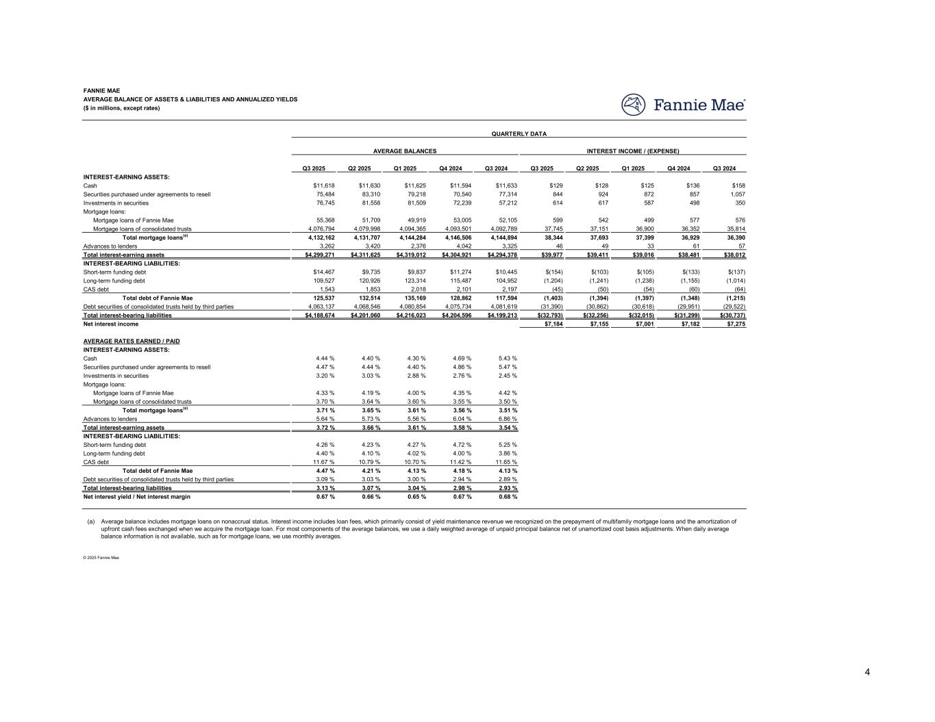 Q3 2025 Q2 2025 Q1 2025 Q4 2024 Q3 2024 Q3 2025 Q2 2025 Q1 2025 Q4 2024 Q3 2024 $11,618 $11,630 $11,625 $11,594 $11,633 $129 $128 $125 $136 $158 75,484 83,310 79,218 70,540 77,314 844 924 872 857 1,057 76,745 81,558 81,509 72,239 57,212 614 617 587 498 350 55,368 51,709 49,919 53,005 52,105 599 542 499 577 576 4,076,794 4,079,998 4,094,365 4,093,501 4,092,789 37,745 37,151 36,900 36,352 35,814 4,132,162 4,131,707 4,144,284 4,146,506 4,144,894 38,344 37,693 37,399 36,929 36,390 3,262 3,420 2,376 4,042 3,325 46 49 33 61 57 Total interest-earning assets $4,299,271 $4,311,625 $4,319,012 $4,304,921 $4,294,378 $39,977 $39,411 $39,016 $38,481 $38,012 $14,467 $9,735 $9,837 $11,274 $10,445 $(154) $(103) $(105) $(133) $(137) 109,527 120,926 123,314 115,487 104,952 (1,204) (1,241) (1,238) (1,155) (1,014) 1,543 1,853 2,018 2,101 2,197 (45) (50) (54) (60) (64) 125,537 132,514 135,169 128,862 117,594 (1,403) (1,394) (1,397) (1,348) (1,215) 4,063,137 4,068,546 4,080,854 4,075,734 4,081,619 (31,390) (30,862) (30,618) (29,951) (29,522) Total interest-bearing liabilities $4,188,674 $4,201,060 $4,216,023 $4,204,596 $4,199,213 $(32,793) $(32,256) $(32,015) $(31,299) $(30,737) $7,184 $7,155 $7,001 $7,182 $7,275 4.44 % 4.40 % 4.30 % 4.69 % 5.43 % 4.47 % 4.44 % 4.40 % 4.86 % 5.47 % 3.20 % 3.03 % 2.88 % 2.76 % 2.45 % 4.33 % 4.19 % 4.00 % 4.35 % 4.42 % 3.70 % 3.64 % 3.60 % 3.55 % 3.50 % 3.71 % 3.65 % 3.61 % 3.56 % 3.51 % 5.64 % 5.73 % 5.56 % 6.04 % 6.86 % Total interest-earning assets 3.72 % 3.66 % 3.61 % 3.58 % 3.54 % 4.26 % 4.23 % 4.27 % 4.72 % 5.25 % 4.40 % 4.10 % 4.02 % 4.00 % 3.86 % 11.67 % 10.79 % 10.70 % 11.42 % 11.65 % 4.47 % 4.21 % 4.13 % 4.18 % 4.13 % 3.09 % 3.03 % 3.00 % 2.94 % 2.89 % Total interest-bearing liabilities 3.13 % 3.07 % 3.04 % 2.98 % 2.93 % 0.67 % 0.66 % 0.65 % 0.67 % 0.68 % (a) Net interest yield / Net interest margin © 2025 Fannie Mae Average balance includes mortgage loans on nonaccrual status. Interest income includes loan fees, which primarily consist of yield maintenance revenue we recognized on the prepayment of multifamily mortgage loans and the amortization of upfront cash fees exchanged when we acquire the mortgage loan. For most components of the average balances, we use a daily weighted average of unpaid principal balance net of unamortized cost basis adjustments. When daily average balance information is not available, such as for mortgage loans, we use monthly averages. INTEREST-BEARING LIABILITIES: Short-term funding debt CAS debt Long-term funding debt Debt securities of consolidated trusts held by third parties Total debt of Fannie Mae Mortgage loans: Mortgage loans of Fannie Mae Total mortgage loans (a) Mortgage loans of consolidated trusts Advances to lenders AVERAGE RATES EARNED / PAID Cash INTEREST-EARNING ASSETS: INTEREST INCOME / (EXPENSE) Investments in securities Securities purchased under agreements to resell Long-term funding debt CAS debt Debt securities of consolidated trusts held by third parties Total debt of Fannie Mae Net interest income Mortgage loans of consolidated trusts Total mortgage loans (a) Advances to lenders Short-term funding debt INTEREST-BEARING LIABILITIES: INTEREST-EARNING ASSETS: Cash Investments in securities Securities purchased under agreements to resell Mortgage loans of Fannie Mae Mortgage loans: FANNIE MAE AVERAGE BALANCE OF ASSETS & LIABILITIES AND ANNUALIZED YIELDS ($ in millions, except rates) QUARTERLY DATA AVERAGE BALANCES 4
