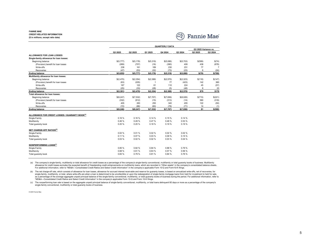Q3 2025 Q2 2025 Q1 2025 Q4 2024 Q3 2024 Q2 2025 Q3 2024 $(5,777) $(5,178) $(5,319) $(5,086) $(5,703) $(599) $(74) (269) (707) (16) (390) 409 438 (678) 238 161 189 230 231 77 7 (47) (53) (32) (73) (23) 6 (24) $(5,855) $(5,777) $(5,178) $(5,319) $(5,086) $(78) $(769) $(2,470) $(2,354) $(2,388) $(2,570) $(2,323) $(116) $(147) (63) (205) 1 77 (423) 142 360 167 122 61 110 224 45 (57) (25) (33) (28) (5) (48) 8 23 $(2,391) $(2,470) $(2,354) $(2,388) $(2,570) $79 $179 $(8,247) $(7,532) $(7,707) $(7,656) $(8,026) $(715) $(221) (332) (912) (15) (313) (14) 580 (318) 405 283 250 340 455 122 (50) (72) (86) (60) (78) (71) 14 (1) $(8,246) $(8,247) $(7,532) $(7,707) $(7,656) $1 $(590) 0.16 % 0.16 % 0.14 % 0.15 % 0.14 % 0.46 % 0.49 % 0.47 % 0.48 % 0.53 % 0.20 % 0.20 % 0.18 % 0.19 % 0.19 % 0.02 % 0.01 % 0.02 % 0.02 % 0.02 % 0.11 % 0.07 % 0.03 % 0.09 % 0.15 % 0.03 % 0.02 % 0.02 % 0.03 % 0.04 % 0.85 % 0.82 % 0.84 % 0.88 % 0.79 % 0.68 % 0.61 % 0.63 % 0.57 % 0.56 % 0.83 % 0.79 % 0.81 % 0.84 % 0.76 % (a) (b) (c) © 2025 Fannie Mae The nonperforming loan rate is based on the aggregate unpaid principal balance of single-family conventional, multifamily, or total loans delinquent 60 days or more as a percentage of the company's single-family conventional, multifamily or total guaranty books of business. The net charge-off rate, which consists of allowance for loan losses, allowance for accrued interest receivable and reserve for guaranty losses, is based on annualized write-offs, net of recoveries, for single-family, multifamily, or total, where write-offs are when a loan is determined to be uncollectible or upon the redesignation of single-family mortgage loans from held for investment to held for sale, as a percentage of the average aggregate unpaid principal balance of the single-family conventional, multifamily, or total guaranty books of business during the period. For additional information, refer to “MD&A—Consolidated Credit Ratios and Select Credit Information” in the company's applicable Form 10-Q and Form 10-K filings. The company's single-family, multifamily or total allowance for credit losses as a percentage of the company's single-family conventional, multifamily or total guaranty books of business. Multifamily allowance for credit losses excludes the expected benefit of freestanding credit enhancements on multifamily loans, which are recorded in “Other assets” in the company's consolidated balance sheets. For additional information, refer to “MD&A—Consolidated Credit Ratios and Select Credit Information” in the company’s applicable Form 10-Q and Form10-K filings. NET CHARGE-OFF RATIOS (b) Single-Family Multifamily Total guaranty book Single-Family NONPERFORMING LOANS (c) Multifamily Total guaranty book Ending balance ALLOWANCE FOR CREDIT LOSSES / GUARANTY BOOK (a) Single-Family Total guaranty book Multifamily Total allowance for loan losses: Ending balance Beginning balance (Provision) benefit for loan losses Recoveries Write-offs Multifamily allowance for loan losses: Ending balance Beginning balance (Provision) benefit for loan losses Recoveries Write-offs Single-family allowance for loan losses: ALLOWANCE FOR LOAN LOSSES Beginning balance (Provision) benefit for loan losses Recoveries Write-offs CREDIT-RELATED INFORMATION FANNIE MAE ($ in millions, except ratio data) Q3 2025 Variance vs. QUARTERLY DATA 5