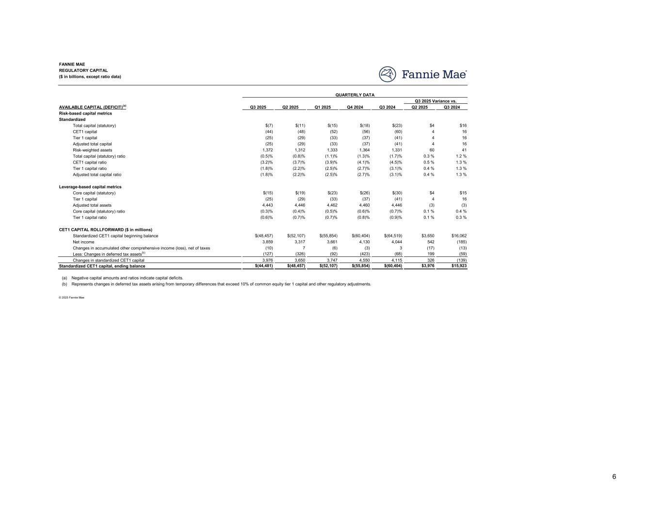Q3 2025 Q2 2025 Q1 2025 Q4 2024 Q3 2024 Q2 2025 Q3 2024 $(7) $(11) $(15) $(18) $(23) $4 $16 (44) (48) (52) (56) (60) 4 16 (25) (29) (33) (37) (41) 4 16 (25) (29) (33) (37) (41) 4 16 1,372 1,312 1,333 1,364 1,331 60 41 (0.5)% (0.8)% (1.1)% (1.3)% (1.7)% 0.3 % 1.2 % (3.2)% (3.7)% (3.9)% (4.1)% (4.5)% 0.5 % 1.3 % (1.8)% (2.2)% (2.5)% (2.7)% (3.1)% 0.4 % 1.3 % (1.8)% (2.2)% (2.5)% (2.7)% (3.1)% 0.4 % 1.3 % $(15) $(19) $(23) $(26) $(30) $4 $15 (25) (29) (33) (37) (41) 4 16 4,443 4,446 4,462 4,460 4,446 (3) (3) (0.3)% (0.4)% (0.5)% (0.6)% (0.7)% 0.1 % 0.4 % (0.6)% (0.7)% (0.7)% (0.8)% (0.9)% 0.1 % 0.3 % $(48,457) $(52,107) $(55,854) $(60,404) $(64,519) $3,650 $16,062 3,859 3,317 3,661 4,130 4,044 542 (185) (10) 7 (6) (3) 3 (17) (13) (127) (326) (92) (423) (68) 199 (59) 3,976 3,650 3,747 4,550 4,115 326 (139) Standardized CET1 capital, ending balance $(44,481) $(48,457) $(52,107) $(55,854) $(60,404) $3,976 $15,923 (a) (b) Negative capital amounts and ratios indicate capital deficits. Represents changes in deferred tax assets arising from temporary differences that exceed 10% of common equity tier 1 capital and other regulatory adjustments. Changes in standardized CET1 capital © 2025 Fannie Mae CET1 CAPITAL ROLLFORWARD ($ in millions) Standardized CET1 capital beginning balance Net income Less: Changes in deferred tax assets (b) Changes in accumulated other comprehensive income (loss), net of taxes Core capital (statutory) Leverage-based capital metrics Tier 1 capital Adjusted total assets Tier 1 capital ratio Core capital (statutory) ratio Total capital (statutory) ratio Risk-weighted assets CET1 capital ratio Tier 1 capital ratio Adjusted total capital ratio Standardized Risk-based capital metrics Total capital (statutory) CET1 capital Adjusted total capital Tier 1 capital REGULATORY CAPITAL FANNIE MAE ($ in billions, except ratio data) AVAILABLE CAPITAL (DEFICIT) (a) Q3 2025 Variance vs. QUARTERLY DATA 6