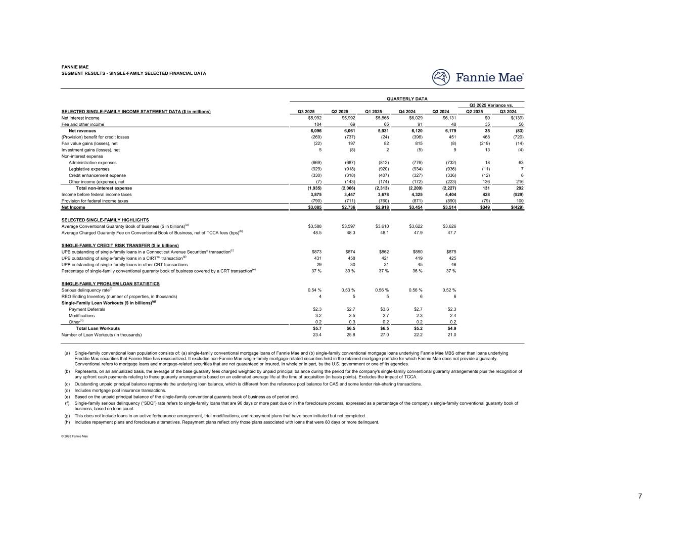 Q3 2025 Q2 2025 Q1 2025 Q4 2024 Q3 2024 Q2 2025 Q3 2024 $5,992 $5,992 $5,866 $6,029 $6,131 $0 $(139) 104 69 65 91 48 35 56 6,096 6,061 5,931 6,120 6,179 35 (83) (269) (737) (24) (396) 451 468 (720) (22) 197 82 815 (8) (219) (14) 5 (8) 2 (5) 9 13 (4) (669) (687) (812) (776) (732) 18 63 (929) (918) (920) (934) (936) (11) 7 (330) (318) (407) (327) (336) (12) 6 (7) (143) (174) (172) (223) 136 216 (1,935) (2,066) (2,313) (2,209) (2,227) 131 292 3,875 3,447 3,678 4,325 4,404 428 (529) (790) (711) (760) (871) (890) (79) 100 $3,085 $2,736 $2,918 $3,454 $3,514 $349 $(429) $3,588 $3,597 $3,610 $3,622 $3,626 48.5 48.3 48.1 47.9 47.7 $873 $874 $862 $850 $875 431 458 421 419 425 29 30 31 45 46 37 % 39 % 37 % 36 % 37 % 0.54 % 0.53 % 0.56 % 0.56 % 0.52 % 4 5 5 6 6 $2.3 $2.7 $3.6 $2.7 $2.3 3.2 3.5 2.7 2.3 2.4 0.2 0.3 0.2 0.2 0.2 $5.7 $6.5 $6.5 $5.2 $4.9 23.4 25.8 27.0 22.2 21.0 (a) (b) (c) (d) (e) (f) (g) (h) © 2025 Fannie Mae Based on the unpaid principal balance of the single-family conventional guaranty book of business as of period end. Single-family serious delinquency (“SDQ”) rate refers to single-family loans that are 90 days or more past due or in the foreclosure process, expressed as a percentage of the company’s single-family conventional guaranty book of business, based on loan count. Includes repayment plans and foreclosure alternatives. Repayment plans reflect only those plans associated with loans that were 60 days or more delinquent. This does not include loans in an active forbearance arrangement, trial modifications, and repayment plans that have been initiated but not completed. UPB outstanding of single-family loans in a CIRTTM transaction (d) Percentage of single-family conventional guaranty book of business covered by a CRT transaction (e) UPB outstanding of single-family loans in other CRT transactions Includes mortgage pool insurance transactions. Outstanding unpaid principal balance represents the underlying loan balance, which is different from the reference pool balance for CAS and some lender risk-sharing transactions. Represents, on an annualized basis, the average of the base guaranty fees charged weighted by unpaid principal balance during the period for the company's single-family conventional guaranty arrangements plus the recognition of any upfront cash payments relating to these guaranty arrangements based on an estimated average life at the time of acquisition (in basis points). Excludes the impact of TCCA. Single-family conventional loan population consists of: (a) single-family conventional mortgage loans of Fannie Mae and (b) single-family conventional mortgage loans underlying Fannie Mae MBS other than loans underlying Freddie Mac securities that Fannie Mae has resecuritized. It excludes non-Fannie Mae single-family mortgage-related securities held in the retained mortgage portfolio for which Fannie Mae does not provide a guaranty. Conventional refers to mortgage loans and mortgage-related securities that are not guaranteed or insured, in whole or in part, by the U.S. government or one of its agencies. SINGLE-FAMILY PROBLEM LOAN STATISTICS Serious delinquency rate (f) REO Ending Inventory (number of properties, in thousands) Payment Deferrals Single-Family Loan Workouts ($ in billions) (g) Other (h) Modifications Total Loan Workouts Number of Loan Workouts (in thousands) SELECTED SINGLE-FAMILY HIGHLIGHTS Average Charged Guaranty Fee on Conventional Book of Business, net of TCCA fees (bps) (b) Average Conventional Guaranty Book of Business ($ in billions) (a) SINGLE-FAMILY CREDIT RISK TRANSFER ($ in billions) UPB outstanding of single-family loans in a Connecticut Avenue Securities® transaction (c) Credit enhancement expense Other income (expense), net Income before federal income taxes Total non-interest expense Net Income Provision for federal income taxes Fair value gains (losses), net Non-interest expense Investment gains (losses), net Legislative expenses Administrative expenses Q3 2025 Variance vs. QUARTERLY DATA Net revenues Fee and other income (Provision) benefit for credit losses SEGMENT RESULTS - SINGLE-FAMILY SELECTED FINANCIAL DATA FANNIE MAE Net interest income SELECTED SINGLE-FAMILY INCOME STATEMENT DATA ($ in millions) 7