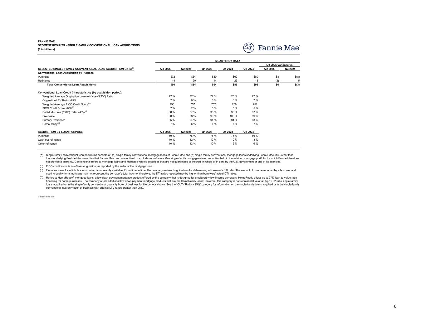 Q3 2025 Q2 2025 Q1 2025 Q4 2024 Q3 2024 Q2 2025 Q3 2024 $72 $64 $50 $62 $80 $8 $(8) 18 20 14 23 13 (2) 5 $90 $84 $64 $85 $93 $6 $(3) 77 % 77 % 77 % 76 % 77 % 7 % 6 % 6 % 6 % 7 % 756 757 757 758 759 7 % 7 % 6 % 5 % 5 % 38 % 37 % 38 % 35 % 37 % 98 % 98 % 99 % 100 % 99 % 95 % 94 % 94 % 94 % 93 % 7 % 6 % 6 % 6 % 7 % Q3 2025 Q2 2025 Q1 2025 Q4 2024 Q3 2024 80 % 76 % 78 % 74 % 86 % 10 % 12 % 12 % 10 % 8 % 10 % 12 % 10 % 16 % 6 % (a) (b) (c) (d) Excludes loans for which this information is not readily available. From time to time, the company revises its guidelines for determining a borrower's DTI ratio. The amount of income reported by a borrower and used to qualify for a mortgage may not represent the borrower's total income; therefore, the DTI ratios reported may be higher than borrowers' actual DTI ratios. FICO credit score is as of loan origination, as reported by the seller of the mortgage loan. Refers to HomeReady ® mortgage loans, a low down payment mortgage product offered by the company that is designed for creditworthy low-income borrowers. HomeReady allows up to 97% loan-to-value ratio financing for home purchases. The company offers additional low down payment mortgage products that are not HomeReady loans; therefore, this category is not representative of all high LTV ratio single-family loans acquired or in the single-family conventional guaranty book of business for the periods shown. See the “OLTV Ratio > 95%” category for information on the single-family loans acquired or in the single-family conventional guaranty book of business with original LTV ratios greater than 95%. © 2025 Fannie Mae ACQUISITION BY LOAN PURPOSE Cash-out refinance Purchase Other refinance Single-family conventional loan population consists of: (a) single-family conventional mortgage loans of Fannie Mae and (b) single-family conventional mortgage loans underlying Fannie Mae MBS other than loans underlying Freddie Mac securities that Fannie Mae has resecuritized. It excludes non-Fannie Mae single-family mortgage-related securities held in the retained mortgage portfolio for which Fannie Mae does not provide a guaranty. Conventional refers to mortgage loans and mortgage-related securities that are not guaranteed or insured, in whole or in part, by the U.S. government or one of its agencies. FICO Credit Score <680 (b) Fixed-rate Debt-to-Income (“DTI”) Ratio >43% (c) HomeReady (d) Primary Residence Total Conventional Loan Acquisitions Conventional Loan Credit Characteristics (by acquisition period): Origination LTV Ratio >95% Weighted Average Origination Loan-to-Value (“LTV”) Ratio Weighted-Average FICO Credit Score (b) Q3 2025 Variance vs. QUARTERLY DATA Purchase Conventional Loan Acquisition by Purpose: Refinance SEGMENT RESULTS - SINGLE-FAMILY CONVENTIONAL LOAN ACQUISITIONS FANNIE MAE ($ in billions) SELECTED SINGLE-FAMILY CONVENTIONAL LOAN ACQUISITION DATA (a) 8