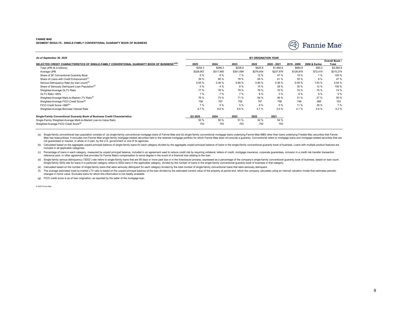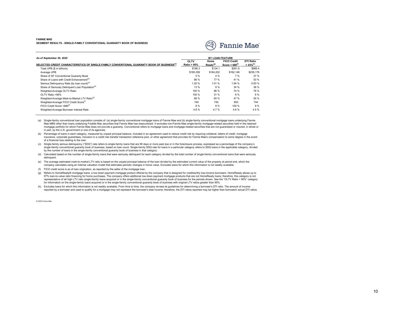 OLTV Ratio > 95% Home Ready (g) FICO Credit Score < 680 (f) DTI Ratio > 43% (h) $186.3 $134.1 $261.6 $966.4 $185,359 $184,202 $162,146 $239,176 5 % 4 % 7 % 27 % 86 % 77 % 41 % 53 % 1.20 % 1.01 % 1.94 % 0.83 % 13 % 8 % 34 % 36 % 100 % 86 % 74 % 76 % 100 % 31 % 6 % 6 % 68 % 65 % 47 % 55 % 740 745 653 744 8 % 8 % 100 % 9 % 4.8 % 4.7 % 4.6 % 4.5 % (a) (b) (c) (d) (e) (f) (g) (h) Single-family conventional loan population consists of: (a) single-family conventional mortgage loans of Fannie Mae and (b) single-family conventional mortgage loans underlying Fannie Mae MBS other than loans underlying Freddie Mac securities that Fannie Mae has resecuritized. It excludes non-Fannie Mae single-family mortgage-related securities held in the retained mortgage portfolio for which Fannie Mae does not provide a guaranty. Conventional refers to mortgage loans and mortgage-related securities that are not guaranteed or insured, in whole or in part, by the U.S. government or one of its agencies. Percentage of loans in each category, measured by unpaid principal balance, included in an agreement used to reduce credit risk by requiring collateral, letters of credit, mortgage insurance, corporate guarantees, inclusion in a credit risk transfer transaction reference pool, or other agreement that provides for Fannie Mae's compensation to some degree in the event of a financial loss relating to the loan. Single-family serious delinquency (“SDQ”) rate refers to single-family loans that are 90 days or more past due or in the foreclosure process, expressed as a percentage of the company’s single-family conventional guaranty book of business, based on loan count. Single-family SDQ rate for loans in a particular category refers to SDQ loans in the applicable category, divided by the number of loans in the single-family conventional guaranty book of business in that category. Calculated based on the number of single-family loans that were seriously delinquent for each category divided by the total number of single-family conventional loans that were seriously delinquent. © 2025 Fannie Mae Refers to HomeReady® mortgage loans, a low down payment mortgage product offered by the company that is designed for creditworthy low-income borrowers. HomeReady allows up to 97% loan-to-value ratio financing for home purchases. The company offers additional low down payment mortgage products that are not HomeReady loans; therefore, this category is not representative of all high LTV ratio single-family loans acquired or in the single-family conventional guaranty book of business for the periods shown. See the “OLTV Ratio > 95%” category for information on the single-family loans acquired or in the single-family conventional guaranty book of business with original LTV ratios greater than 95%. Excludes loans for which this information is not readily available. From time to time, the company revises its guidelines for determining a borrower's DTI ratio. The amount of income reported by a borrower and used to qualify for a mortgage may not represent the borrower's total income; therefore, the DTI ratios reported may be higher than borrowers' actual DTI ratios. The average estimated mark-to-market LTV ratio is based on the unpaid principal balance of the loan divided by the estimated current value of the property at period end, which the company calculates using an internal valuation model that estimates periodic changes in home value. Excludes loans for which this information is not readily available. FICO credit score is as of loan origination, as reported by the seller of the mortgage loan. Weighted-Average FICO Credit Score (f) Weighted-Average Mark-to-Market LTV Ratio (e) FICO Credit Score <680 (f) Weighted-Average Borrower Interest Rate Share of Loans with Credit Enhancement (b) Share of SF Conventional Guaranty Book Serious Delinquency Rate (by loan count) (c) Share of Seriously Delinquent Loan Population (d) OLTV Ratio >95% Weighted-Average OLTV Ratio FANNIE MAE SEGMENT RESULTS - SINGLE-FAMILY CONVENTIONAL GUARANTY BOOK OF BUSINESS As of September 30, 2025 SELECTED CREDIT CHARACTERISTICS OF SINGLE-FAMILY CONVENTIONAL GUARANTY BOOK OF BUSINESS (a) Average UPB Total UPB ($ in billions) BY LOAN FEATURE 10
