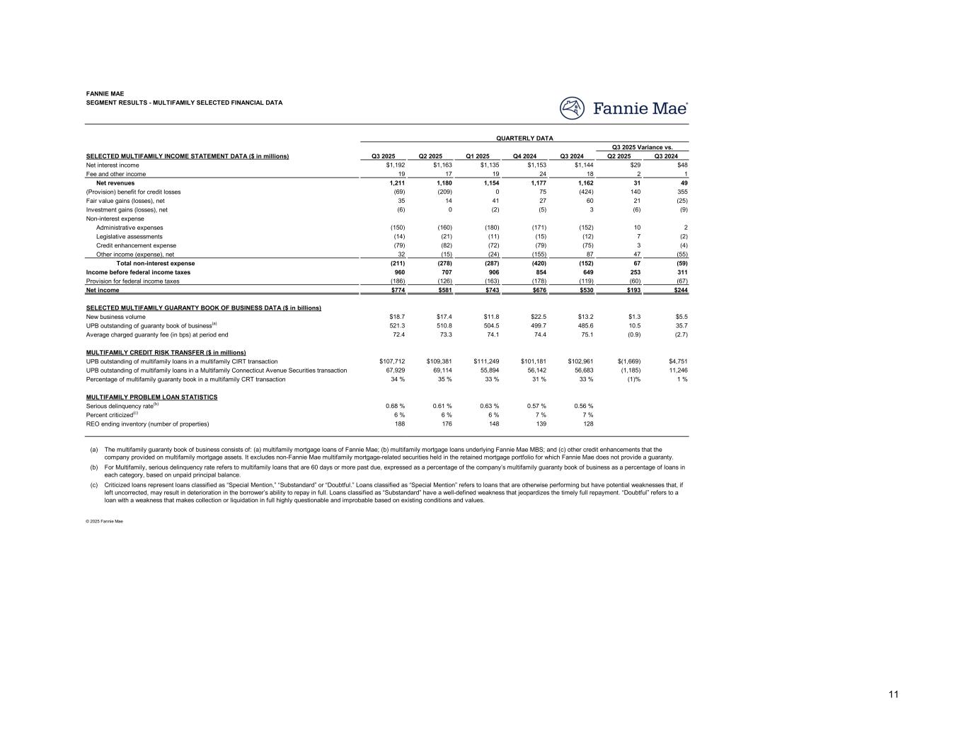 Q3 2025 Q2 2025 Q1 2025 Q4 2024 Q3 2024 Q2 2025 Q3 2024 $1,192 $1,163 $1,135 $1,153 $1,144 $29 $48 19 17 19 24 18 2 1 1,211 1,180 1,154 1,177 1,162 31 49 (69) (209) 0 75 (424) 140 355 35 14 41 27 60 21 (25) (6) 0 (2) (5) 3 (6) (9) (150) (160) (180) (171) (152) 10 2 (14) (21) (11) (15) (12) 7 (2) (79) (82) (72) (79) (75) 3 (4) 32 (15) (24) (155) 87 47 (55) (211) (278) (287) (420) (152) 67 (59) 960 707 906 854 649 253 311 (186) (126) (163) (178) (119) (60) (67) $774 $581 $743 $676 $530 $193 $244 $18.7 $17.4 $11.8 $22.5 $13.2 $1.3 $5.5 521.3 510.8 504.5 499.7 485.6 10.5 35.7 72.4 73.3 74.1 74.4 75.1 (0.9) (2.7) $107,712 $109,381 $111,249 $101,181 $102,961 $(1,669) $4,751 67,929 69,114 55,894 56,142 56,683 (1,185) 11,246 34 % 35 % 33 % 31 % 33 % (1)% 1 % 0.68 % 0.61 % 0.63 % 0.57 % 0.56 % 6 % 6 % 6 % 7 % 7 % 188 176 148 139 128 (a) (b) (c) © 2025 Fannie Mae UPB outstanding of multifamily loans in a multifamily CIRT transaction Percentage of multifamily guaranty book in a multifamily CRT transaction UPB outstanding of multifamily loans in a Multifamily Connecticut Avenue Securities transaction Criticized loans represent loans classified as “Special Mention,” “Substandard” or “Doubtful.” Loans classified as “Special Mention” refers to loans that are otherwise performing but have potential weaknesses that, if left uncorrected, may result in deterioration in the borrower’s ability to repay in full. Loans classified as “Substandard” have a well-defined weakness that jeopardizes the timely full repayment. “Doubtful” refers to a loan with a weakness that makes collection or liquidation in full highly questionable and improbable based on existing conditions and values. For Multifamily, serious delinquency rate refers to multifamily loans that are 60 days or more past due, expressed as a percentage of the company’s multifamily guaranty book of business as a percentage of loans in each category, based on unpaid principal balance. The multifamily guaranty book of business consists of: (a) multifamily mortgage loans of Fannie Mae; (b) multifamily mortgage loans underlying Fannie Mae MBS; and (c) other credit enhancements that the company provided on multifamily mortgage assets. It excludes non-Fannie Mae multifamily mortgage-related securities held in the retained mortgage portfolio for which Fannie Mae does not provide a guaranty. MULTIFAMILY PROBLEM LOAN STATISTICS Serious delinquency rate (b) Percent criticized (c) REO ending inventory (number of properties) SELECTED MULTIFAMILY GUARANTY BOOK OF BUSINESS DATA ($ in billions) UPB outstanding of guaranty book of business (a) New business volume Average charged guaranty fee (in bps) at period end MULTIFAMILY CREDIT RISK TRANSFER ($ in millions) Credit enhancement expense Other income (expense), net Income before federal income taxes Total non-interest expense Net income Provision for federal income taxes Fair value gains (losses), net Non-interest expense Investment gains (losses), net Legislative assessments Administrative expenses Q3 2025 Variance vs. QUARTERLY DATA Net revenues Fee and other income (Provision) benefit for credit losses SEGMENT RESULTS - MULTIFAMILY SELECTED FINANCIAL DATA FANNIE MAE Net interest income SELECTED MULTIFAMILY INCOME STATEMENT DATA ($ in millions) 11