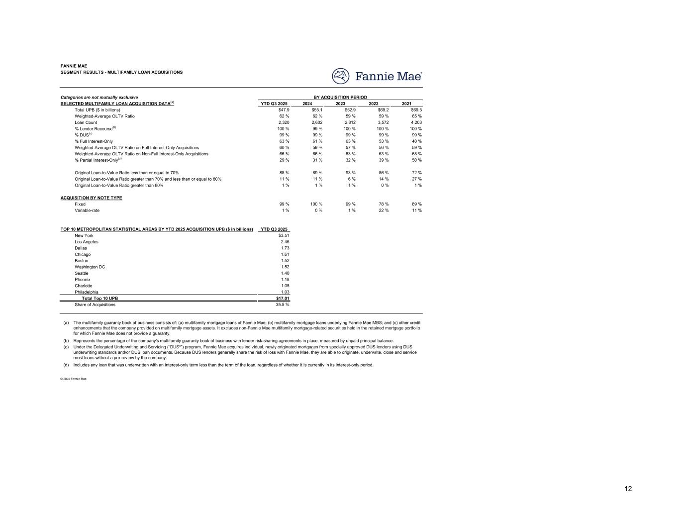 YTD Q3 2025 2024 2023 2022 2021 $47.9 $55.1 $52.9 $69.2 $69.5 62 % 62 % 59 % 59 % 65 % 2,320 2,602 2,812 3,572 4,203 100 % 99 % 100 % 100 % 100 % 99 % 99 % 99 % 99 % 99 % 63 % 61 % 63 % 53 % 40 % 60 % 59 % 57 % 56 % 59 % 66 % 66 % 63 % 63 % 68 % 29 % 31 % 32 % 39 % 50 % 88 % 89 % 93 % 86 % 72 % 11 % 11 % 6 % 14 % 27 % 1 % 1 % 1 % 0 % 1 % 99 % 100 % 99 % 78 % 89 % 1 % 0 % 1 % 22 % 11 % YTD Q3 2025 $3.51 2.46 1.73 1.61 1.52 1.52 1.40 1.18 1.05 1.03 $17.01 35.5 % (a) (b) (c) (d) Includes any loan that was underwritten with an interest-only term less than the term of the loan, regardless of whether it is currently in its interest-only period. © 2025 Fannie Mae The multifamily guaranty book of business consists of: (a) multifamily mortgage loans of Fannie Mae; (b) multifamily mortgage loans underlying Fannie Mae MBS; and (c) other credit enhancements that the company provided on multifamily mortgage assets. It excludes non-Fannie Mae multifamily mortgage-related securities held in the retained mortgage portfolio for which Fannie Mae does not provide a guaranty. Represents the percentage of the company's multifamily guaranty book of business with lender risk-sharing agreements in place, measured by unpaid principal balance. Under the Delegated Underwriting and Servicing (“DUS®”) program, Fannie Mae acquires individual, newly originated mortgages from specially approved DUS lenders using DUS underwriting standards and/or DUS loan documents. Because DUS lenders generally share the risk of loss with Fannie Mae, they are able to originate, underwrite, close and service most loans without a pre-review by the company. Phoenix Seattle Charlotte Philadelphia Share of Acquisitions Total Top 10 UPB Los Angeles New York Dallas Chicago Washington DC Boston Original Loan-to-Value Ratio greater than 80% Fixed ACQUISITION BY NOTE TYPE Variable-rate TOP 10 METROPOLITAN STATISTICAL AREAS BY YTD 2025 ACQUISITION UPB ($ in billions) Weighted-Average OLTV Ratio on Non-Full Interest-Only Acquisitions Weighted-Average OLTV Ratio on Full Interest-Only Acquisitions % Partial Interest-Only (d) Original Loan-to-Value Ratio less than or equal to 70% Original Loan-to-Value Ratio greater than 70% and less than or equal to 80% BY ACQUISITION PERIOD % Lender Recourse (b) Loan Count % DUS (c) % Full Interest-Only SEGMENT RESULTS - MULTIFAMILY LOAN ACQUISITIONS FANNIE MAE Categories are not mutually exclusive SELECTED MULTIFAMILY LOAN ACQUISITION DATA (a) Weighted-Average OLTV Ratio Total UPB ($ in billions) 12