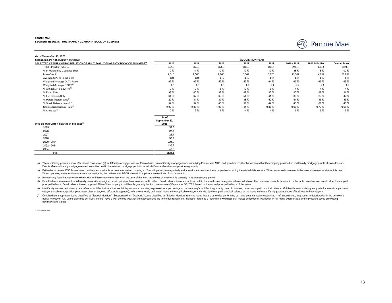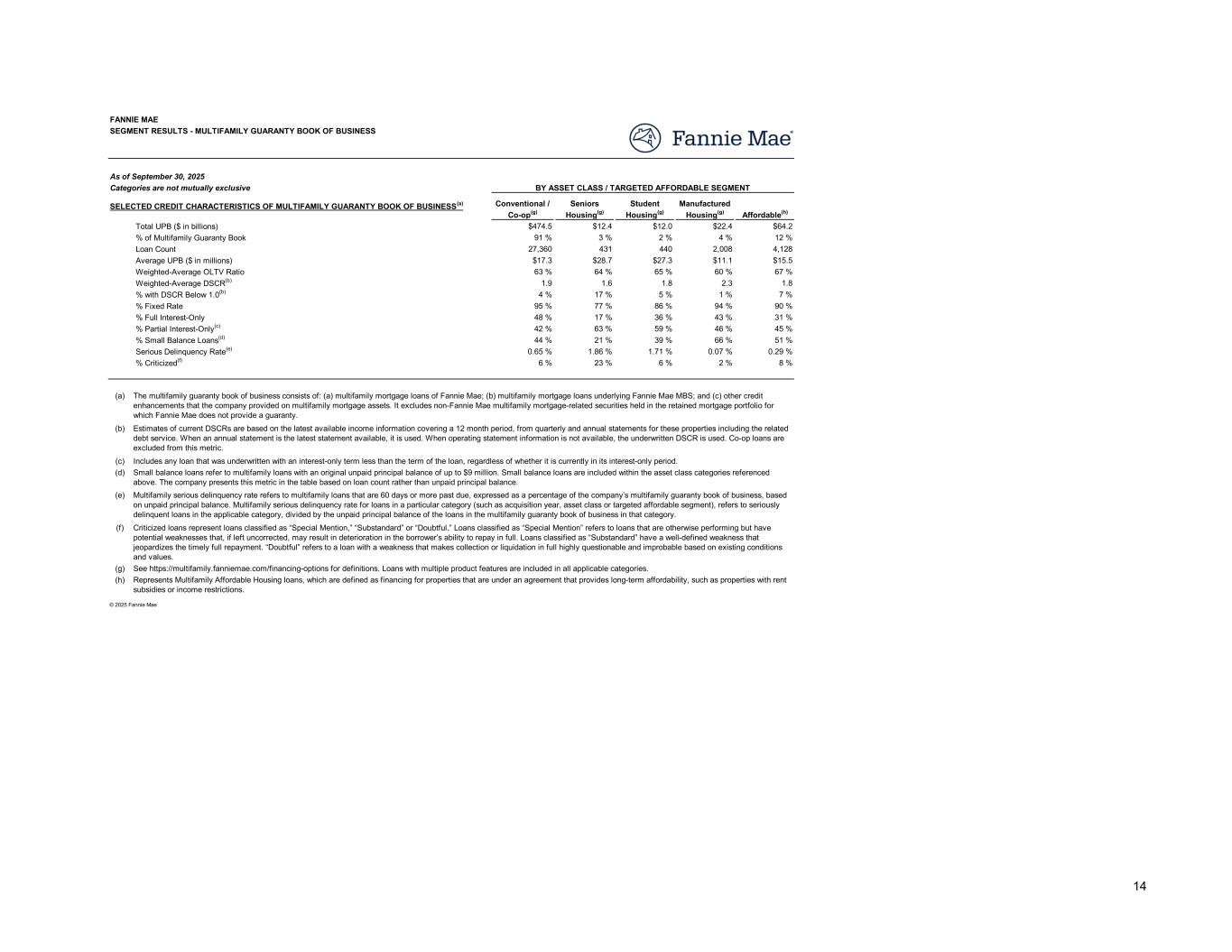 2025 2024 2023 2022 2021 2020 - 2017 2016 & Earlier Overall Book $47.9 $55.0 $51.9 $63.9 $63.7 $198.8 $40.1 $521.3 9 % 11 % 10 % 12 % 12 % 38 % 8 % 100 % 2,316 2,586 2,746 3,342 3,828 11,384 4,037 30,239 $21 $21 $19 $19 $17 $17 $10 $17 62 % 62 % 59 % 59 % 64 % 65 % 66 % 63 % 1.6 1.6 1.5 1.7 2.4 2.2 2.1 1.9 0 % 2 % 5 % 12 % 3 % 4 % 4 % 4 % 99 % 100 % 99 % 82 % 93 % 96 % 87 % 94 % 64 % 62 % 63 % 54 % 41 % 38 % 29 % 47 % 29 % 31 % 32 % 38 % 50 % 51 % 45 % 43 % 34 % 34 % 40 % 39 % 44 % 46 % 69 % 45 % 0.00 % 0.35 % 1.08 % 1.44 % 0.37 % 0.66 % 0.79 % 0.68 % 0 % 2 % 7 % 14 % 4 % 6 % 6 % 6 % As of September 30, 2025 $2.3 27.7 28.4 53.2 224.0 136.7 49.0 $521.3 (a) (b) (c) (d) (e) (f) Multifamily serious delinquency rate refers to multifamily loans that are 60 days or more past due, expressed as a percentage of the company’s multifamily guaranty book of business, based on unpaid principal balance. Multifamily serious delinquency rate for loans in a particular category (such as acquisition year, asset class or targeted affordable segment), refers to seriously delinquent loans in the applicable category, divided by the unpaid principal balance of the loans in the multifamily guaranty book of business in that category. Criticized loans represent loans classified as “Special Mention,” “Substandard” or “Doubtful.” Loans classified as “Special Mention” refers to loans that are otherwise performing but have potential weaknesses that, if left uncorrected, may result in deterioration in the borrower’s ability to repay in full. Loans classified as “Substandard” have a well-defined weakness that jeopardizes the timely full repayment. “Doubtful” refers to a loan with a weakness that makes collection or liquidation in full highly questionable and improbable based on existing conditions and values. © 2025 Fannie Mae Total Small balance loans refer to multifamily loans with an original unpaid principal balance of up to $9 million. Small balance loans are included within the asset class categories referenced above. The company presents this metric in the table based on loan count rather than unpaid principal balance. Small balance loans comprised 10% of the company's multifamily guaranty book of business as of September 30, 2025, based on the unpaid principal balance of the loans. Includes any loan that was underwritten with an interest-only term less than the term of the loan, regardless of whether it is currently in its interest-only period. The multifamily guaranty book of business consists of: (a) multifamily mortgage loans of Fannie Mae; (b) multifamily mortgage loans underlying Fannie Mae MBS; and (c) other credit enhancements that the company provided on multifamily mortgage assets. It excludes non- Fannie Mae multifamily mortgage-related securities held in the retained mortgage portfolio for which Fannie Mae does not provide a guaranty. Estimates of current DSCRs are based on the latest available income information covering a 12 month period, from quarterly and annual statements for these properties including the related debt service. When an annual statement is the latest statement available, it is used. When operating statement information is not available, the underwritten DSCR is used. Co-op loans are excluded from this metric. 2026 2027 2029 - 2031 2028 Other 2032 - 2034 % Small Balance Loans (d) Serious Delinquency Rate (e) % Criticized (f) 2025 UPB BY MATURITY YEAR ($ in billions) (a) Weighted-Average OLTV Ratio Weighted-Average DSCR (b) % Fixed Rate % with DSCR Below 1.0 (b) % Partial Interest-Only (c) % Full Interest-Only % of Multifamily Guaranty Book Total UPB ($ in billions) ACQUISITION YEAR Average UPB ($ in millions) Loan Count SEGMENT RESULTS - MULTIFAMILY GUARANTY BOOK OF BUSINESS FANNIE MAE As of September 30, 2025 SELECTED CREDIT CHARACTERISTICS OF MULTIFAMILY GUARANTY BOOK OF BUSINESS (a) Categories are not mutually exclusive 13