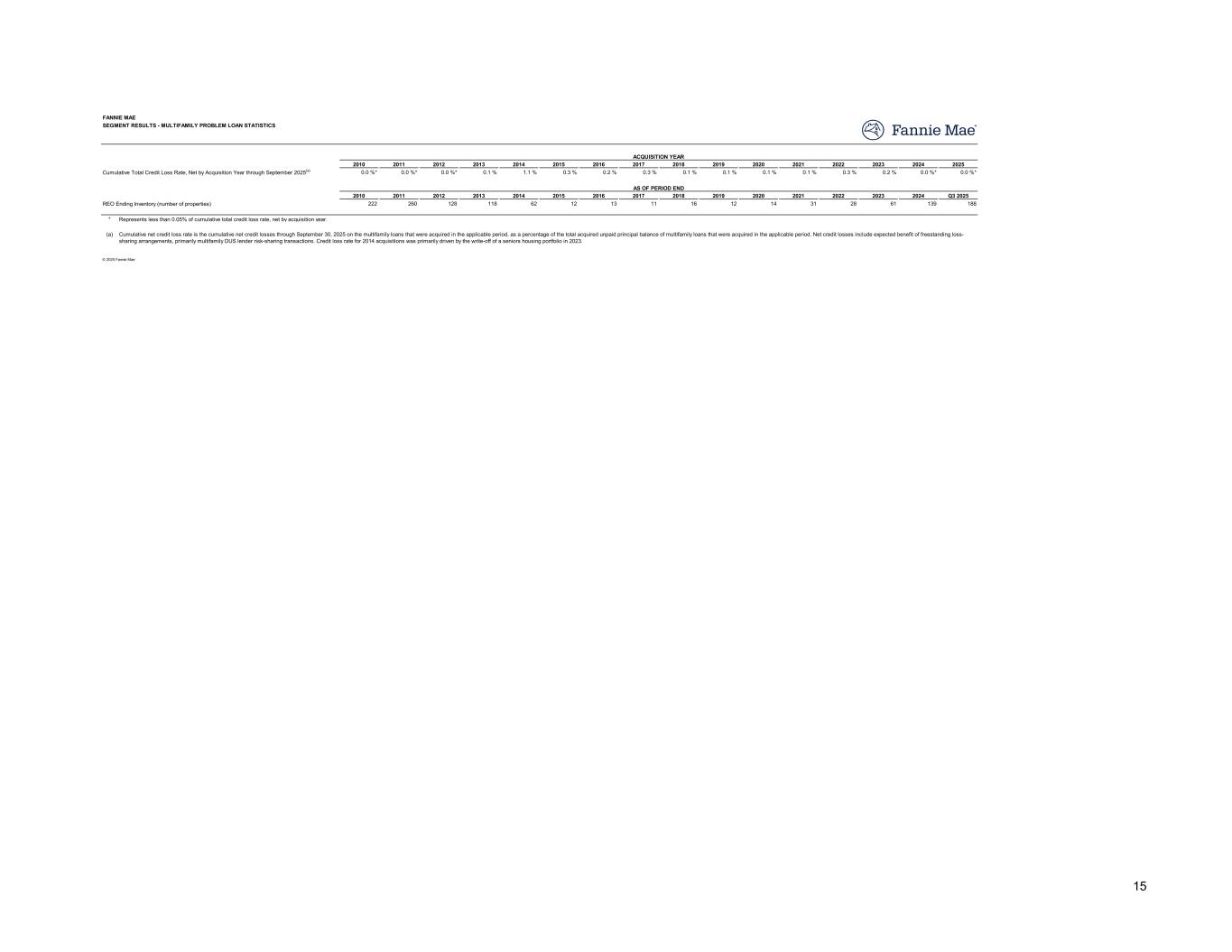 Conventional / Co-op (g) Seniors Housing (g) Student Housing (g) Manufactured Housing (g) Affordable (h) $474.5 $12.4 $12.0 $22.4 $64.2 91 % 3 % 2 % 4 % 12 % 27,360 431 440 2,008 4,128 $17.3 $28.7 $27.3 $11.1 $15.5 63 % 64 % 65 % 60 % 67 % 1.9 1.6 1.8 2.3 1.8 4 % 17 % 5 % 1 % 7 % 95 % 77 % 86 % 94 % 90 % 48 % 17 % 36 % 43 % 31 % 42 % 63 % 59 % 46 % 45 % 44 % 21 % 39 % 66 % 51 % 0.65 % 1.86 % 1.71 % 0.07 % 0.29 % 6 % 23 % 6 % 2 % 8 % (a) (b) (c) (d) (e) (f) (g) (h) Estimates of current DSCRs are based on the latest available income information covering a 12 month period, from quarterly and annual statements for these properties including the related debt service. When an annual statement is the latest statement available, it is used. When operating statement information is not available, the underwritten DSCR is used. Co-op loans are excluded from this metric. Includes any loan that was underwritten with an interest-only term less than the term of the loan, regardless of whether it is currently in its interest-only period. © 2025 Fannie Mae Represents Multifamily Affordable Housing loans, which are defined as financing for properties that are under an agreement that provides long-term affordability, such as properties with rent subsidies or income restrictions. See https://multifamily.fanniemae.com/financing-options for definitions. Loans with multiple product features are included in all applicable categories. Criticized loans represent loans classified as “Special Mention,” “Substandard” or “Doubtful.” Loans classified as “Special Mention” refers to loans that are otherwise performing but have potential weaknesses that, if left uncorrected, may result in deterioration in the borrower’s ability to repay in full. Loans classified as “Substandard” have a well-defined weakness that jeopardizes the timely full repayment. “Doubtful” refers to a loan with a weakness that makes collection or liquidation in full highly questionable and improbable based on existing conditions and values. Multifamily serious delinquency rate refers to multifamily loans that are 60 days or more past due, expressed as a percentage of the company’s multifamily guaranty book of business, based on unpaid principal balance. Multifamily serious delinquency rate for loans in a particular category (such as acquisition year, asset class or targeted affordable segment), refers to seriously delinquent loans in the applicable category, divided by the unpaid principal balance of the loans in the multifamily guaranty book of business in that category. Small balance loans refer to multifamily loans with an original unpaid principal balance of up to $9 million. Small balance loans are included within the asset class categories referenced above. The company presents this metric in the table based on loan count rather than unpaid principal balance. % Small Balance Loans (d) Serious Delinquency Rate (e) % Criticized (f) The multifamily guaranty book of business consists of: (a) multifamily mortgage loans of Fannie Mae; (b) multifamily mortgage loans underlying Fannie Mae MBS; and (c) other credit enhancements that the company provided on multifamily mortgage assets. It excludes non-Fannie Mae multifamily mortgage-related securities held in the retained mortgage portfolio for which Fannie Mae does not provide a guaranty. Weighted-Average OLTV Ratio Weighted-Average DSCR (b) % Fixed Rate % with DSCR Below 1.0 (b) % Partial Interest-Only (c) % Full Interest-Only % of Multifamily Guaranty Book Total UPB ($ in billions) BY ASSET CLASS / TARGETED AFFORDABLE SEGMENT Average UPB ($ in millions) Loan Count SEGMENT RESULTS - MULTIFAMILY GUARANTY BOOK OF BUSINESS FANNIE MAE As of September 30, 2025 SELECTED CREDIT CHARACTERISTICS OF MULTIFAMILY GUARANTY BOOK OF BUSINESS (a) Categories are not mutually exclusive 14