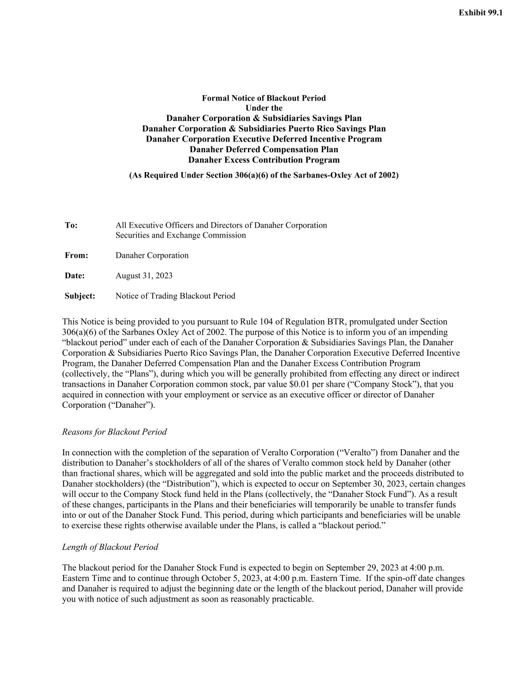 Formal Notice of Blackout Period Under the Danaher Corporation & Subsidiaries Savings Plan Danaher Corporation & Subsidiaries Puerto Rico Savings Plan Danaher Corporation Executive Deferred Incentive Program Danaher Deferred Compensation Plan Danaher Excess Contribution Program (As Required Under Section 306(a)(6) of the Sarbanes-Oxley Act of 2002) To: All Executive Officers and Directors of Danaher Corporation Securities and Exchange Commission From: Danaher Corporation Date: August 31, 2023 Subject: Notice of Trading Blackout Period This Notice is being provided to you pursuant to Rule 104 of Regulation BTR, promulgated under Section 306(a)(6) of the Sarbanes Oxley Act of 2002. The purpose of this Notice is to inform you of an impending “blackout period” under each of each of the Danaher Corporation & Subsidiaries Savings Plan, the Danaher Corporation & Subsidiaries Puerto Rico Savings Plan, the Danaher Corporation Executive Deferred Incentive Program, the Danaher Deferred Compensation Plan and the Danaher Excess Contribution Program (collectively, the “Plans”), during which you will be generally prohibited from effecting any direct or indirect transactions in Danaher Corporation common stock, par value $0.01 per share (“Company Stock”), that you acquired in connection with your employment or service as an executive officer or director of Danaher Corporation (“Danaher”). Reasons for Blackout Period In connection with the completion of the separation of Veralto Corporation (“Veralto”) from Danaher and the distribution to Danaher’s stockholders of all of the shares of Veralto common stock held by Danaher (other than fractional shares, which will be aggregated and sold into the public market and the proceeds distributed to Danaher stockholders) (the “Distribution”), which is expected to occur on September 30, 2023, certain changes will occur to the Company Stock fund held in the Plans (collectively, the “Danaher Stock Fund”). As a result of these changes, participants in the Plans and their beneficiaries will temporarily be unable to transfer funds into or out of the Danaher Stock Fund. This period, during which participants and beneficiaries will be unable to exercise these rights otherwise available under the Plans, is called a “blackout period.” Length of Blackout Period The blackout period for the Danaher Stock Fund is expected to begin on September 29, 2023 at 4:00 p.m. Eastern Time and to continue through October 5, 2023, at 4:00 p.m. Eastern Time. If the spin-off date changes and Danaher is required to adjust the beginning date or the length of the blackout period, Danaher will provide you with notice of such adjustment as soon as reasonably practicable. Exhibit 99.1