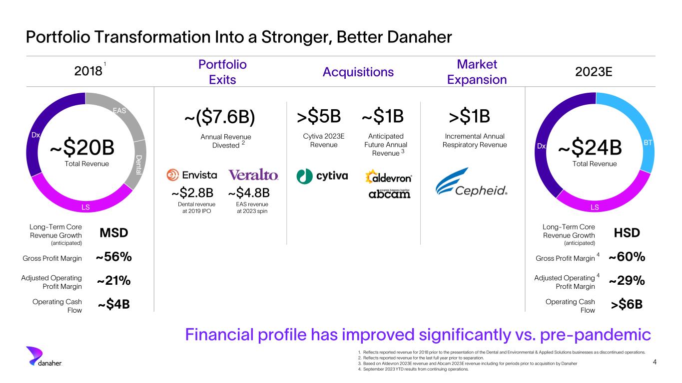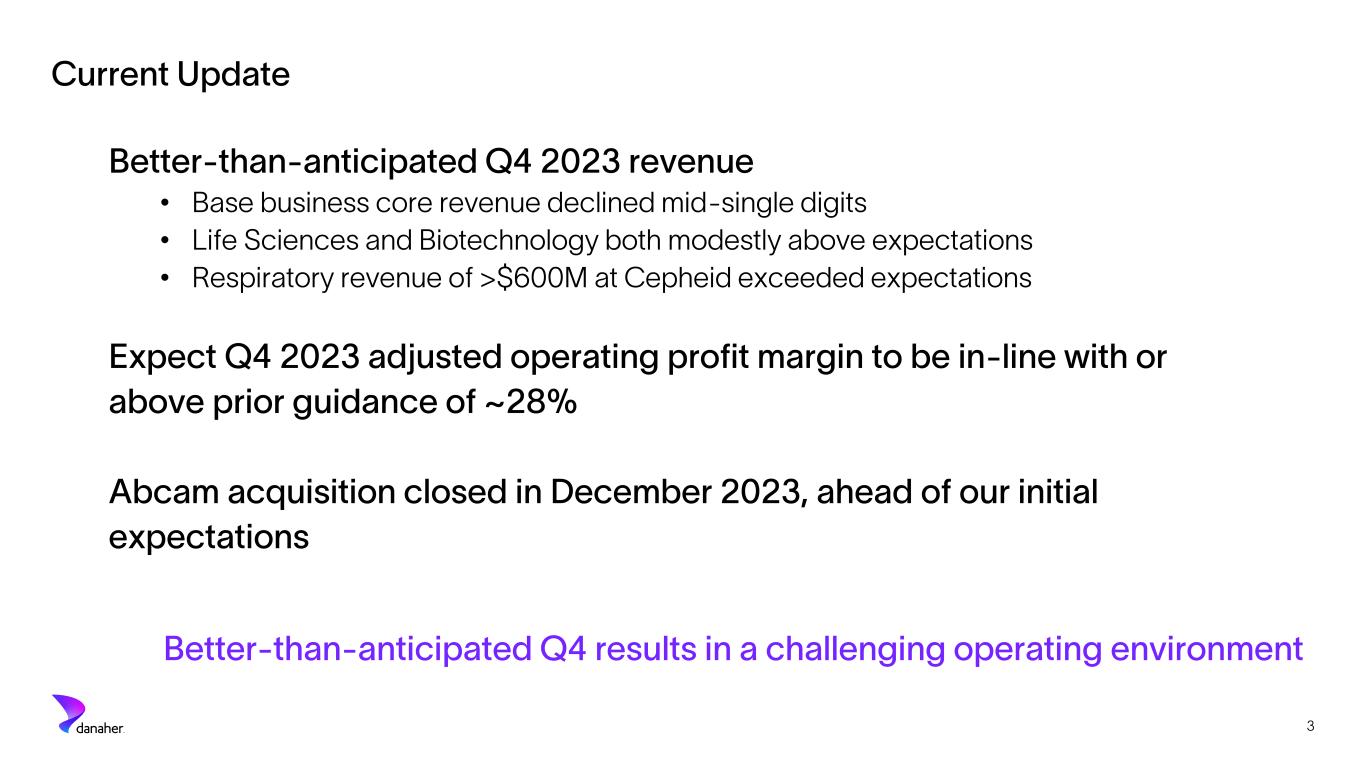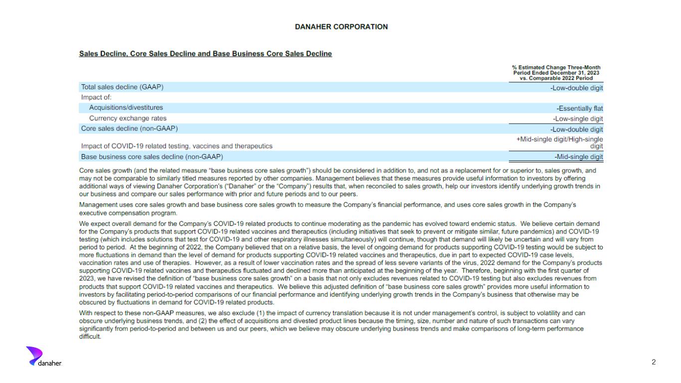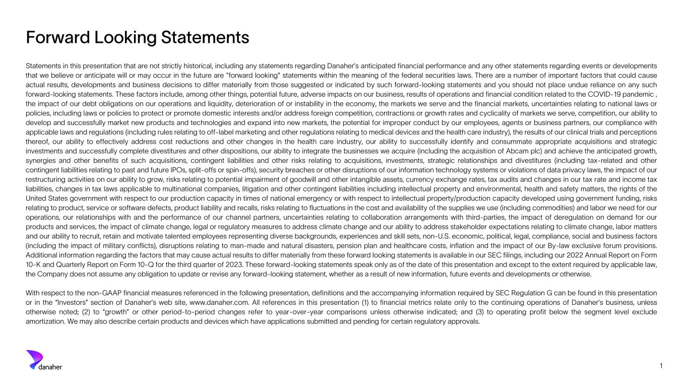 1 Forward Looking Statements Statements in this presentation that are not strictly historical, including any statements regarding Danaher’s anticipated financial performance and any other statements regarding events or developments that we believe or anticipate will or may occur in the future are "forward looking" statements within the meaning of the federal securities laws. There are a number of important factors that could cause actual results, developments and business decisions to differ materially from those suggested or indicated by such forward-looking statements and you should not place undue reliance on any such forward-looking statements. These factors include, among other things, potential future, adverse impacts on our business, results of operations and financial condition related to the COVID-19 pandemic , the impact of our debt obligations on our operations and liquidity, deterioration of or instability in the economy, the markets we serve and the financial markets, uncertainties relating to national laws or policies, including laws or policies to protect or promote domestic interests and/or address foreign competition, contractions or growth rates and cyclicality of markets we serve, competition, our ability to develop and successfully market new products and technologies and expand into new markets, the potential for improper conduct by our employees, agents or business partners, our compliance with applicable laws and regulations (including rules relating to off-label marketing and other regulations relating to medical devices and the health care industry), the results of our clinical trials and perceptions thereof, our ability to effectively address cost reductions and other changes in the health care industry, our ability to successfully identify and consummate appropriate acquisitions and strategic investments and successfully complete divestitures and other dispositions, our ability to integrate the businesses we acquire (including the acquisition of Abcam plc) and achieve the anticipated growth, synergies and other benefits of such acquisitions, contingent liabilities and other risks relating to acquisitions, investments, strategic relationships and divestitures (including tax-related and other contingent liabilities relating to past and future IPOs, split-offs or spin-offs), security breaches or other disruptions of our information technology systems or violations of data privacy laws, the impact of our restructuring activities on our ability to grow, risks relating to potential impairment of goodwill and other intangible assets, currency exchange rates, tax audits and changes in our tax rate and income tax liabilities, changes in tax laws applicable to multinational companies, litigation and other contingent liabilities including intellectual property and environmental, health and safety matters, the rights of the United States government with respect to our production capacity in times of national emergency or with respect to intellectual property/production capacity developed using government funding, risks relating to product, service or software defects, product liability and recalls, risks relating to fluctuations in the cost and availability of the supplies we use (including commodities) and labor we need for our operations, our relationships with and the performance of our channel partners, uncertainties relating to collaboration arrangements with third-parties, the impact of deregulation on demand for our products and services, the impact of climate change, legal or regulatory measures to address climate change and our ability to address stakeholder expectations relating to climate change, labor matters and our ability to recruit, retain and motivate talented employees representing diverse backgrounds, experiences and skill sets, non-U.S. economic, political, legal, compliance, social and business factors (including the impact of military conflicts), disruptions relating to man-made and natural disasters, pension plan and healthcare costs, inflation and the impact of our By-law exclusive forum provisions. Additional information regarding the factors that may cause actual results to differ materially from these forward looking statements is available in our SEC filings, including our 2022 Annual Report on Form 10-K and Quarterly Report on Form 10-Q for the third quarter of 2023. These forward-looking statements speak only as of the date of this presentation and except to the extent required by applicable law, the Company does not assume any obligation to update or revise any forward-looking statement, whether as a result of new information, future events and developments or otherwise. With respect to the non-GAAP financial measures referenced in the following presentation, definitions and the accompanying information required by SEC Regulation G can be found in this presentation or in the “Investors” section of Danaher’s web site, www.danaher.com. All references in this presentation (1) to financial metrics relate only to the continuing operations of Danaher’s business, unless otherwise noted; (2) to “growth” or other period-to-period changes refer to year-over-year comparisons unless otherwise indicated; and (3) to operating profit below the segment level exclude amortization. We may also describe certain products and devices which have applications submitted and pending for certain regulatory approvals.