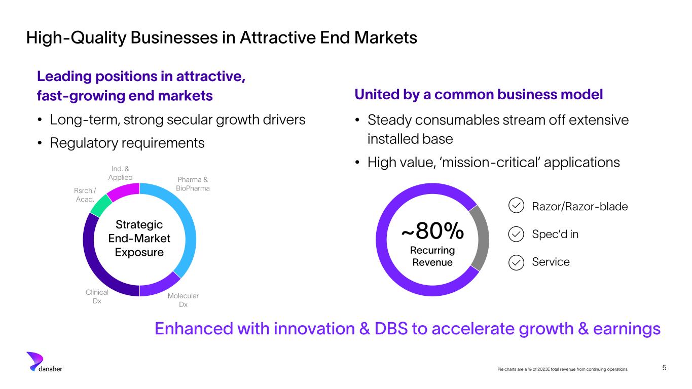 4 Dx EAS D ental LS Portfolio Transformation Into a Stronger, Better Danaher Financial profile has improved significantly vs. pre-pandemic 2018 Dx BT LS Total Revenue ~$24B 2023E Portfolio Exits Total Revenue ~$20B ~$2.8B Dental revenue at 2019 IPO ~$4.8B EAS revenue at 2023 spin MSD ~56% ~21% ~$4B Acquisitions Market Expansion HSD ~60% ~29% >$6B Long-Term Core Revenue Growth (anticipated) Gross Profit Margin Adjusted Operating Profit Margin Operating Cash Flow Annual Revenue Divested ~($7.6B) Cytiva 2023E Revenue >$5B Incremental Annual Respiratory Revenue >$1B 1 Anticipated Future Annual Revenue ~$1B 4 4 1. Reflects reported revenue for 2018 prior to the presentation of the Dental and Environmental & Applied Solutions businesses as discontinued operations. 2. Reflects reported revenue for the last full year prior to separation. 3. Based on Aldevron 2023E revenue and Abcam 2023E revenue including for periods prior to acquisition by Danaher 4. September 2023 YTD results from continuing operations. Long-Term Core Revenue Growth (anticipated) Gross Profit Margin Adjusted Operating Profit Margin Operating Cash Flow 3 2