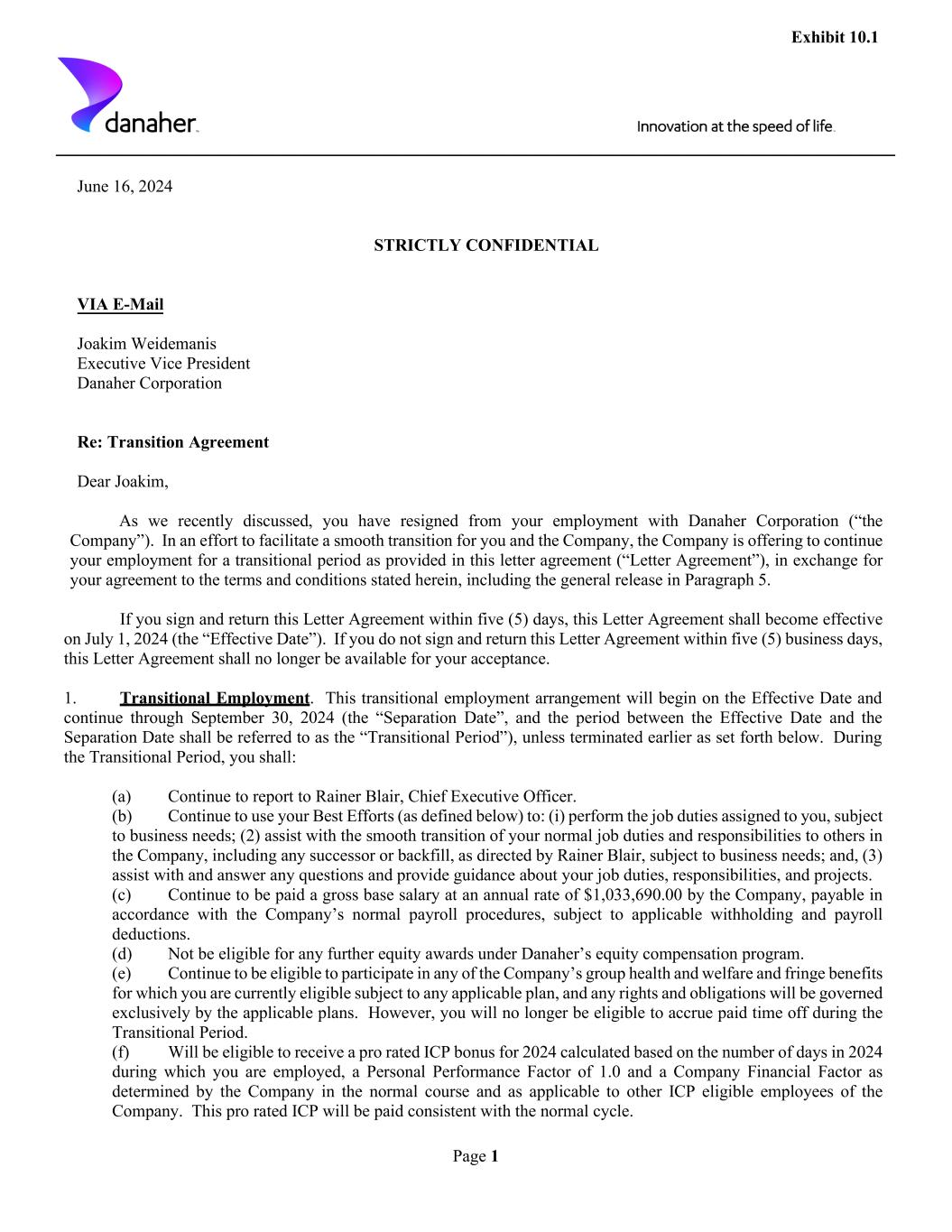 _____________________________________________________________________________ Page 1 June 16, 2024 Exhibit 10.1 VIA E-Mail Joakim Weidemanis Executive Vice President Danaher Corporation Re: Transition Agreement Dear Joakim, As we recently discussed, you have resigned from your employment with Danaher Corporation (“the Company”). In an effort to facilitate a smooth transition for you and the Company, the Company is offering to continue your employment for a transitional period as provided in this letter agreement (“Letter Agreement”), in exchange for your agreement to the terms and conditions stated herein, including the general release in Paragraph 5. If you sign and return this Letter Agreement within five (5) days, this Letter Agreement shall become effective on July 1, 2024 (the “Effective Date”). If you do not sign and return this Letter Agreement within five (5) business days, this Letter Agreement shall no longer be available for your acceptance. 1. Transitional Employment. This transitional employment arrangement will begin on the Effective Date and continue through September 30, 2024 (the “Separation Date”, and the period between the Effective Date and the Separation Date shall be referred to as the “Transitional Period”), unless terminated earlier as set forth below. During the Transitional Period, you shall: (a) Continue to report to Rainer Blair, Chief Executive Officer. (b) Continue to use your Best Efforts (as defined below) to: (i) perform the job duties assigned to you, subject to business needs; (2) assist with the smooth transition of your normal job duties and responsibilities to others in the Company, including any successor or backfill, as directed by Rainer Blair, subject to business needs; and, (3) assist with and answer any questions and provide guidance about your job duties, responsibilities, and projects. (c) Continue to be paid a gross base salary at an annual rate of $1,033,690.00 by the Company, payable in accordance with the Company’s normal payroll procedures, subject to applicable withholding and payroll deductions. (d) Not be eligible for any further equity awards under Danaher’s equity compensation program. (e) Continue to be eligible to participate in any of the Company’s group health and welfare and fringe benefits for which you are currently eligible subject to any applicable plan, and any rights and obligations will be governed exclusively by the applicable plans. However, you will no longer be eligible to accrue paid time off during the Transitional Period. (f) Will be eligible to receive a pro rated ICP bonus for 2024 calculated based on the number of days in 2024 during which you are employed, a Personal Performance Factor of 1.0 and a Company Financial Factor as determined by the Company in the normal course and as applicable to other ICP eligible employees of the Company. This pro rated ICP will be paid consistent with the normal cycle. STRICTLY CONFIDENTIAL