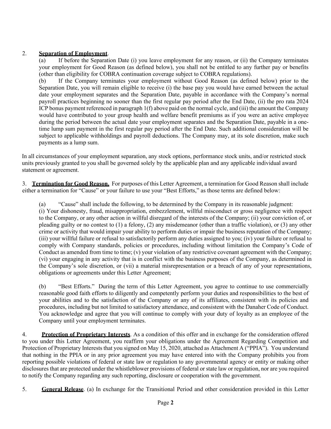 Page 2 2. Separation of Employment. (a) If before the Separation Date (i) you leave employment for any reason, or (ii) the Company terminates your employment for Good Reason (as defined below), you shall not be entitled to any further pay or benefits (other than eligibility for COBRA continuation coverage subject to COBRA regulations). (b) If the Company terminates your employment without Good Reason (as defined below) prior to the Separation Date, you will remain eligible to receive (i) the base pay you would have earned between the actual date your employment separates and the Separation Date, payable in accordance with the Company’s normal payroll practices beginning no sooner than the first regular pay period after the End Date, (ii) the pro rata 2024 ICP bonus payment referenced in paragraph 1(f) above paid on the normal cycle, and (iii) the amount the Company would have contributed to your group health and welfare benefit premiums as if you were an active employee during the period between the actual date your employment separates and the Separation Date, payable in a one- time lump sum payment in the first regular pay period after the End Date. Such additional consideration will be subject to applicable withholdings and payroll deductions. The Company may, at its sole discretion, make such payments as a lump sum. In all circumstances of your employment separation, any stock options, performance stock units, and/or restricted stock units previously granted to you shall be governed solely by the applicable plan and any applicable individual award statement or agreement. 3. Termination for Good Reason. For purposes of this Letter Agreement, a termination for Good Reason shall include either a termination for “Cause” or your failure to use your “Best Efforts,” as those terms are defined below: (a) “Cause” shall include the following, to be determined by the Company in its reasonable judgment: (i) Your dishonesty, fraud, misappropriation, embezzlement, willful misconduct or gross negligence with respect to the Company, or any other action in willful disregard of the interests of the Company; (ii) your conviction of, or pleading guilty or no contest to (1) a felony, (2) any misdemeanor (other than a traffic violation), or (3) any other crime or activity that would impair your ability to perform duties or impair the business reputation of the Company; (iii) your willful failure or refusal to satisfactorily perform any duties assigned to you; (iv) your failure or refusal to comply with Company standards, policies or procedures, including without limitation the Company’s Code of Conduct as amended from time to time; (v) your violation of any restrictive covenant agreement with the Company; (vi) your engaging in any activity that is in conflict with the business purposes of the Company, as determined in the Company’s sole discretion, or (vii) a material misrepresentation or a breach of any of your representations, obligations or agreements under this Letter Agreement; (b) “Best Efforts.” During the term of this Letter Agreement, you agree to continue to use commercially reasonable good faith efforts to diligently and competently perform your duties and responsibilities to the best of your abilities and to the satisfaction of the Company or any of its affiliates, consistent with its policies and procedures, including but not limited to satisfactory attendance, and consistent with the Danaher Code of Conduct. You acknowledge and agree that you will continue to comply with your duty of loyalty as an employee of the Company until your employment terminates. 4. Protection of Proprietary Interests. As a condition of this offer and in exchange for the consideration offered to you under this Letter Agreement, you reaffirm your obligations under the Agreement Regarding Competition and Protection of Proprietary Interests that you signed on May 15, 2020, attached as Attachment A (“PPIA”). You understand that nothing in the PPIA or in any prior agreement you may have entered into with the Company prohibits you from reporting possible violations of federal or state law or regulation to any governmental agency or entity or making other disclosures that are protected under the whistleblower provisions of federal or state law or regulation, nor are you required to notify the Company regarding any such reporting, disclosure or cooperation with the government. 5. General Release. (a) In exchange for the Transitional Period and other consideration provided in this Letter