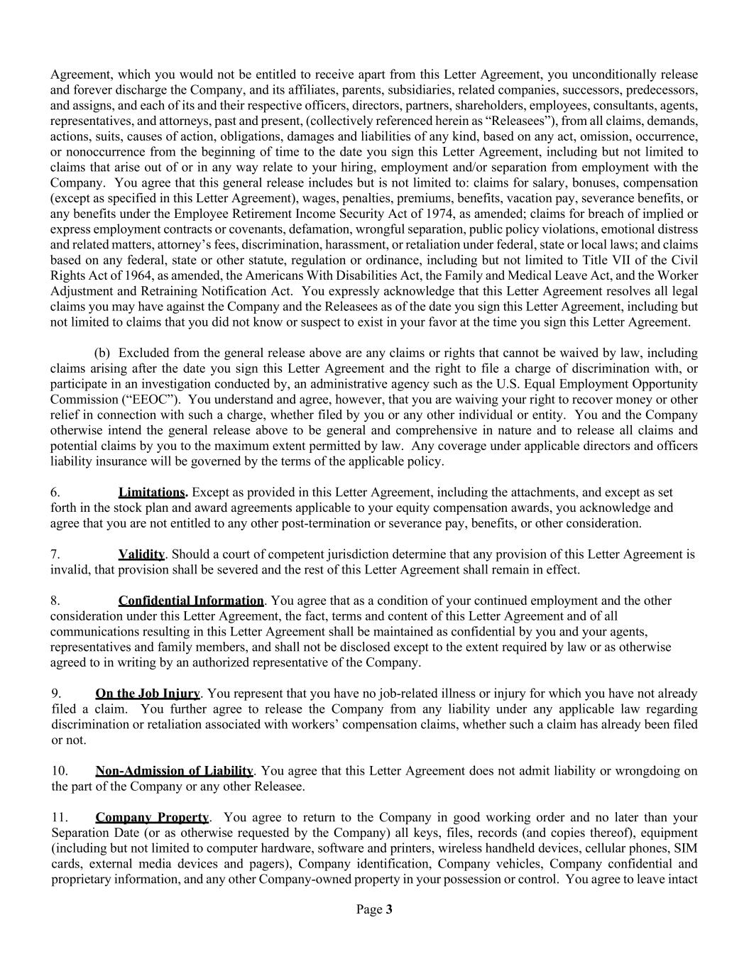 Page 3 Agreement, which you would not be entitled to receive apart from this Letter Agreement, you unconditionally release and forever discharge the Company, and its affiliates, parents, subsidiaries, related companies, successors, predecessors, and assigns, and each of its and their respective officers, directors, partners, shareholders, employees, consultants, agents, representatives, and attorneys, past and present, (collectively referenced herein as “Releasees”), from all claims, demands, actions, suits, causes of action, obligations, damages and liabilities of any kind, based on any act, omission, occurrence, or nonoccurrence from the beginning of time to the date you sign this Letter Agreement, including but not limited to claims that arise out of or in any way relate to your hiring, employment and/or separation from employment with the Company. You agree that this general release includes but is not limited to: claims for salary, bonuses, compensation (except as specified in this Letter Agreement), wages, penalties, premiums, benefits, vacation pay, severance benefits, or any benefits under the Employee Retirement Income Security Act of 1974, as amended; claims for breach of implied or express employment contracts or covenants, defamation, wrongful separation, public policy violations, emotional distress and related matters, attorney’s fees, discrimination, harassment, or retaliation under federal, state or local laws; and claims based on any federal, state or other statute, regulation or ordinance, including but not limited to Title VII of the Civil Rights Act of 1964, as amended, the Americans With Disabilities Act, the Family and Medical Leave Act, and the Worker Adjustment and Retraining Notification Act. You expressly acknowledge that this Letter Agreement resolves all legal claims you may have against the Company and the Releasees as of the date you sign this Letter Agreement, including but not limited to claims that you did not know or suspect to exist in your favor at the time you sign this Letter Agreement. (b) Excluded from the general release above are any claims or rights that cannot be waived by law, including claims arising after the date you sign this Letter Agreement and the right to file a charge of discrimination with, or participate in an investigation conducted by, an administrative agency such as the U.S. Equal Employment Opportunity Commission (“EEOC”). You understand and agree, however, that you are waiving your right to recover money or other relief in connection with such a charge, whether filed by you or any other individual or entity. You and the Company otherwise intend the general release above to be general and comprehensive in nature and to release all claims and potential claims by you to the maximum extent permitted by law. Any coverage under applicable directors and officers liability insurance will be governed by the terms of the applicable policy. 6. Limitations. Except as provided in this Letter Agreement, including the attachments, and except as set forth in the stock plan and award agreements applicable to your equity compensation awards, you acknowledge and agree that you are not entitled to any other post-termination or severance pay, benefits, or other consideration. 7. Validity. Should a court of competent jurisdiction determine that any provision of this Letter Agreement is invalid, that provision shall be severed and the rest of this Letter Agreement shall remain in effect. 8. Confidential Information. You agree that as a condition of your continued employment and the other consideration under this Letter Agreement, the fact, terms and content of this Letter Agreement and of all communications resulting in this Letter Agreement shall be maintained as confidential by you and your agents, representatives and family members, and shall not be disclosed except to the extent required by law or as otherwise agreed to in writing by an authorized representative of the Company. 9. On the Job Injury. You represent that you have no job-related illness or injury for which you have not already filed a claim. You further agree to release the Company from any liability under any applicable law regarding discrimination or retaliation associated with workers’ compensation claims, whether such a claim has already been filed or not. 10. Non-Admission of Liability. You agree that this Letter Agreement does not admit liability or wrongdoing on the part of the Company or any other Releasee. 11. Company Property. You agree to return to the Company in good working order and no later than your Separation Date (or as otherwise requested by the Company) all keys, files, records (and copies thereof), equipment (including but not limited to computer hardware, software and printers, wireless handheld devices, cellular phones, SIM cards, external media devices and pagers), Company identification, Company vehicles, Company confidential and proprietary information, and any other Company-owned property in your possession or control. You agree to leave intact