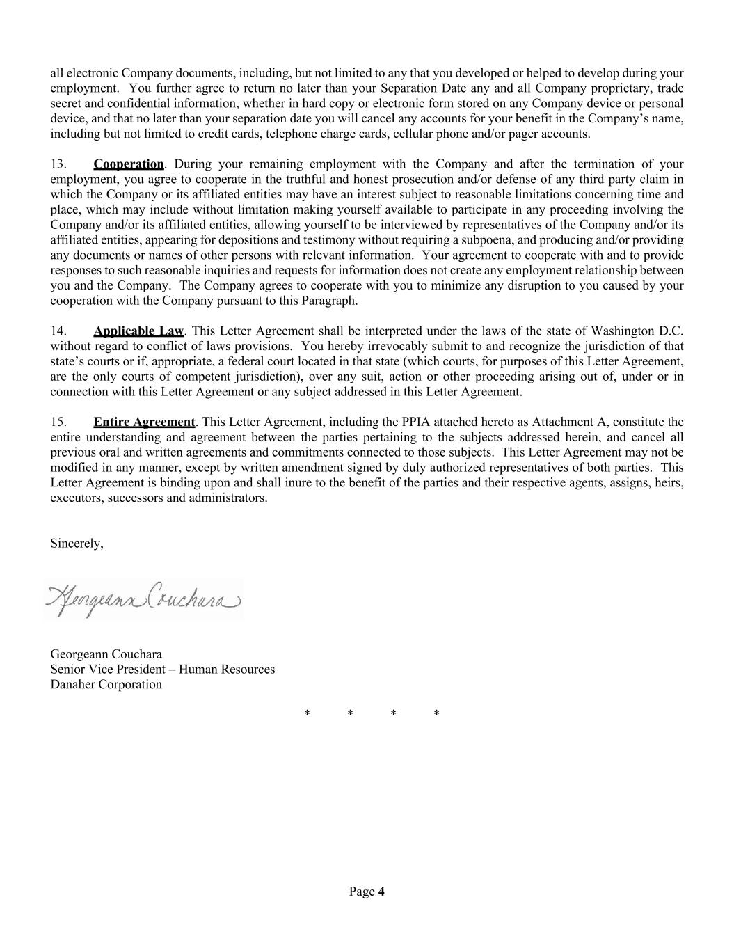 Page 4 all electronic Company documents, including, but not limited to any that you developed or helped to develop during your employment. You further agree to return no later than your Separation Date any and all Company proprietary, trade secret and confidential information, whether in hard copy or electronic form stored on any Company device or personal device, and that no later than your separation date you will cancel any accounts for your benefit in the Company’s name, including but not limited to credit cards, telephone charge cards, cellular phone and/or pager accounts. 13. Cooperation. During your remaining employment with the Company and after the termination of your employment, you agree to cooperate in the truthful and honest prosecution and/or defense of any third party claim in which the Company or its affiliated entities may have an interest subject to reasonable limitations concerning time and place, which may include without limitation making yourself available to participate in any proceeding involving the Company and/or its affiliated entities, allowing yourself to be interviewed by representatives of the Company and/or its affiliated entities, appearing for depositions and testimony without requiring a subpoena, and producing and/or providing any documents or names of other persons with relevant information. Your agreement to cooperate with and to provide responses to such reasonable inquiries and requests for information does not create any employment relationship between you and the Company. The Company agrees to cooperate with you to minimize any disruption to you caused by your cooperation with the Company pursuant to this Paragraph. 14. Applicable Law. This Letter Agreement shall be interpreted under the laws of the state of Washington D.C. without regard to conflict of laws provisions. You hereby irrevocably submit to and recognize the jurisdiction of that state’s courts or if, appropriate, a federal court located in that state (which courts, for purposes of this Letter Agreement, are the only courts of competent jurisdiction), over any suit, action or other proceeding arising out of, under or in connection with this Letter Agreement or any subject addressed in this Letter Agreement. 15. Entire Agreement. This Letter Agreement, including the PPIA attached hereto as Attachment A, constitute the entire understanding and agreement between the parties pertaining to the subjects addressed herein, and cancel all previous oral and written agreements and commitments connected to those subjects. This Letter Agreement may not be modified in any manner, except by written amendment signed by duly authorized representatives of both parties. This Letter Agreement is binding upon and shall inure to the benefit of the parties and their respective agents, assigns, heirs, executors, successors and administrators. Sincerely, Georgeann Couchara Senior Vice President – Human Resources Danaher Corporation * * * *