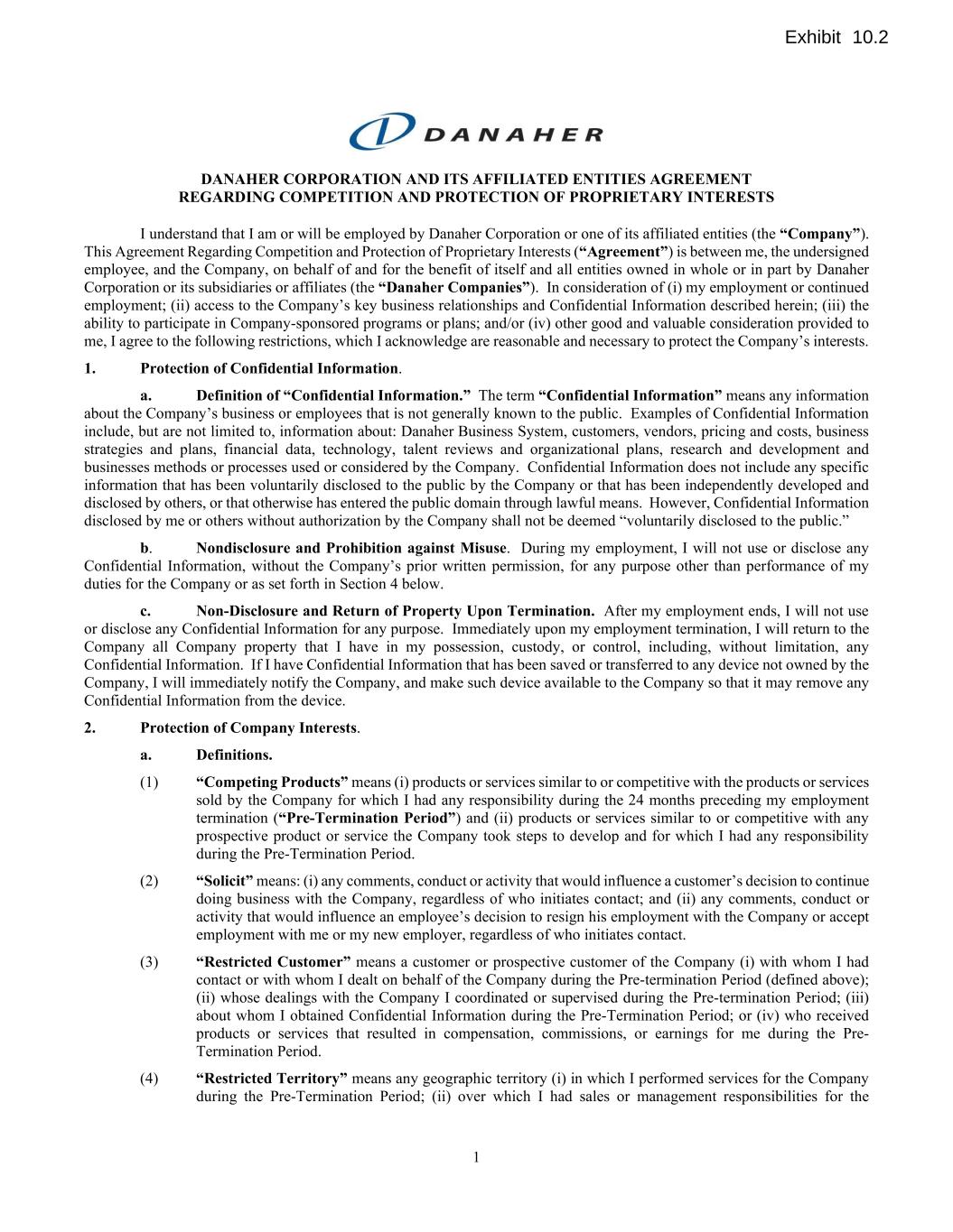 1 DANAHER CORPORATION AND ITS AFFILIATED ENTITIES AGREEMENT REGARDING COMPETITION AND PROTECTION OF PROPRIETARY INTERESTS I understand that I am or will be employed by Danaher Corporation or one of its affiliated entities (the “Company”). This Agreement Regarding Competition and Protection of Proprietary Interests (“Agreement”) is between me, the undersigned employee, and the Company, on behalf of and for the benefit of itself and all entities owned in whole or in part by Danaher Corporation or its subsidiaries or affiliates (the “Danaher Companies”). In consideration of (i) my employment or continued employment; (ii) access to the Company’s key business relationships and Confidential Information described herein; (iii) the ability to participate in Company-sponsored programs or plans; and/or (iv) other good and valuable consideration provided to me, I agree to the following restrictions, which I acknowledge are reasonable and necessary to protect the Company’s interests. 1. Protection of Confidential Information. a. Definition of “Confidential Information.” The term “Confidential Information” means any information about the Company’s business or employees that is not generally known to the public. Examples of Confidential Information include, but are not limited to, information about: Danaher Business System, customers, vendors, pricing and costs, business strategies and plans, financial data, technology, talent reviews and organizational plans, research and development and businesses methods or processes used or considered by the Company. Confidential Information does not include any specific information that has been voluntarily disclosed to the public by the Company or that has been independently developed and disclosed by others, or that otherwise has entered the public domain through lawful means. However, Confidential Information disclosed by me or others without authorization by the Company shall not be deemed “voluntarily disclosed to the public.” b. Nondisclosure and Prohibition against Misuse. During my employment, I will not use or disclose any Confidential Information, without the Company’s prior written permission, for any purpose other than performance of my duties for the Company or as set forth in Section 4 below. c. Non-Disclosure and Return of Property Upon Termination. After my employment ends, I will not use or disclose any Confidential Information for any purpose. Immediately upon my employment termination, I will return to the Company all Company property that I have in my possession, custody, or control, including, without limitation, any Confidential Information. If I have Confidential Information that has been saved or transferred to any device not owned by the Company, I will immediately notify the Company, and make such device available to the Company so that it may remove any Confidential Information from the device. 2. Protection of Company Interests. a. Definitions. (1) “Competing Products” means (i) products or services similar to or competitive with the products or services sold by the Company for which I had any responsibility during the 24 months preceding my employment termination (“Pre-Termination Period”) and (ii) products or services similar to or competitive with any prospective product or service the Company took steps to develop and for which I had any responsibility during the Pre-Termination Period. (2) “Solicit” means: (i) any comments, conduct or activity that would influence a customer’s decision to continue doing business with the Company, regardless of who initiates contact; and (ii) any comments, conduct or activity that would influence an employee’s decision to resign his employment with the Company or accept employment with me or my new employer, regardless of who initiates contact. (3) “Restricted Customer” means a customer or prospective customer of the Company (i) with whom I had contact or with whom I dealt on behalf of the Company during the Pre-termination Period (defined above); (ii) whose dealings with the Company I coordinated or supervised during the Pre-termination Period; (iii) about whom I obtained Confidential Information during the Pre-Termination Period; or (iv) who received products or services that resulted in compensation, commissions, or earnings for me during the Pre- Termination Period. (4) “Restricted Territory” means any geographic territory (i) in which I performed services for the Company during the Pre-Termination Period; (ii) over which I had sales or management responsibilities for the