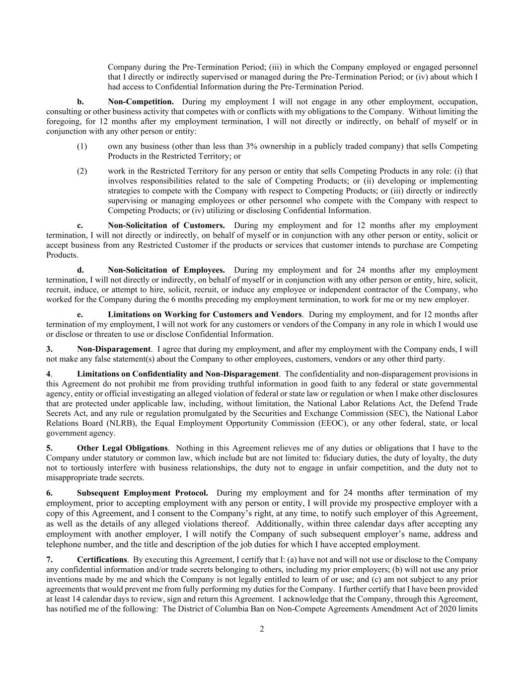 2 Company during the Pre-Termination Period; (iii) in which the Company employed or engaged personnel that I directly or indirectly supervised or managed during the Pre-Termination Period; or (iv) about which I had access to Confidential Information during the Pre-Termination Period. b. Non-Competition. During my employment I will not engage in any other employment, occupation, consulting or other business activity that competes with or conflicts with my obligations to the Company. Without limiting the foregoing, for 12 months after my employment termination, I will not directly or indirectly, on behalf of myself or in conjunction with any other person or entity: (1) own any business (other than less than 3% ownership in a publicly traded company) that sells Competing Products in the Restricted Territory; or (2) work in the Restricted Territory for any person or entity that sells Competing Products in any role: (i) that involves responsibilities related to the sale of Competing Products; or (ii) developing or implementing strategies to compete with the Company with respect to Competing Products; or (iii) directly or indirectly supervising or managing employees or other personnel who compete with the Company with respect to Competing Products; or (iv) utilizing or disclosing Confidential Information. c. Non-Solicitation of Customers. During my employment and for 12 months after my employment termination, I will not directly or indirectly, on behalf of myself or in conjunction with any other person or entity, solicit or accept business from any Restricted Customer if the products or services that customer intends to purchase are Competing Products. d. Non-Solicitation of Employees. During my employment and for 24 months after my employment termination, I will not directly or indirectly, on behalf of myself or in conjunction with any other person or entity, hire, solicit, recruit, induce, or attempt to hire, solicit, recruit, or induce any employee or independent contractor of the Company, who worked for the Company during the 6 months preceding my employment termination, to work for me or my new employer. e. Limitations on Working for Customers and Vendors. During my employment, and for 12 months after termination of my employment, I will not work for any customers or vendors of the Company in any role in which I would use or disclose or threaten to use or disclose Confidential Information. 3. Non-Disparagement. I agree that during my employment, and after my employment with the Company ends, I will not make any false statement(s) about the Company to other employees, customers, vendors or any other third party. 4. Limitations on Confidentiality and Non-Disparagement. The confidentiality and non-disparagement provisions in this Agreement do not prohibit me from providing truthful information in good faith to any federal or state governmental agency, entity or official investigating an alleged violation of federal or state law or regulation or when I make other disclosures that are protected under applicable law, including, without limitation, the National Labor Relations Act, the Defend Trade Secrets Act, and any rule or regulation promulgated by the Securities and Exchange Commission (SEC), the National Labor Relations Board (NLRB), the Equal Employment Opportunity Commission (EEOC), or any other federal, state, or local government agency. 5. Other Legal Obligations. Nothing in this Agreement relieves me of any duties or obligations that I have to the Company under statutory or common law, which include but are not limited to: fiduciary duties, the duty of loyalty, the duty not to tortiously interfere with business relationships, the duty not to engage in unfair competition, and the duty not to misappropriate trade secrets. 6. Subsequent Employment Protocol. During my employment and for 24 months after termination of my employment, prior to accepting employment with any person or entity, I will provide my prospective employer with a copy of this Agreement, and I consent to the Company’s right, at any time, to notify such employer of this Agreement, as well as the details of any alleged violations thereof. Additionally, within three calendar days after accepting any employment with another employer, I will notify the Company of such subsequent employer’s name, address and telephone number, and the title and description of the job duties for which I have accepted employment. 7. Certifications. By executing this Agreement, I certify that I: (a) have not and will not use or disclose to the Company any confidential information and/or trade secrets belonging to others, including my prior employers; (b) will not use any prior inventions made by me and which the Company is not legally entitled to learn of or use; and (c) am not subject to any prior agreements that would prevent me from fully performing my duties for the Company. I further certify that I have been provided at least 14 calendar days to review, sign and return this Agreement. I acknowledge that the Company, through this Agreement, has notified me of the following: The District of Columbia Ban on Non-Compete Agreements Amendment Act of 2020 limits