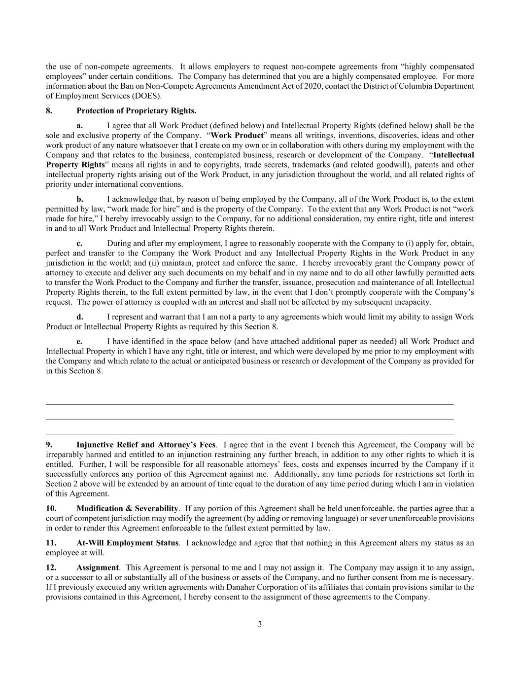3 the use of non-compete agreements. It allows employers to request non-compete agreements from “highly compensated employees” under certain conditions. The Company has determined that you are a highly compensated employee. For more information about the Ban on Non-Compete Agreements Amendment Act of 2020, contact the District of Columbia Department of Employment Services (DOES). 8. Protection of Proprietary Rights. a. I agree that all Work Product (defined below) and Intellectual Property Rights (defined below) shall be the sole and exclusive property of the Company. “Work Product” means all writings, inventions, discoveries, ideas and other work product of any nature whatsoever that I create on my own or in collaboration with others during my employment with the Company and that relates to the business, contemplated business, research or development of the Company. “Intellectual Property Rights” means all rights in and to copyrights, trade secrets, trademarks (and related goodwill), patents and other intellectual property rights arising out of the Work Product, in any jurisdiction throughout the world, and all related rights of priority under international conventions. b. I acknowledge that, by reason of being employed by the Company, all of the Work Product is, to the extent permitted by law, “work made for hire” and is the property of the Company. To the extent that any Work Product is not “work made for hire,” I hereby irrevocably assign to the Company, for no additional consideration, my entire right, title and interest in and to all Work Product and Intellectual Property Rights therein. c. During and after my employment, I agree to reasonably cooperate with the Company to (i) apply for, obtain, perfect and transfer to the Company the Work Product and any Intellectual Property Rights in the Work Product in any jurisdiction in the world; and (ii) maintain, protect and enforce the same. I hereby irrevocably grant the Company power of attorney to execute and deliver any such documents on my behalf and in my name and to do all other lawfully permitted acts to transfer the Work Product to the Company and further the transfer, issuance, prosecution and maintenance of all Intellectual Property Rights therein, to the full extent permitted by law, in the event that I don’t promptly cooperate with the Company’s request. The power of attorney is coupled with an interest and shall not be affected by my subsequent incapacity. d. I represent and warrant that I am not a party to any agreements which would limit my ability to assign Work Product or Intellectual Property Rights as required by this Section 8. e. I have identified in the space below (and have attached additional paper as needed) all Work Product and Intellectual Property in which I have any right, title or interest, and which were developed by me prior to my employment with the Company and which relate to the actual or anticipated business or research or development of the Company as provided for in this Section 8. ________________________________________________________________________________________________ ________________________________________________________________________________________________ ________________________________________________________________________________________________ 9. Injunctive Relief and Attorney’s Fees. I agree that in the event I breach this Agreement, the Company will be irreparably harmed and entitled to an injunction restraining any further breach, in addition to any other rights to which it is entitled. Further, I will be responsible for all reasonable attorneys’ fees, costs and expenses incurred by the Company if it successfully enforces any portion of this Agreement against me. Additionally, any time periods for restrictions set forth in Section 2 above will be extended by an amount of time equal to the duration of any time period during which I am in violation of this Agreement. 10. Modification & Severability. If any portion of this Agreement shall be held unenforceable, the parties agree that a court of competent jurisdiction may modify the agreement (by adding or removing language) or sever unenforceable provisions in order to render this Agreement enforceable to the fullest extent permitted by law. 11. At-Will Employment Status. I acknowledge and agree that that nothing in this Agreement alters my status as an employee at will. 12. Assignment. This Agreement is personal to me and I may not assign it. The Company may assign it to any assign, or a successor to all or substantially all of the business or assets of the Company, and no further consent from me is necessary. If I previously executed any written agreements with Danaher Corporation of its affiliates that contain provisions similar to the provisions contained in this Agreement, I hereby consent to the assignment of those agreements to the Company.