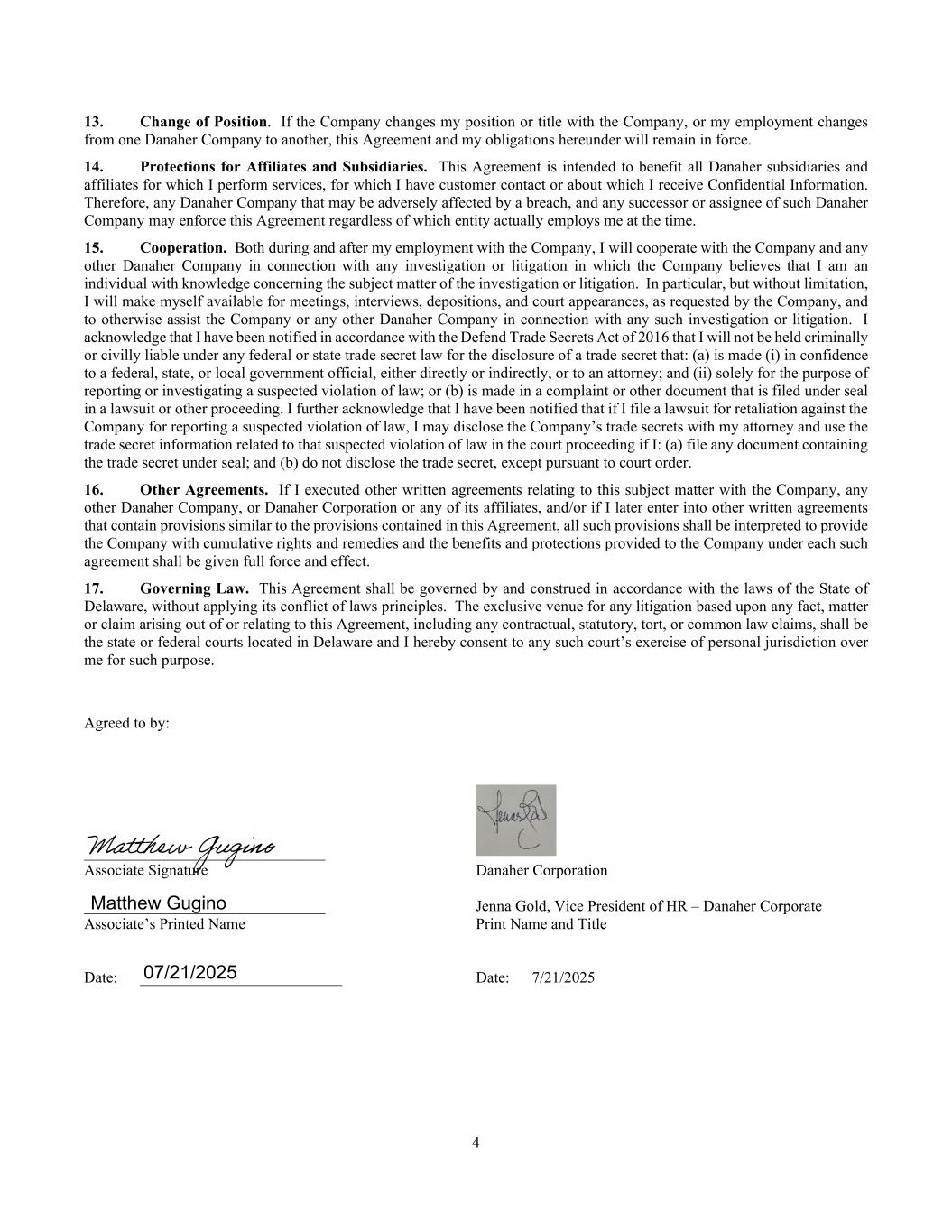 4 13. Change of Position. If the Company changes my position or title with the Company, or my employment changes from one Danaher Company to another, this Agreement and my obligations hereunder will remain in force. 14. Protections for Affiliates and Subsidiaries. This Agreement is intended to benefit all Danaher subsidiaries and affiliates for which I perform services, for which I have customer contact or about which I receive Confidential Information. Therefore, any Danaher Company that may be adversely affected by a breach, and any successor or assignee of such Danaher Company may enforce this Agreement regardless of which entity actually employs me at the time. 15. Cooperation. Both during and after my employment with the Company, I will cooperate with the Company and any other Danaher Company in connection with any investigation or litigation in which the Company believes that I am an individual with knowledge concerning the subject matter of the investigation or litigation. In particular, but without limitation, I will make myself available for meetings, interviews, depositions, and court appearances, as requested by the Company, and to otherwise assist the Company or any other Danaher Company in connection with any such investigation or litigation. I acknowledge that I have been notified in accordance with the Defend Trade Secrets Act of 2016 that I will not be held criminally or civilly liable under any federal or state trade secret law for the disclosure of a trade secret that: (a) is made (i) in confidence to a federal, state, or local government official, either directly or indirectly, or to an attorney; and (ii) solely for the purpose of reporting or investigating a suspected violation of law; or (b) is made in a complaint or other document that is filed under seal in a lawsuit or other proceeding. I further acknowledge that I have been notified that if I file a lawsuit for retaliation against the Company for reporting a suspected violation of law, I may disclose the Company’s trade secrets with my attorney and use the trade secret information related to that suspected violation of law in the court proceeding if I: (a) file any document containing the trade secret under seal; and (b) do not disclose the trade secret, except pursuant to court order. 16. Other Agreements. If I executed other written agreements relating to this subject matter with the Company, any other Danaher Company, or Danaher Corporation or any of its affiliates, and/or if I later enter into other written agreements that contain provisions similar to the provisions contained in this Agreement, all such provisions shall be interpreted to provide the Company with cumulative rights and remedies and the benefits and protections provided to the Company under each such agreement shall be given full force and effect. 17. Governing Law. This Agreement shall be governed by and construed in accordance with the laws of the State of Delaware, without applying its conflict of laws principles. The exclusive venue for any litigation based upon any fact, matter or claim arising out of or relating to this Agreement, including any contractual, statutory, tort, or common law claims, shall be the state or federal courts located in Delaware and I hereby consent to any such court’s exercise of personal jurisdiction over me for such purpose. Agreed to by: _______________________________ Associate Signature Danaher Corporation _______________________________ Jenna Gold, Vice President of HR – Danaher Corporate Associate’s Printed Name Print Name and Title Date: __________________________ Date: 7/21/2025 Matthew Gugino 07/21/2025