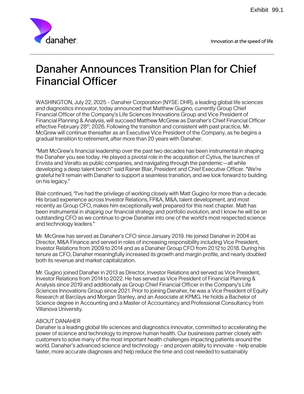Danaher Announces Transition Plan for Chief Financial Officer WASHINGTON, July 22, 2025 - Danaher Corporation (NYSE: DHR), a leading global life sciences and diagnostics innovator, today announced that Matthew Gugino, currently Group Chief Financial Officer of the Company’s Life Sciences Innovations Group and Vice President of Financial Planning & Analysis, will succeed Matthew McGrew as Danaher’s Chief Financial Officer effective February 28th, 2026. Following the transition and consistent with past practice, Mr. McGrew will continue thereafter as an Executive Vice President of the Company, as he begins a gradual transition to retirement, after more than 20 years with Danaher. “Matt McGrew’s financial leadership over the past two decades has been instrumental in shaping the Danaher you see today. He played a pivotal role in the acquisition of Cytiva, the launches of Envista and Veralto as public companies, and navigating through the pandemic—all while developing a deep talent bench” said Rainer Blair, President and Chief Executive Officer. “We’re grateful he’ll remain with Danaher to support a seamless transition, and we look forward to building on his legacy.” Blair continued, “I’ve had the privilege of working closely with Matt Gugino for more than a decade. His broad experience across Investor Relations, FP&A, M&A, talent development, and most recently as Group CFO, makes him exceptionally well prepared for this next chapter. Matt has been instrumental in shaping our financial strategy and portfolio evolution, and I know he will be an outstanding CFO as we continue to grow Danaher into one of the world’s most respected science and technology leaders.” Mr. McGrew has served as Danaher’s CFO since January 2019. He joined Danaher in 2004 as Director, M&A Finance and served in roles of increasing responsibility including Vice President, Investor Relations from 2009 to 2014 and as a Danaher Group CFO from 2012 to 2018. During his tenure as CFO, Danaher meaningfully increased its growth and margin profile, and nearly doubled both its revenue and market capitalization. Mr. Gugino joined Danaher in 2013 as Director, Investor Relations and served as Vice President, Investor Relations from 2014 to 2022. He has served as Vice President of Financial Planning & Analysis since 2019 and additionally as Group Chief Financial Officer in the Company’s Life Sciences Innovations Group since 2021. Prior to joining Danaher, he was a Vice President of Equity Research at Barclays and Morgan Stanley, and an Associate at KPMG. He holds a Bachelor of Science degree in Accounting and a Master of Accountancy and Professional Consultancy from Villanova University. ABOUT DANAHER Danaher is a leading global life sciences and diagnostics innovator, committed to accelerating the power of science and technology to improve human health. Our businesses partner closely with customers to solve many of the most important health challenges impacting patients around the world. Danaher's advanced science and technology - and proven ability to innovate - help enable faster, more accurate diagnoses and help reduce the time and cost needed to sustainably