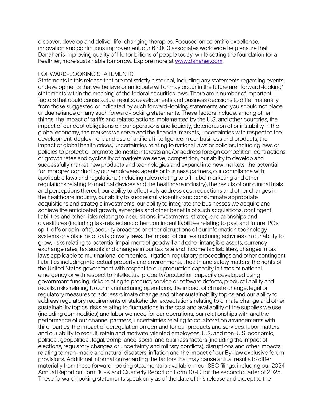 discover, develop and deliver life-changing therapies. Focused on scientific excellence, innovation and continuous improvement, our 63,000 associates worldwide help ensure that Danaher is improving quality of life for billions of people today, while setting the foundation for a healthier, more sustainable tomorrow. Explore more at www.danaher.com. FORWARD-LOOKING STATEMENTS Statements in this release that are not strictly historical, including any statements regarding events or developments that we believe or anticipate will or may occur in the future are "forward-looking" statements within the meaning of the federal securities laws. There are a number of important factors that could cause actual results, developments and business decisions to differ materially from those suggested or indicated by such forward-looking statements and you should not place undue reliance on any such forward-looking statements. These factors include, among other things: the impact of tariffs and related actions implemented by the U.S. and other countries, the impact of our debt obligations on our operations and liquidity, deterioration of or instability in the global economy, the markets we serve and the financial markets, uncertainties with respect to the development, deployment and use of artificial intelligence in our business and products, the impact of global health crises, uncertainties relating to national laws or policies, including laws or policies to protect or promote domestic interests and/or address foreign competition, contractions or growth rates and cyclicality of markets we serve, competition, our ability to develop and successfully market new products and technologies and expand into new markets, the potential for improper conduct by our employees, agents or business partners, our compliance with applicable laws and regulations (including rules relating to off-label marketing and other regulations relating to medical devices and the healthcare industry), the results of our clinical trials and perceptions thereof, our ability to effectively address cost reductions and other changes in the healthcare industry, our ability to successfully identify and consummate appropriate acquisitions and strategic investments, our ability to integrate the businesses we acquire and achieve the anticipated growth, synergies and other benefits of such acquisitions, contingent liabilities and other risks relating to acquisitions, investments, strategic relationships and divestitures (including tax-related and other contingent liabilities relating to past and future IPOs, split-offs or spin-offs), security breaches or other disruptions of our information technology systems or violations of data privacy laws, the impact of our restructuring activities on our ability to grow, risks relating to potential impairment of goodwill and other intangible assets, currency exchange rates, tax audits and changes in our tax rate and income tax liabilities, changes in tax laws applicable to multinational companies, litigation, regulatory proceedings and other contingent liabilities including intellectual property and environmental, health and safety matters, the rights of the United States government with respect to our production capacity in times of national emergency or with respect to intellectual property/production capacity developed using government funding, risks relating to product, service or software defects, product liability and recalls, risks relating to our manufacturing operations, the impact of climate change, legal or regulatory measures to address climate change and other sustainability topics and our ability to address regulatory requirements or stakeholder expectations relating to climate change and other sustainability topics, risks relating to fluctuations in the cost and availability of the supplies we use (including commodities) and labor we need for our operations, our relationships with and the performance of our channel partners, uncertainties relating to collaboration arrangements with third-parties, the impact of deregulation on demand for our products and services, labor matters and our ability to recruit, retain and motivate talented employees, U.S. and non-U.S. economic, political, geopolitical, legal, compliance, social and business factors (including the impact of elections, regulatory changes or uncertainty and military conflicts), disruptions and other impacts relating to man-made and natural disasters, inflation and the impact of our By-law exclusive forum provisions. Additional information regarding the factors that may cause actual results to differ materially from these forward-looking statements is available in our SEC filings, including our 2024 Annual Report on Form 10-K and Quarterly Report on Form 10-Q for the second quarter of 2025. These forward-looking statements speak only as of the date of this release and except to the