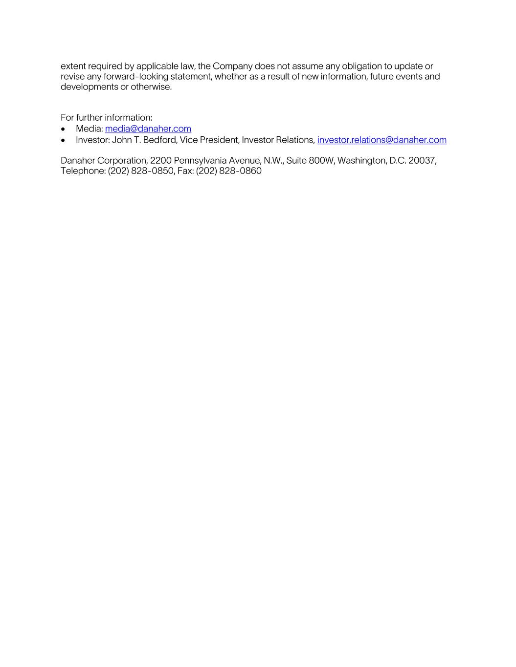 extent required by applicable law, the Company does not assume any obligation to update or revise any forward-looking statement, whether as a result of new information, future events and developments or otherwise. For further information: • Media: media@danaher.com • Investor: John T. Bedford, Vice President, Investor Relations, investor.relations@danaher.com Danaher Corporation, 2200 Pennsylvania Avenue, N.W., Suite 800W, Washington, D.C. 20037, Telephone: (202) 828-0850, Fax: (202) 828-0860