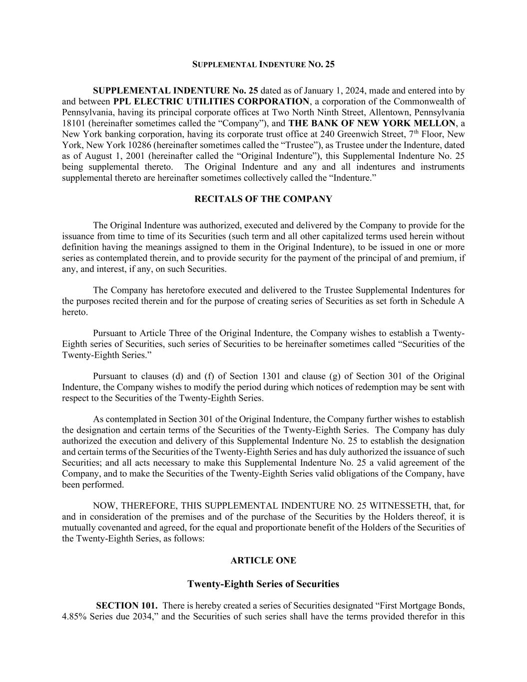SUPPLEMENTAL INDENTURE NO. 25 SUPPLEMENTAL INDENTURE No. 25 dated as of January 1, 2024, made and entered into by and between PPL ELECTRIC UTILITIES CORPORATION, a corporation of the Commonwealth of Pennsylvania, having its principal corporate offices at Two North Ninth Street, Allentown, Pennsylvania 18101 (hereinafter sometimes called the “Company”), and THE BANK OF NEW YORK MELLON, a New York banking corporation, having its corporate trust office at 240 Greenwich Street, 7th Floor, New York, New York 10286 (hereinafter sometimes called the “Trustee”), as Trustee under the Indenture, dated as of August 1, 2001 (hereinafter called the “Original Indenture”), this Supplemental Indenture No. 25 being supplemental thereto. The Original Indenture and any and all indentures and instruments supplemental thereto are hereinafter sometimes collectively called the “Indenture.” RECITALS OF THE COMPANY The Original Indenture was authorized, executed and delivered by the Company to provide for the issuance from time to time of its Securities (such term and all other capitalized terms used herein without definition having the meanings assigned to them in the Original Indenture), to be issued in one or more series as contemplated therein, and to provide security for the payment of the principal of and premium, if any, and interest, if any, on such Securities. The Company has heretofore executed and delivered to the Trustee Supplemental Indentures for the purposes recited therein and for the purpose of creating series of Securities as set forth in Schedule A hereto. Pursuant to Article Three of the Original Indenture, the Company wishes to establish a Twenty- Eighth series of Securities, such series of Securities to be hereinafter sometimes called “Securities of the Twenty-Eighth Series.” Pursuant to clauses (d) and (f) of Section 1301 and clause (g) of Section 301 of the Original Indenture, the Company wishes to modify the period during which notices of redemption may be sent with respect to the Securities of the Twenty-Eighth Series. As contemplated in Section 301 of the Original Indenture, the Company further wishes to establish the designation and certain terms of the Securities of the Twenty-Eighth Series. The Company has duly authorized the execution and delivery of this Supplemental Indenture No. 25 to establish the designation and certain terms of the Securities of the Twenty-Eighth Series and has duly authorized the issuance of such Securities; and all acts necessary to make this Supplemental Indenture No. 25 a valid agreement of the Company, and to make the Securities of the Twenty-Eighth Series valid obligations of the Company, have been performed. NOW, THEREFORE, THIS SUPPLEMENTAL INDENTURE NO. 25 WITNESSETH, that, for and in consideration of the premises and of the purchase of the Securities by the Holders thereof, it is mutually covenanted and agreed, for the equal and proportionate benefit of the Holders of the Securities of the Twenty-Eighth Series, as follows: ARTICLE ONE Twenty-Eighth Series of Securities SECTION 101. There is hereby created a series of Securities designated “First Mortgage Bonds, 4.85% Series due 2034,” and the Securities of such series shall have the terms provided therefor in this