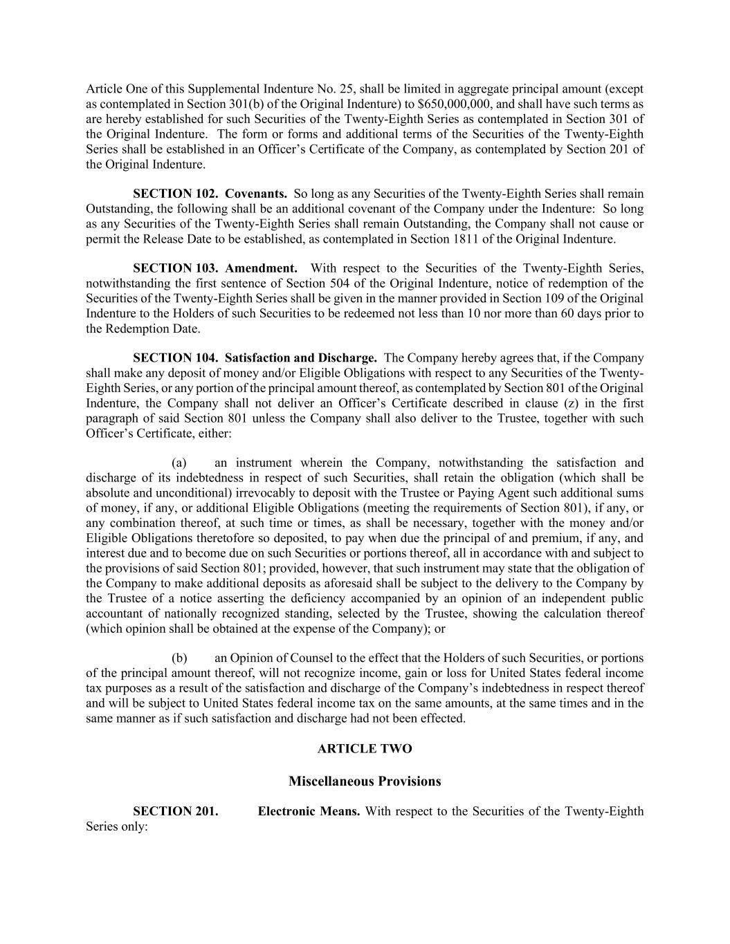 Article One of this Supplemental Indenture No. 25, shall be limited in aggregate principal amount (except as contemplated in Section 301(b) of the Original Indenture) to $650,000,000, and shall have such terms as are hereby established for such Securities of the Twenty-Eighth Series as contemplated in Section 301 of the Original Indenture. The form or forms and additional terms of the Securities of the Twenty-Eighth Series shall be established in an Officer’s Certificate of the Company, as contemplated by Section 201 of the Original Indenture. SECTION 102. Covenants. So long as any Securities of the Twenty-Eighth Series shall remain Outstanding, the following shall be an additional covenant of the Company under the Indenture: So long as any Securities of the Twenty-Eighth Series shall remain Outstanding, the Company shall not cause or permit the Release Date to be established, as contemplated in Section 1811 of the Original Indenture. SECTION 103. Amendment. With respect to the Securities of the Twenty-Eighth Series, notwithstanding the first sentence of Section 504 of the Original Indenture, notice of redemption of the Securities of the Twenty-Eighth Series shall be given in the manner provided in Section 109 of the Original Indenture to the Holders of such Securities to be redeemed not less than 10 nor more than 60 days prior to the Redemption Date. SECTION 104. Satisfaction and Discharge. The Company hereby agrees that, if the Company shall make any deposit of money and/or Eligible Obligations with respect to any Securities of the Twenty- Eighth Series, or any portion of the principal amount thereof, as contemplated by Section 801 of the Original Indenture, the Company shall not deliver an Officer’s Certificate described in clause (z) in the first paragraph of said Section 801 unless the Company shall also deliver to the Trustee, together with such Officer’s Certificate, either: (a) an instrument wherein the Company, notwithstanding the satisfaction and discharge of its indebtedness in respect of such Securities, shall retain the obligation (which shall be absolute and unconditional) irrevocably to deposit with the Trustee or Paying Agent such additional sums of money, if any, or additional Eligible Obligations (meeting the requirements of Section 801), if any, or any combination thereof, at such time or times, as shall be necessary, together with the money and/or Eligible Obligations theretofore so deposited, to pay when due the principal of and premium, if any, and interest due and to become due on such Securities or portions thereof, all in accordance with and subject to the provisions of said Section 801; provided, however, that such instrument may state that the obligation of the Company to make additional deposits as aforesaid shall be subject to the delivery to the Company by the Trustee of a notice asserting the deficiency accompanied by an opinion of an independent public accountant of nationally recognized standing, selected by the Trustee, showing the calculation thereof (which opinion shall be obtained at the expense of the Company); or (b) an Opinion of Counsel to the effect that the Holders of such Securities, or portions of the principal amount thereof, will not recognize income, gain or loss for United States federal income tax purposes as a result of the satisfaction and discharge of the Company’s indebtedness in respect thereof and will be subject to United States federal income tax on the same amounts, at the same times and in the same manner as if such satisfaction and discharge had not been effected. ARTICLE TWO Miscellaneous Provisions SECTION 201. Electronic Means. With respect to the Securities of the Twenty-Eighth Series only: