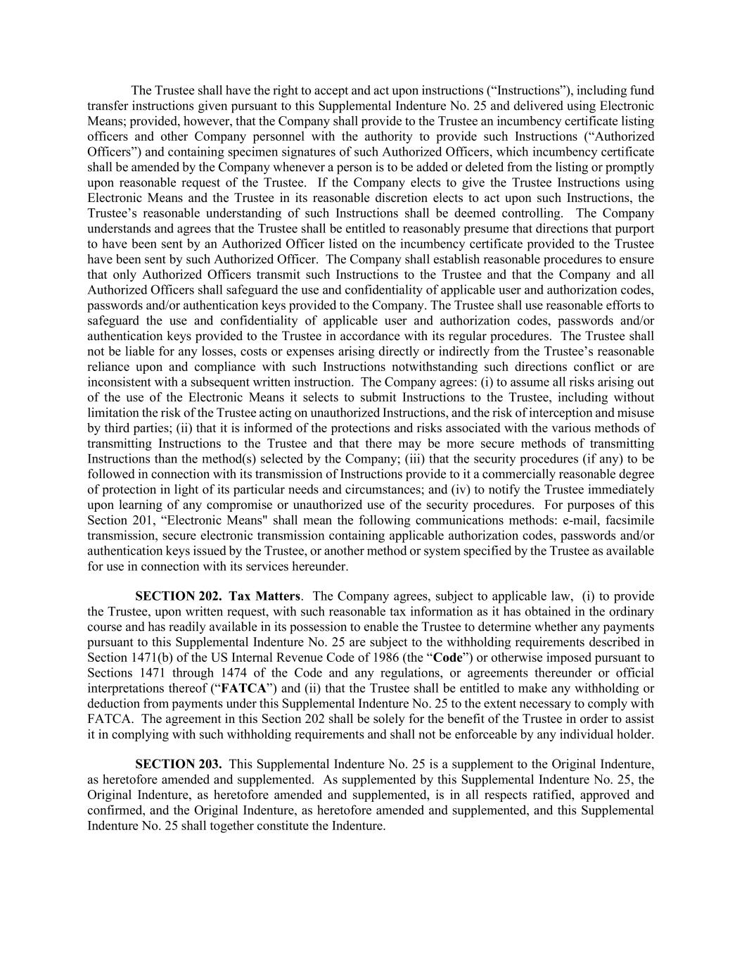 The Trustee shall have the right to accept and act upon instructions (“Instructions”), including fund transfer instructions given pursuant to this Supplemental Indenture No. 25 and delivered using Electronic Means; provided, however, that the Company shall provide to the Trustee an incumbency certificate listing officers and other Company personnel with the authority to provide such Instructions (“Authorized Officers”) and containing specimen signatures of such Authorized Officers, which incumbency certificate shall be amended by the Company whenever a person is to be added or deleted from the listing or promptly upon reasonable request of the Trustee. If the Company elects to give the Trustee Instructions using Electronic Means and the Trustee in its reasonable discretion elects to act upon such Instructions, the Trustee’s reasonable understanding of such Instructions shall be deemed controlling. The Company understands and agrees that the Trustee shall be entitled to reasonably presume that directions that purport to have been sent by an Authorized Officer listed on the incumbency certificate provided to the Trustee have been sent by such Authorized Officer. The Company shall establish reasonable procedures to ensure that only Authorized Officers transmit such Instructions to the Trustee and that the Company and all Authorized Officers shall safeguard the use and confidentiality of applicable user and authorization codes, passwords and/or authentication keys provided to the Company. The Trustee shall use reasonable efforts to safeguard the use and confidentiality of applicable user and authorization codes, passwords and/or authentication keys provided to the Trustee in accordance with its regular procedures. The Trustee shall not be liable for any losses, costs or expenses arising directly or indirectly from the Trustee’s reasonable reliance upon and compliance with such Instructions notwithstanding such directions conflict or are inconsistent with a subsequent written instruction. The Company agrees: (i) to assume all risks arising out of the use of the Electronic Means it selects to submit Instructions to the Trustee, including without limitation the risk of the Trustee acting on unauthorized Instructions, and the risk of interception and misuse by third parties; (ii) that it is informed of the protections and risks associated with the various methods of transmitting Instructions to the Trustee and that there may be more secure methods of transmitting Instructions than the method(s) selected by the Company; (iii) that the security procedures (if any) to be followed in connection with its transmission of Instructions provide to it a commercially reasonable degree of protection in light of its particular needs and circumstances; and (iv) to notify the Trustee immediately upon learning of any compromise or unauthorized use of the security procedures. For purposes of this Section 201, “Electronic Means" shall mean the following communications methods: e-mail, facsimile transmission, secure electronic transmission containing applicable authorization codes, passwords and/or authentication keys issued by the Trustee, or another method or system specified by the Trustee as available for use in connection with its services hereunder. SECTION 202. Tax Matters. The Company agrees, subject to applicable law, (i) to provide the Trustee, upon written request, with such reasonable tax information as it has obtained in the ordinary course and has readily available in its possession to enable the Trustee to determine whether any payments pursuant to this Supplemental Indenture No. 25 are subject to the withholding requirements described in Section 1471(b) of the US Internal Revenue Code of 1986 (the “Code”) or otherwise imposed pursuant to Sections 1471 through 1474 of the Code and any regulations, or agreements thereunder or official interpretations thereof (“FATCA”) and (ii) that the Trustee shall be entitled to make any withholding or deduction from payments under this Supplemental Indenture No. 25 to the extent necessary to comply with FATCA. The agreement in this Section 202 shall be solely for the benefit of the Trustee in order to assist it in complying with such withholding requirements and shall not be enforceable by any individual holder. SECTION 203. This Supplemental Indenture No. 25 is a supplement to the Original Indenture, as heretofore amended and supplemented. As supplemented by this Supplemental Indenture No. 25, the Original Indenture, as heretofore amended and supplemented, is in all respects ratified, approved and confirmed, and the Original Indenture, as heretofore amended and supplemented, and this Supplemental Indenture No. 25 shall together constitute the Indenture.