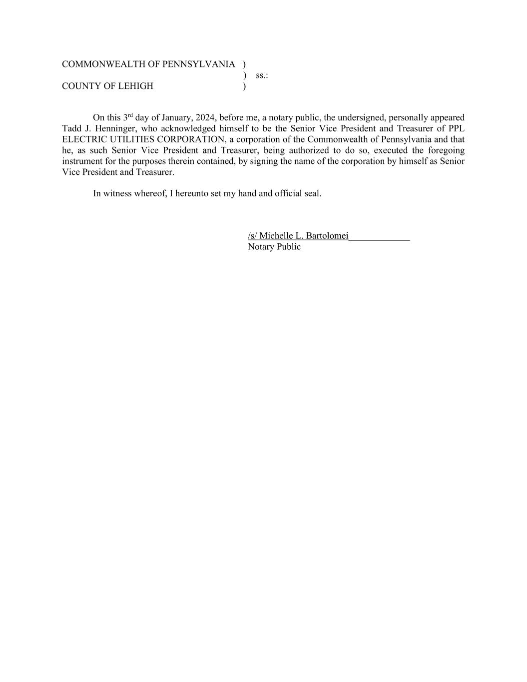 COMMONWEALTH OF PENNSYLVANIA ) ) ss.: COUNTY OF LEHIGH ) On this 3rd day of January, 2024, before me, a notary public, the undersigned, personally appeared Tadd J. Henninger, who acknowledged himself to be the Senior Vice President and Treasurer of PPL ELECTRIC UTILITIES CORPORATION, a corporation of the Commonwealth of Pennsylvania and that he, as such Senior Vice President and Treasurer, being authorized to do so, executed the foregoing instrument for the purposes therein contained, by signing the name of the corporation by himself as Senior Vice President and Treasurer. In witness whereof, I hereunto set my hand and official seal. /s/ Michelle L. Bartolomei_____________ Notary Public